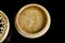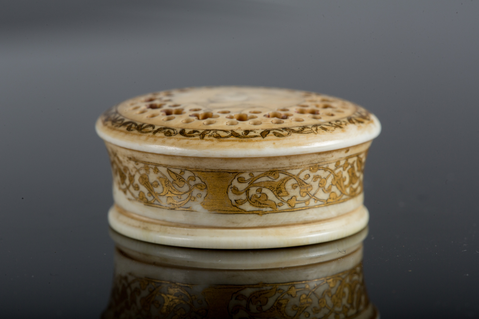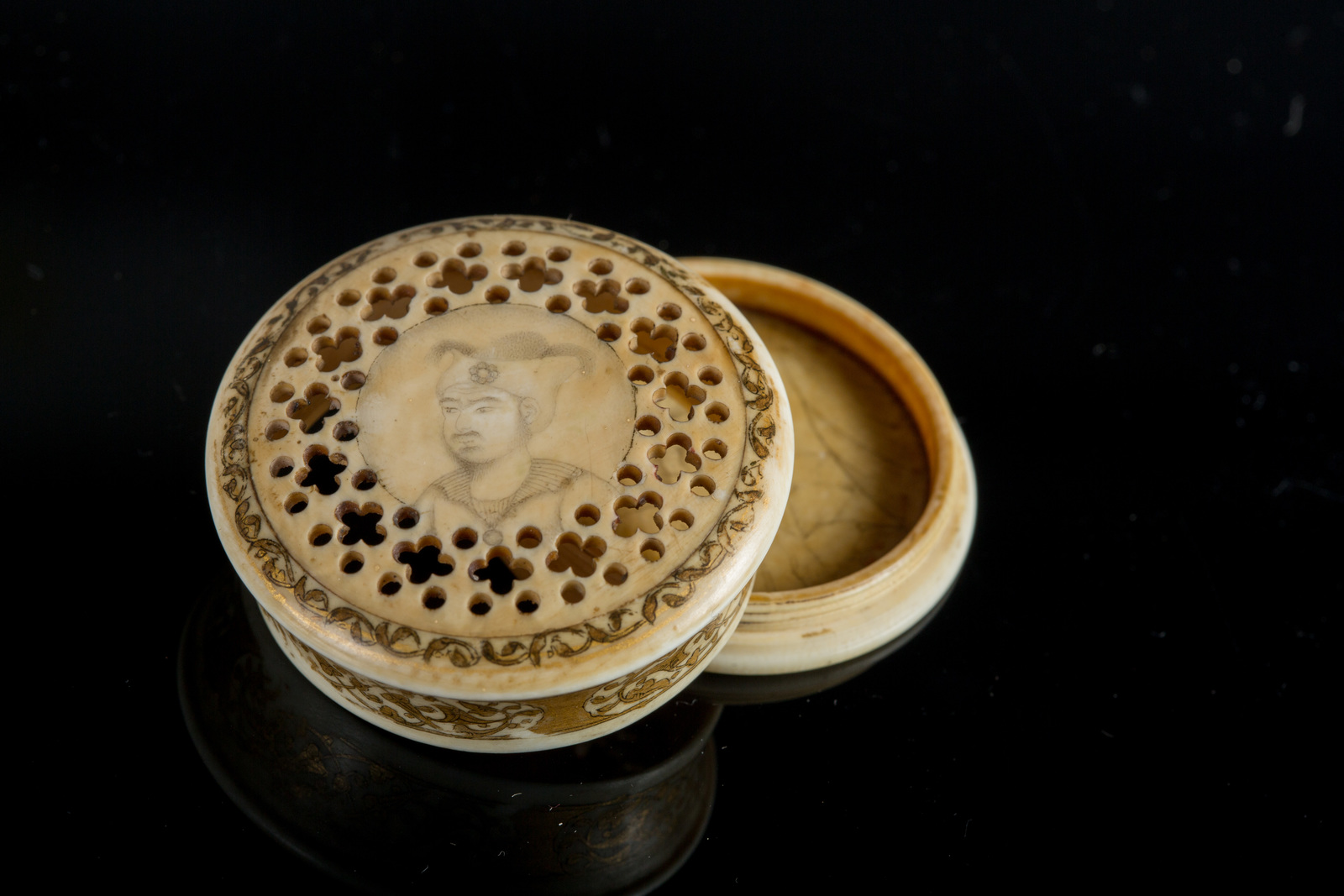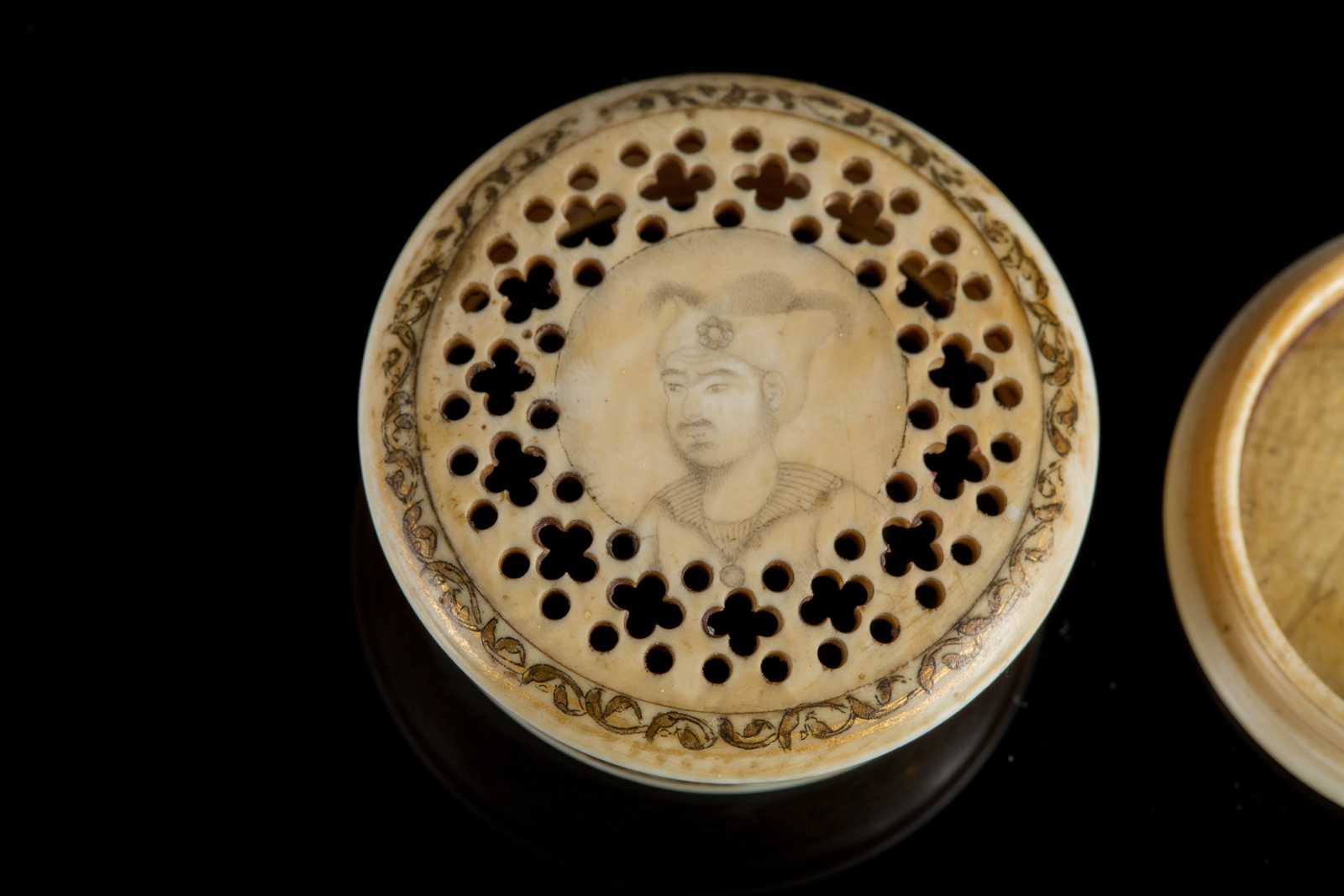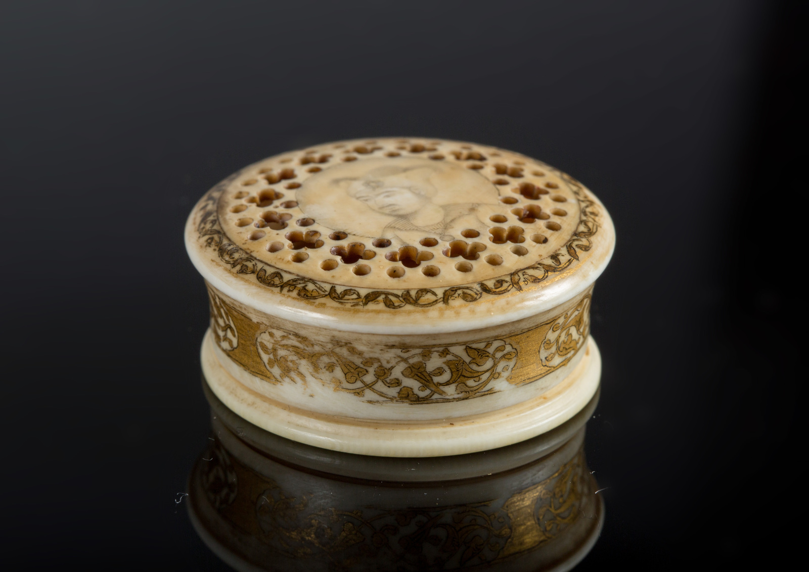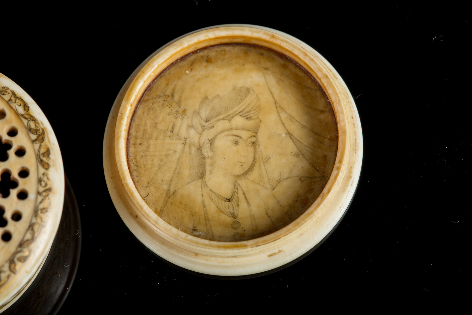Iran, periodo Zand, tardo XVIII - inizio XIX secolo . -. Cm 4,00 x 1,50. Di forma circolare, il coperchio mostra un delicato ritratto maschile circondato da motivi vegetali stilizzati lavorati a traforo; l'interno reca un ritratto di donna, anch'esso di forte ascendenza safavide nella resa miniaturistica, in un contesto caratterizzato da un piccolo edificio in prospettiva sulla sinistra. Le pareti esterne e la fascia marginale del coperchio sono dipinte con arabeschi intrecciati dorati.