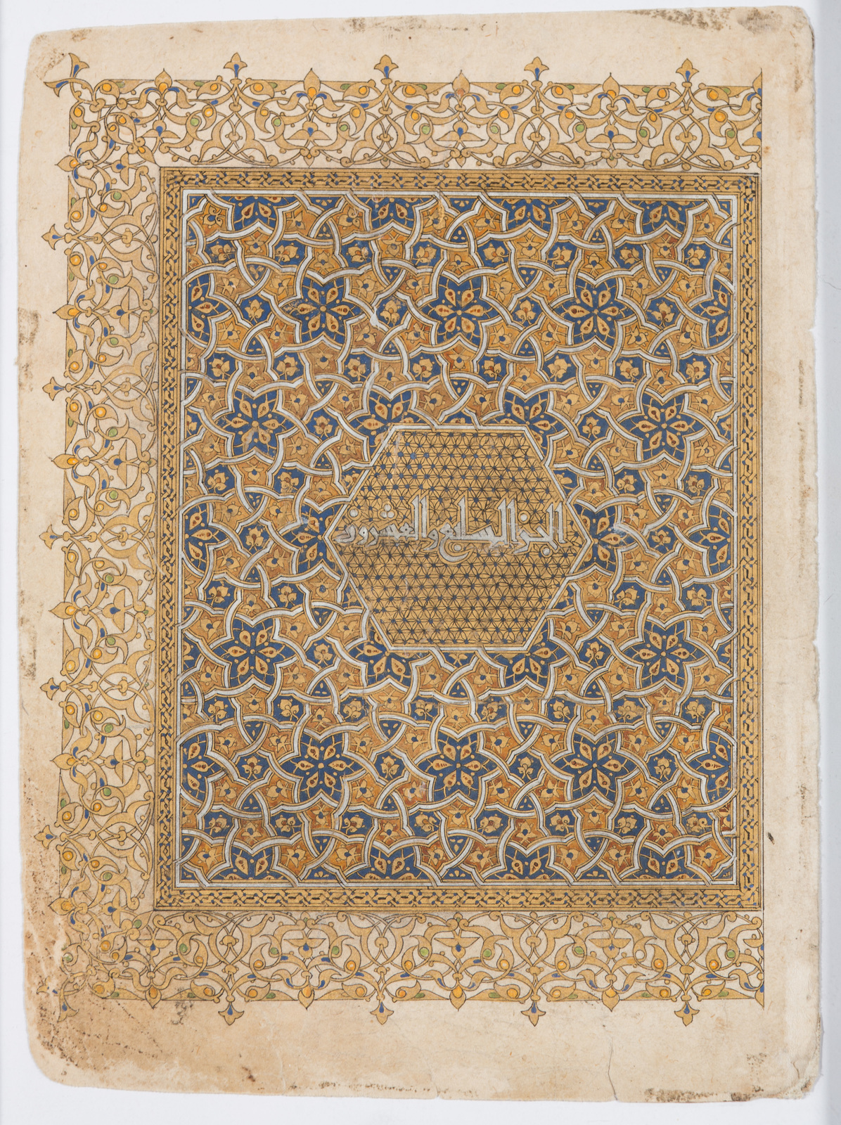 . -. Cm 18,00 x 25,00. Entro una cornice di arabeschi dorati si apre una riserva rettangolare contenente fitti elementi geometrici intrecciati a formare dei grandi motivi a stella blu con profili in rosso e piccole stelle blu e dorate. In posizione centrale un esagono contenente un'iscrizione in cufico su sfondo dorato.