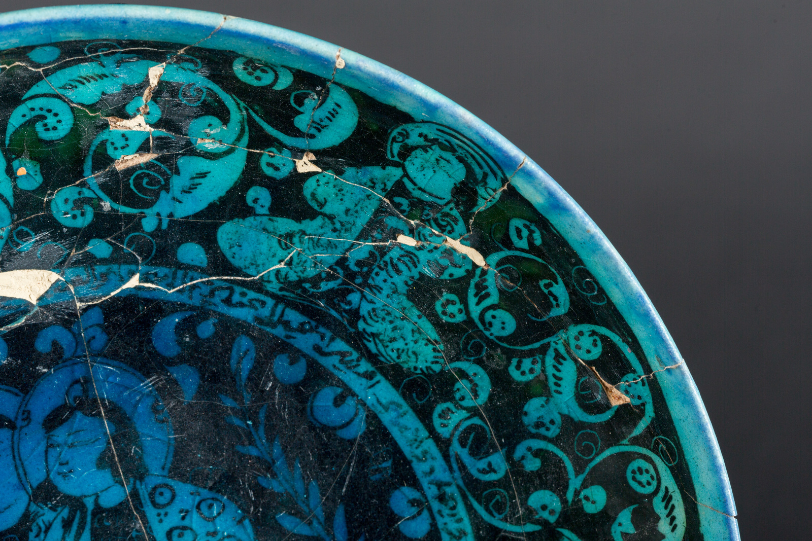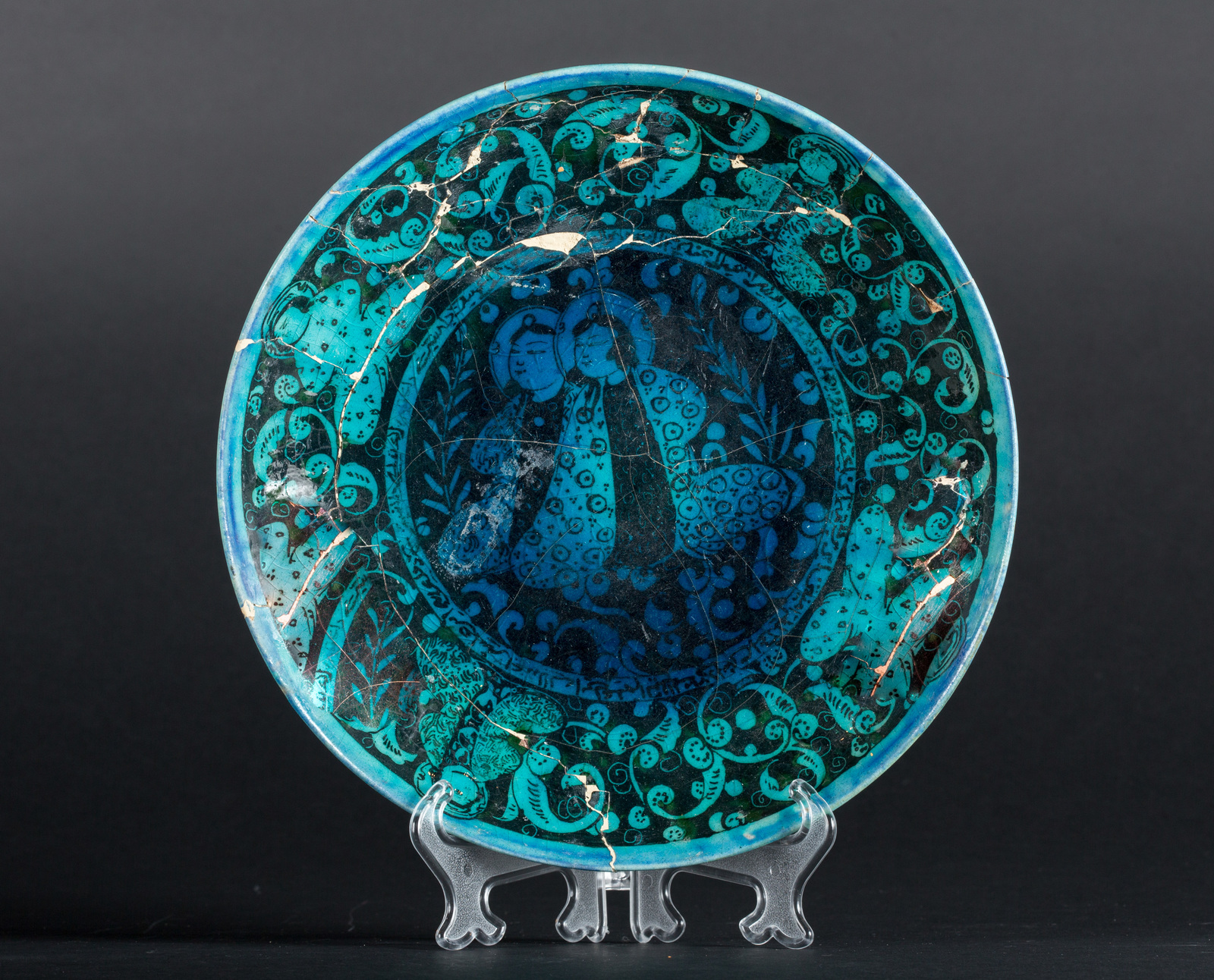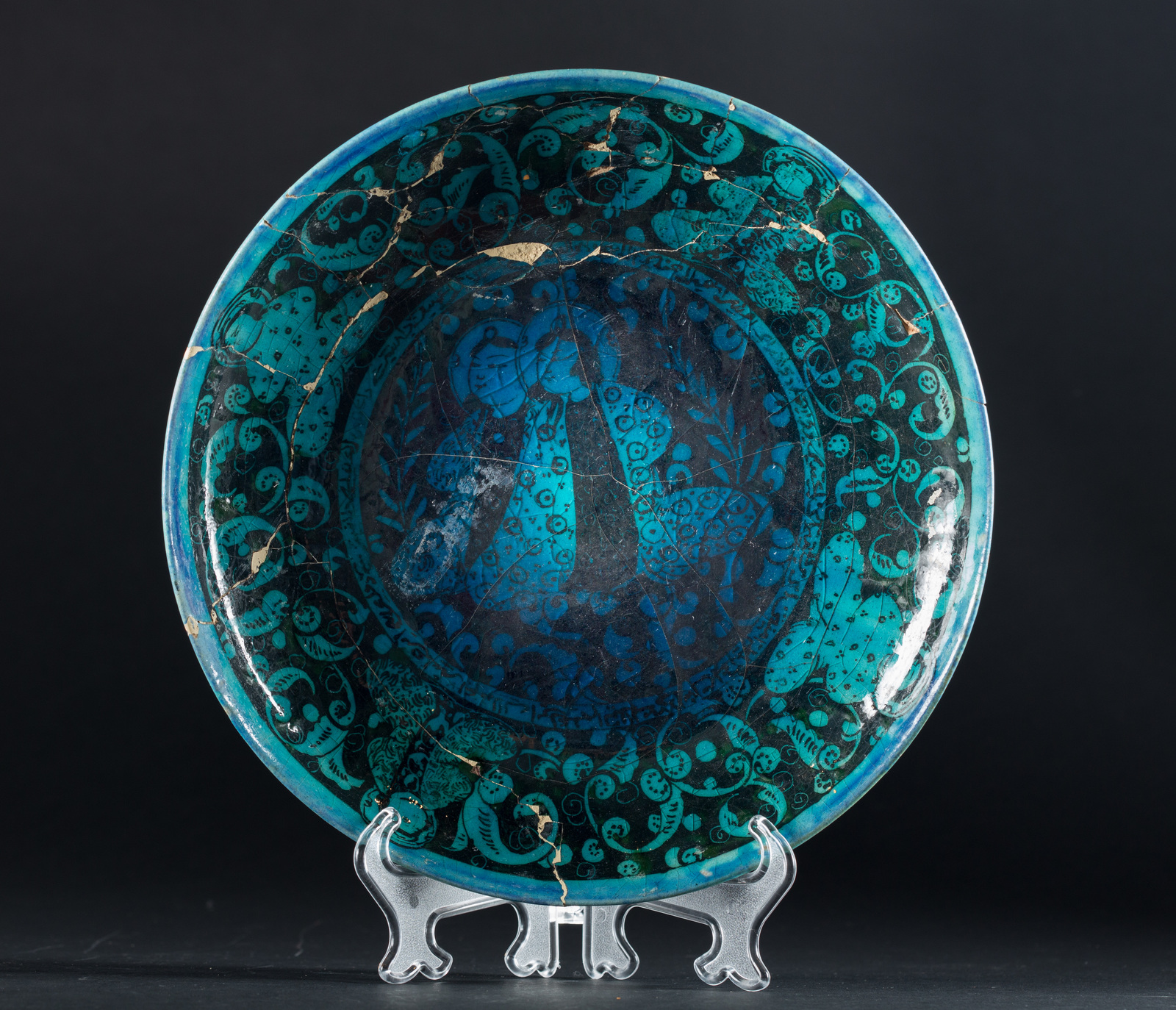 . -. Cm 29,50 x 6,50. Poggiante su disco, l'interno mostra fascia marginale con decorazione istoriata in riserva su nero con raffigurazione di personaggi separati da arabeschi. Il tondo centrale, delimitato da una lunga iscrizione dipinta, potrebbe essere un'aggiunta posteriore e mostra una coppia su fondo scuro con fiori in riserva. L'esterno mostra una decorazione a pannelli contenenti motivi vegetali stilizzati. Restauri.