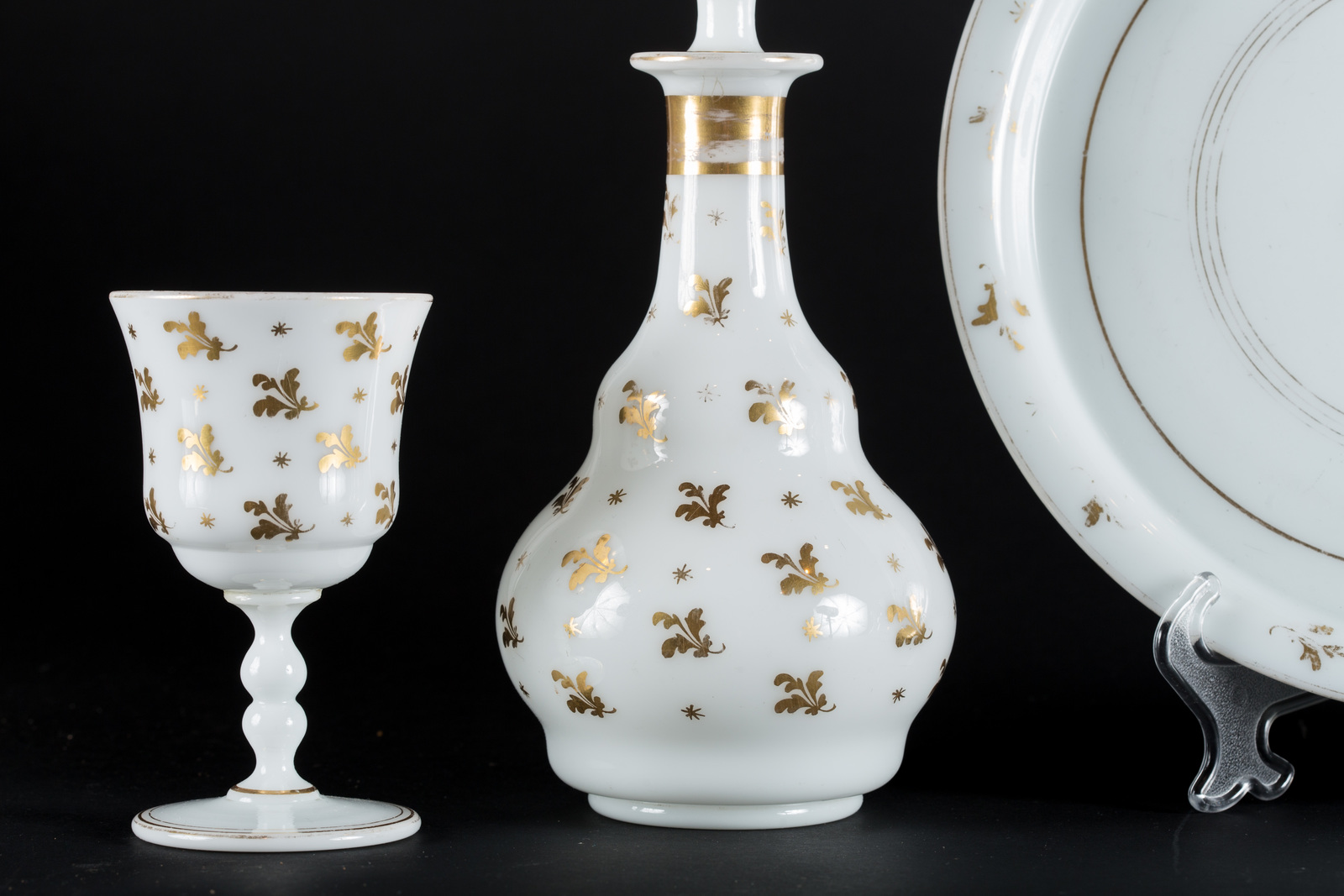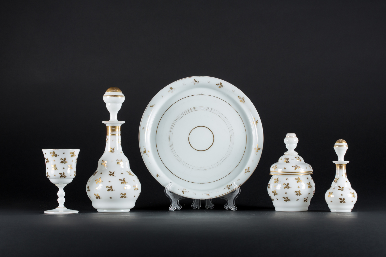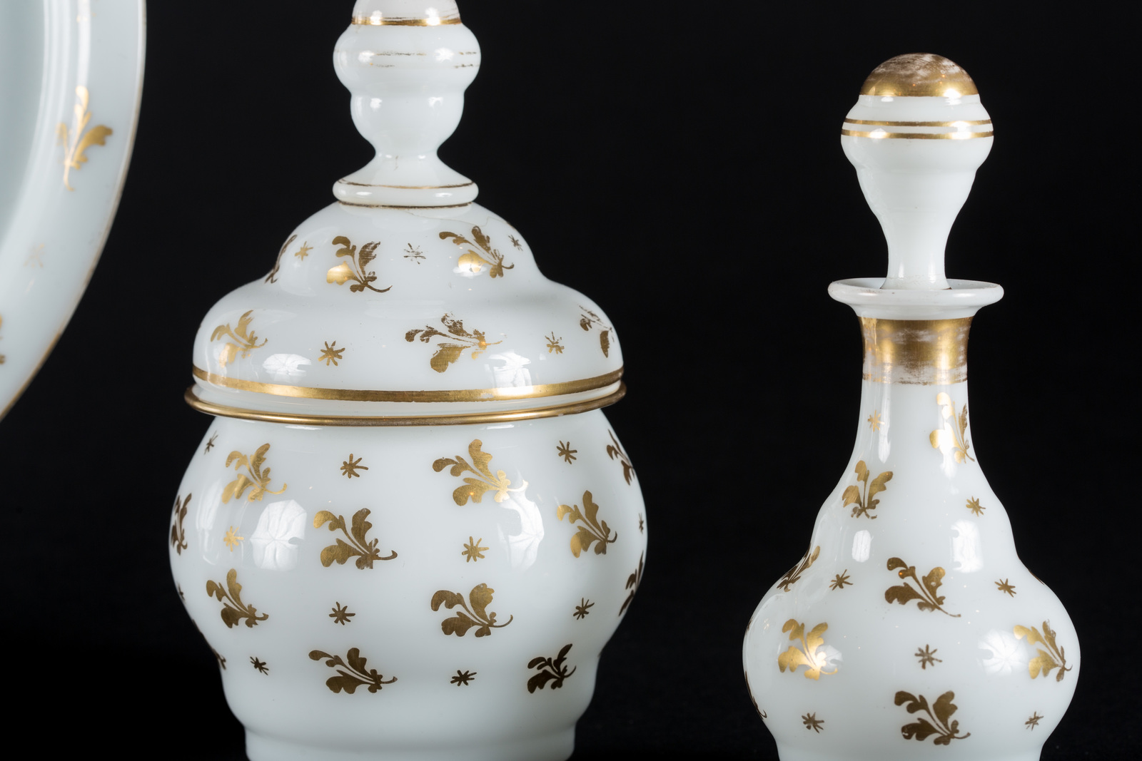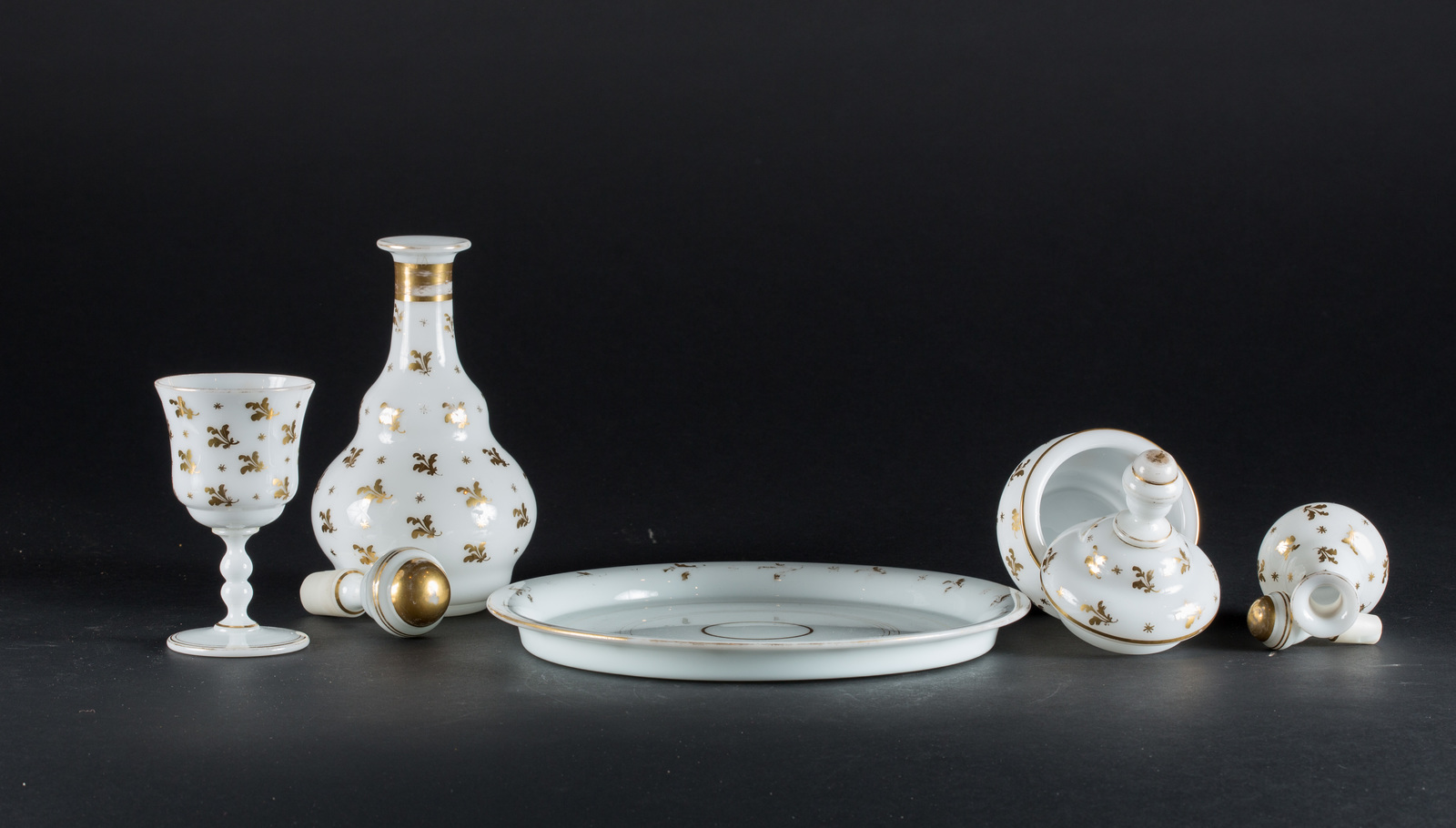 ARTE ISLAMICA A Beykoz white opaline glass night set with gilded floral decoration