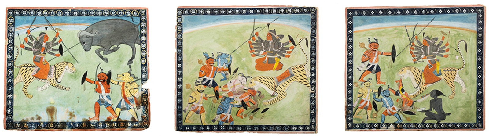 Arte Indiana Three pahari miniatures depicting scenes from the Devi Mahatmya