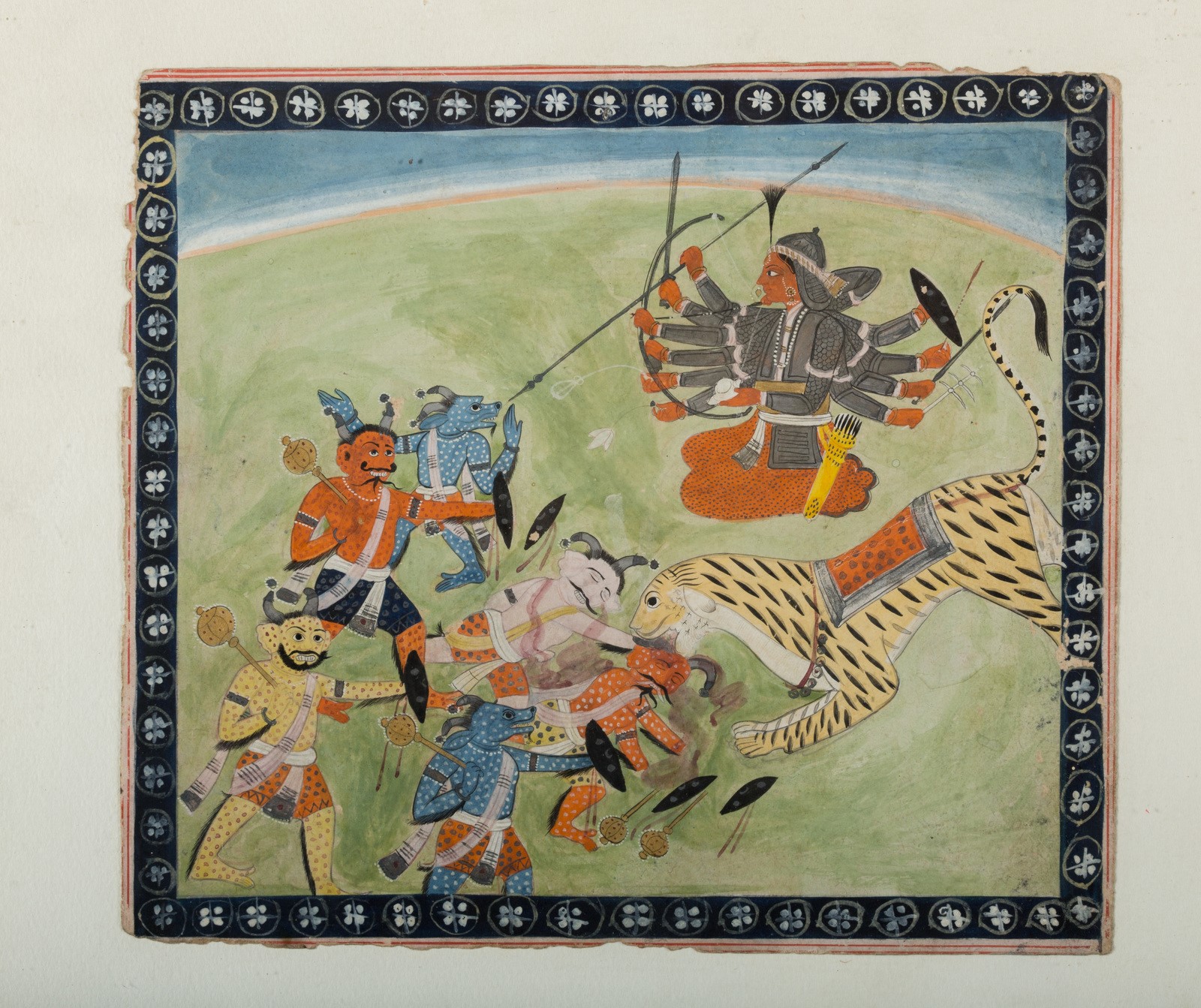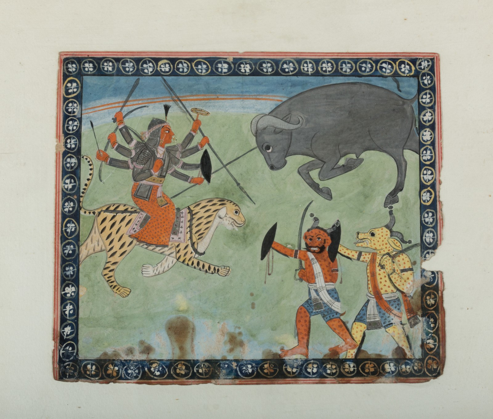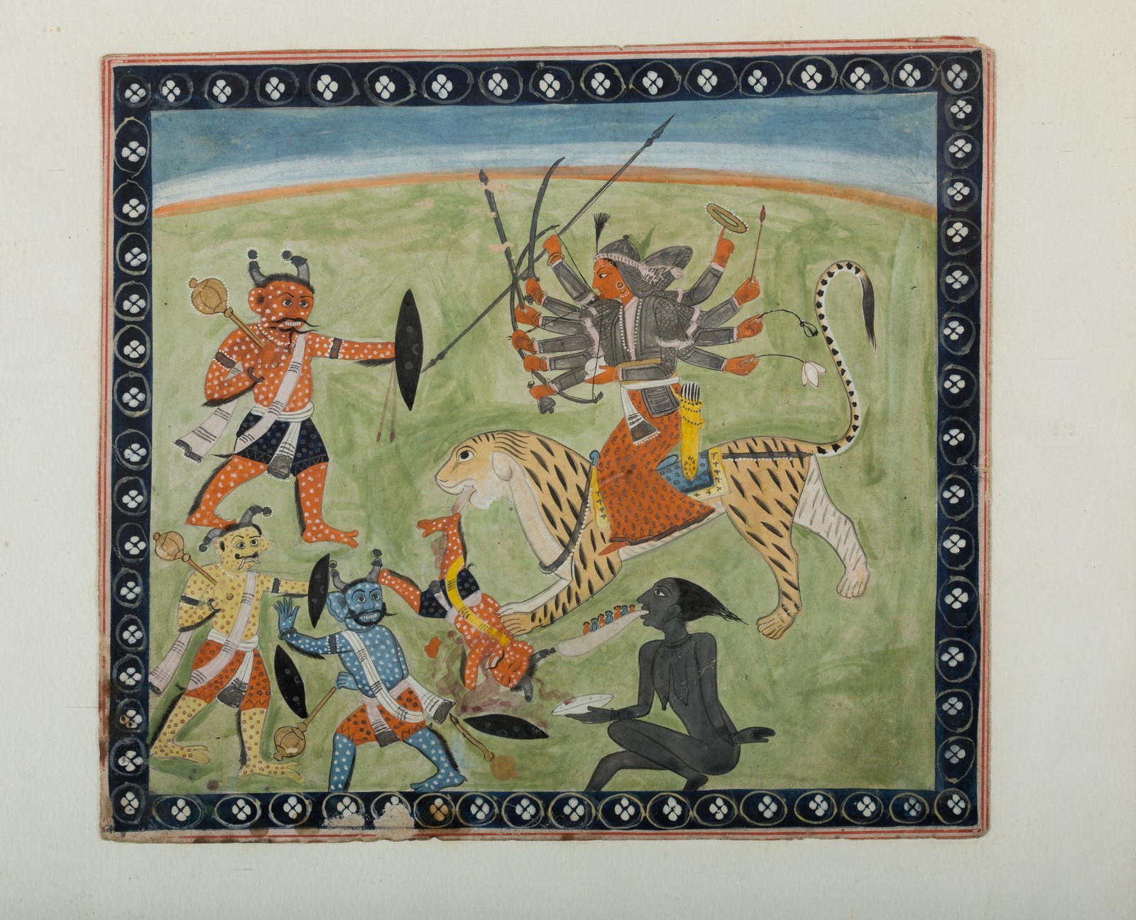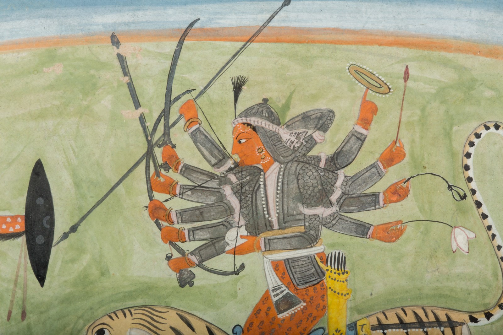 India, Pahari, metà XIX secolo . -. Cm 18,00 x 16,00. Sicuramente parte di una serie più ampia raffigurante le azioni più celebri della divinità; un dipinto mostra Durga che uccide il demone bufalo (Mahishasura Mardini); uno raffigura Kali che interviene in vece di Durga per uccidere il demone Raktavija e la terza raffigura un combattimento contro un demone non meglio identificato.