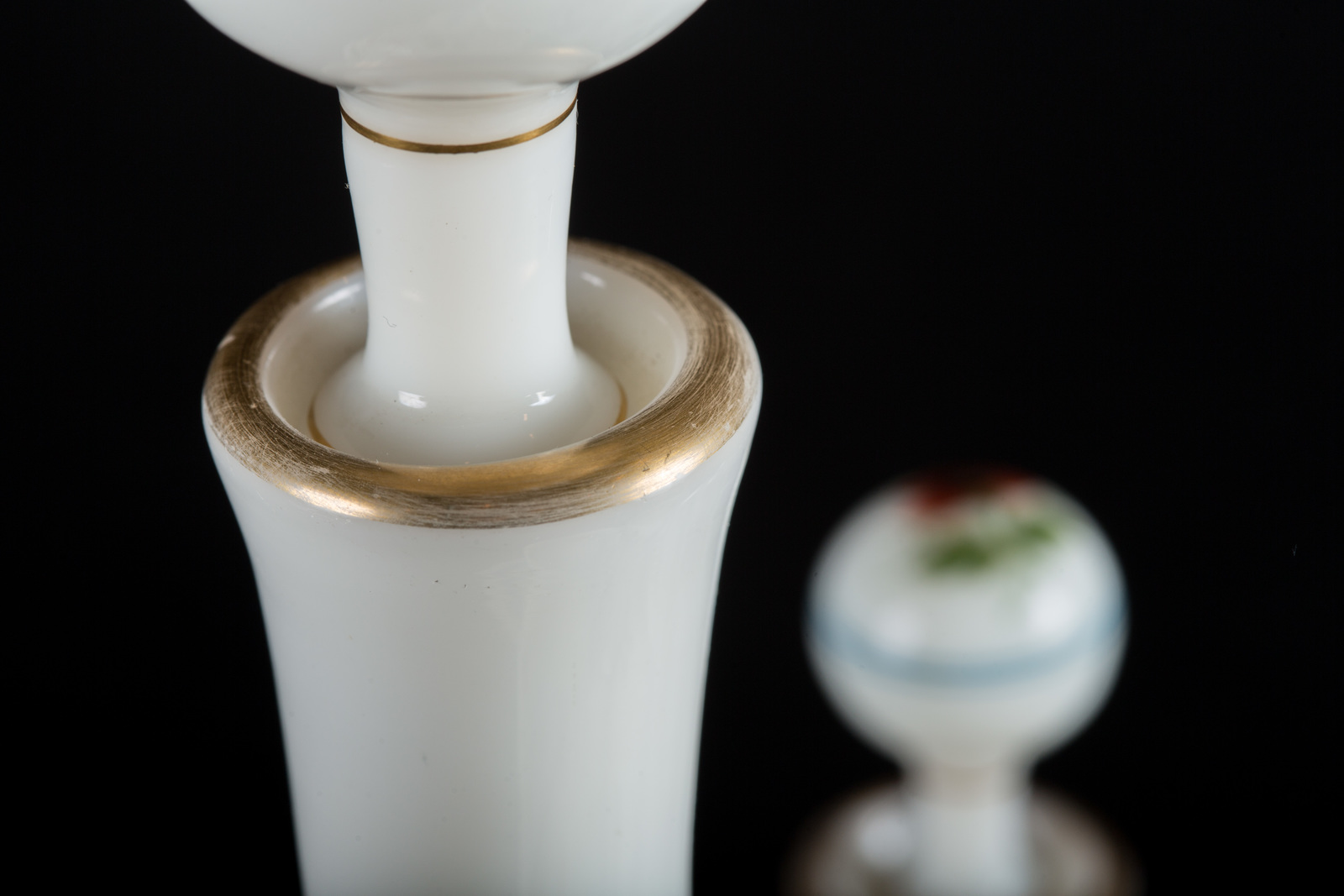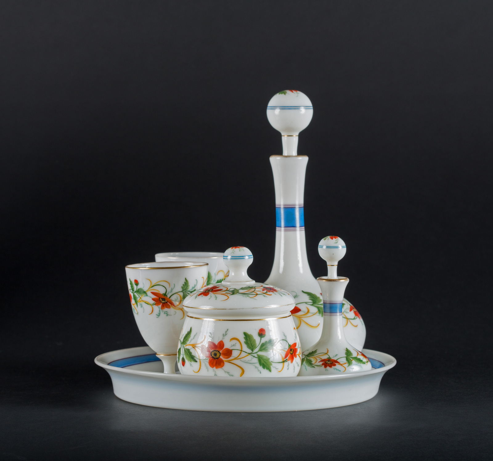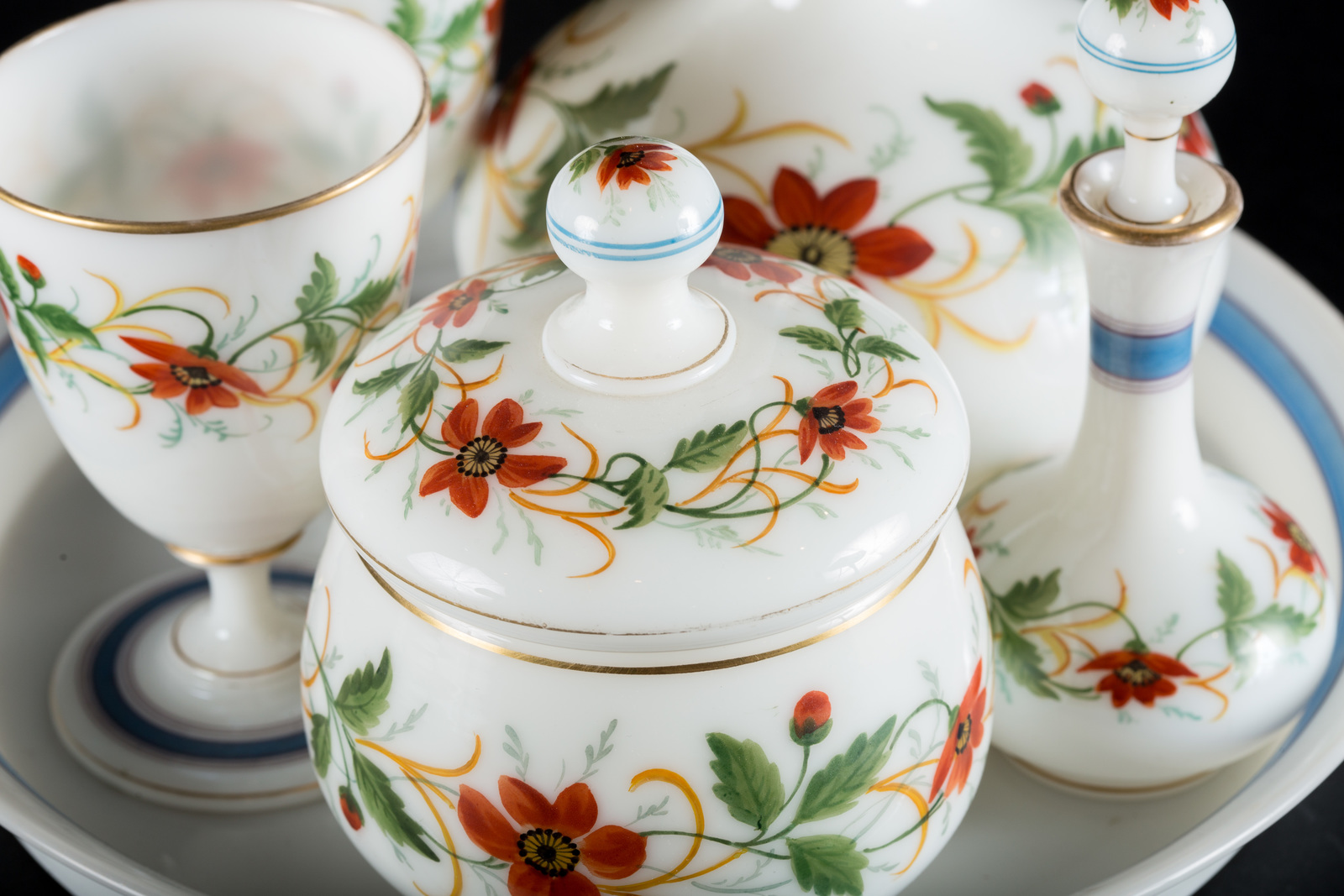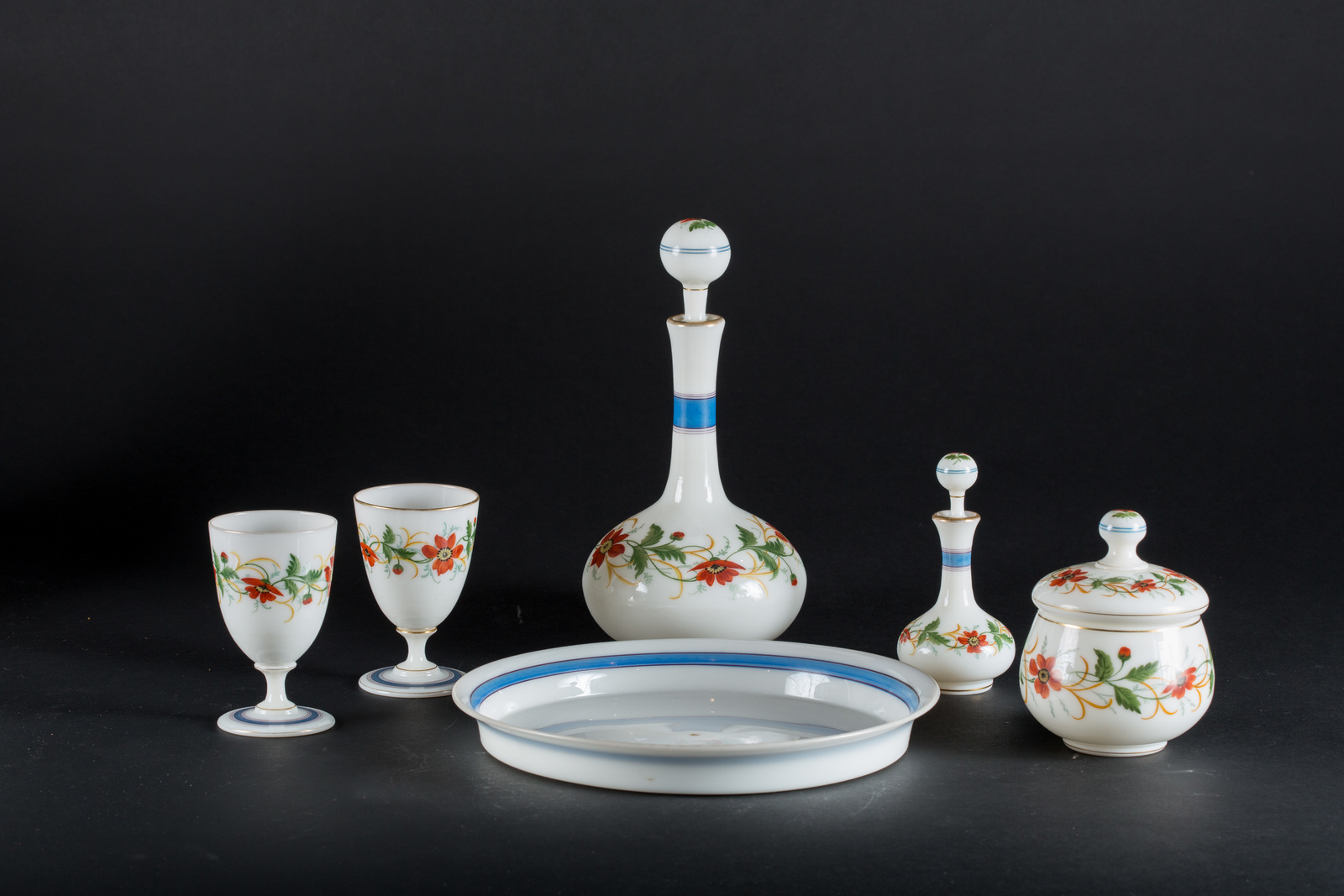 ARTE ISLAMICA A Beykoz white opaline glass night set enameled with red flowers