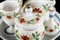 Turchia, Beykoz, periodo Ottomano, XIX secolo . -. Cm 26,00. Set composto da un vassoio (diam. 26 cm), due bicchieri (h.11 cm), due bottiglie con tappo (h. 26 e 14 cm) ed un vaso con tappo (h.13,5 cm); tutti smaltati con fiori rossi, foglie, fascia blu ripresa sul vassoio e bordi dorati.