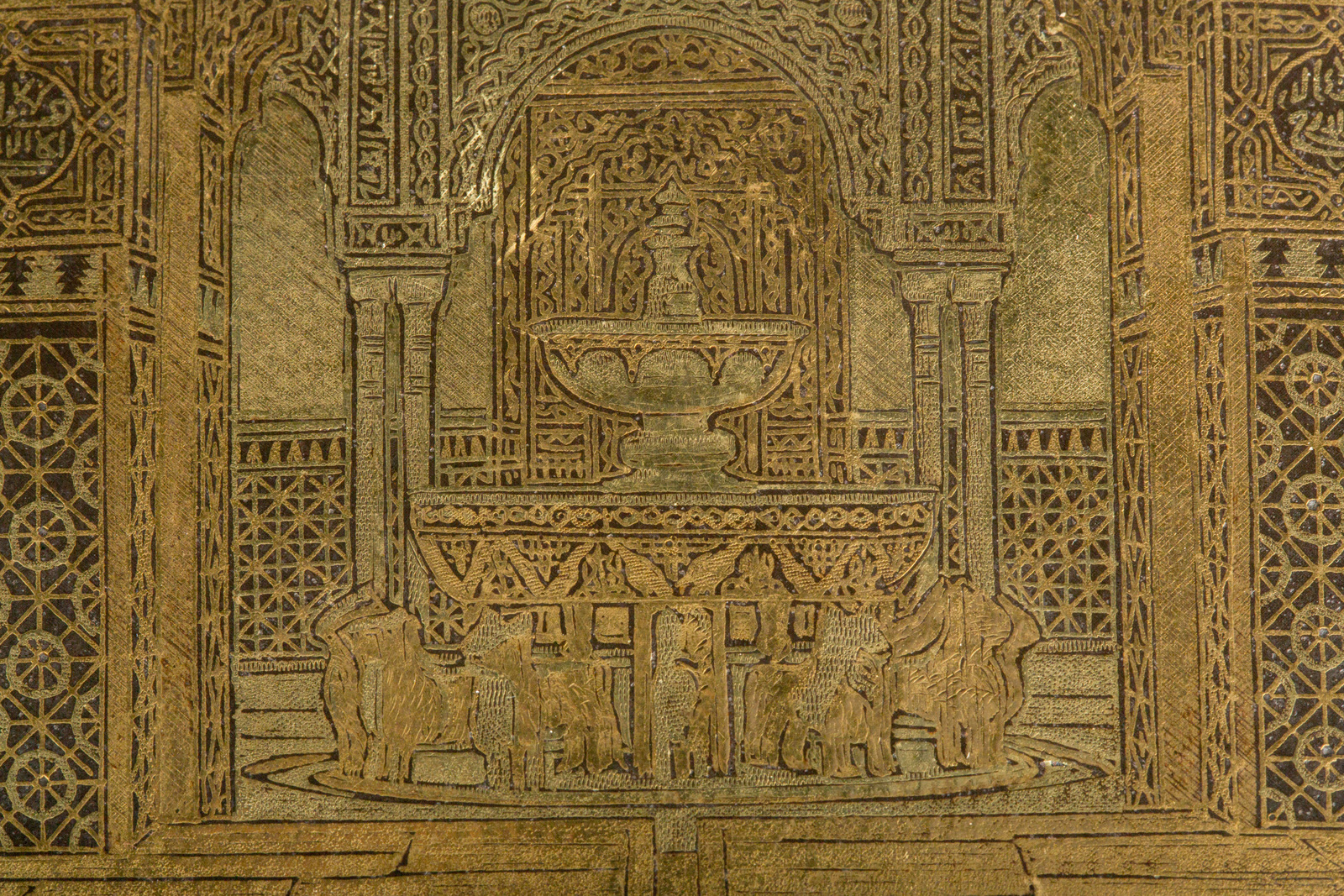 Spagna, probabilmente Toledo, XIX secolo . -. Cm 8,50 x 12,00. Finemente inciso con una scena prospettica, quasi fotografica, del patio dei Leoni dell'Alhambra sul fronte ed un dettaglio degli stucchi del palazzo sul retro.