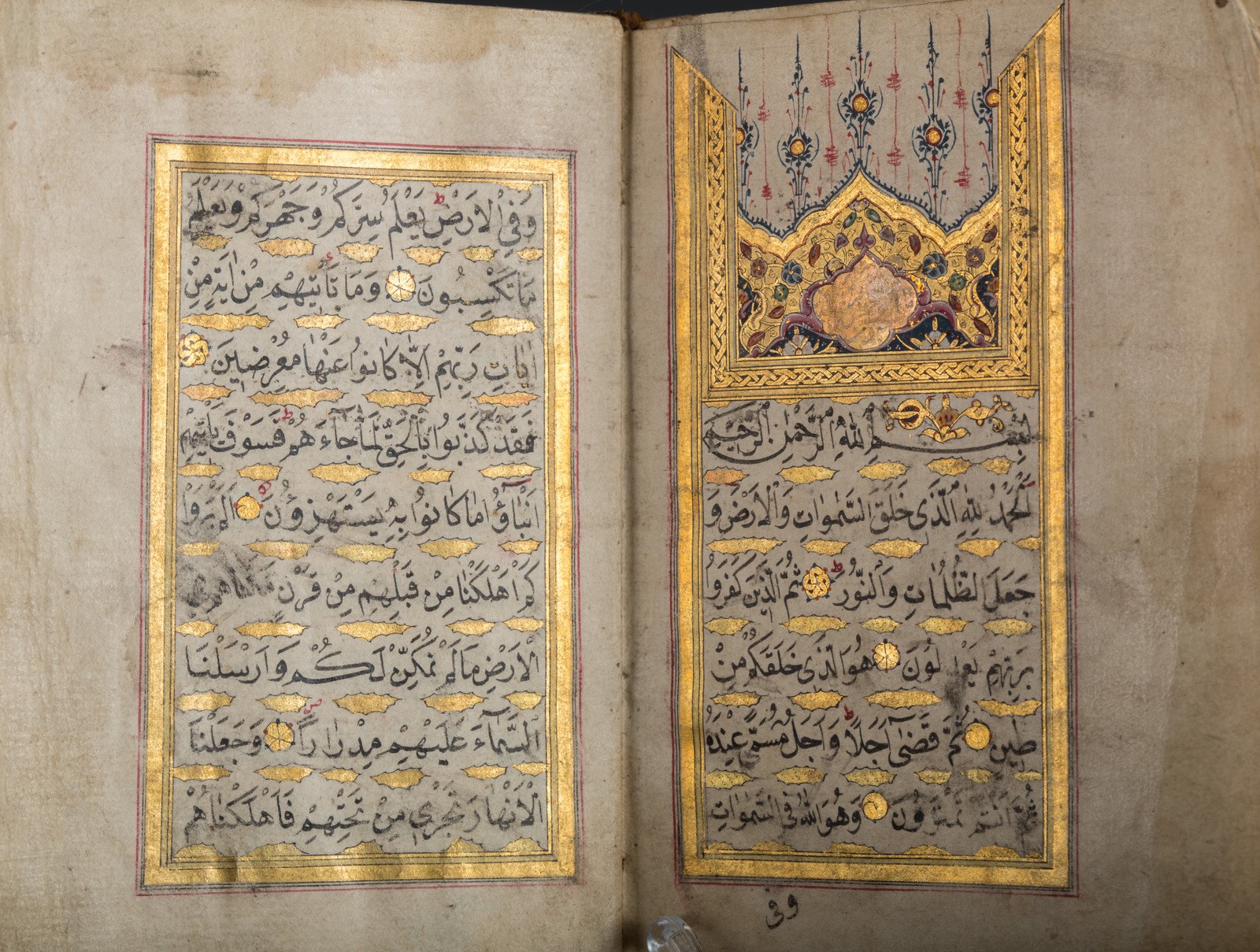 Turchia, dinastia Ottomana, datato 1226 (1811 AD). -. Cm 12,50. Composto da 112 carte, ognuna delimitata da filetto dorato e contenente 9 righe di testo Naskhi scritto in arabo con inchiostro nero su colonna singola con indicatori testuali dorati. Frontespizio illuminato e dorato.
