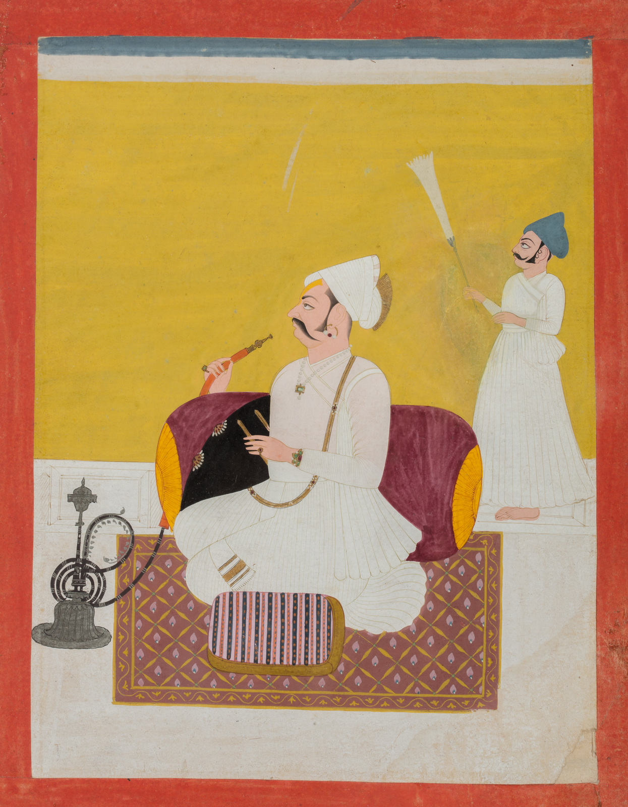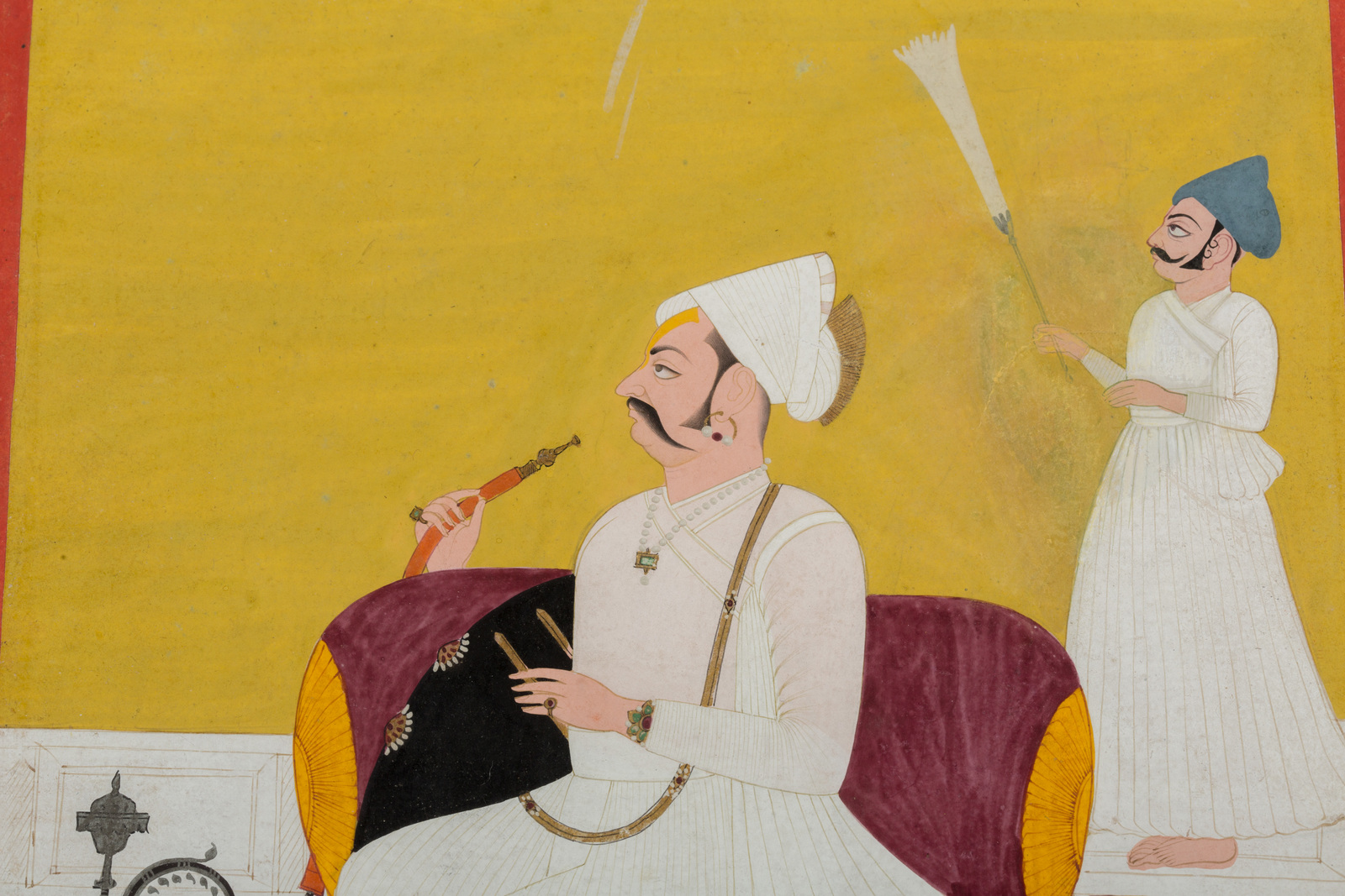 Arte Indiana A miniature painting depicting a noble man smoking huqqa