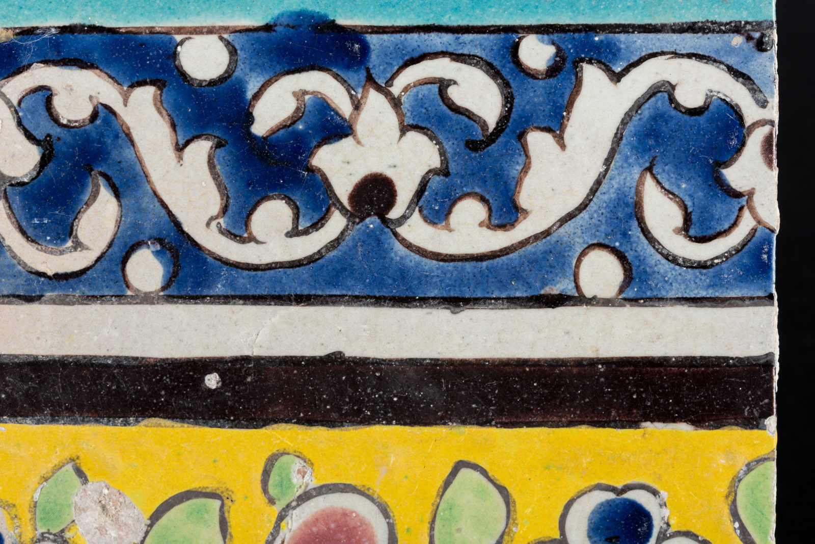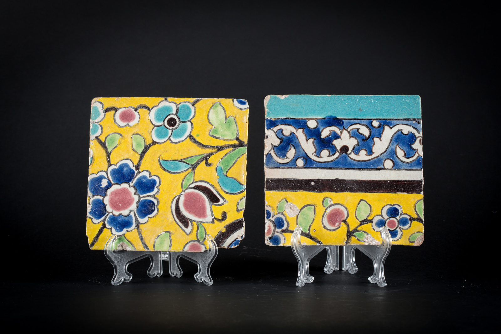 Arte Islamica Coppia di mattonelle cuerda seca su fondo giallo Iran, periodo...
