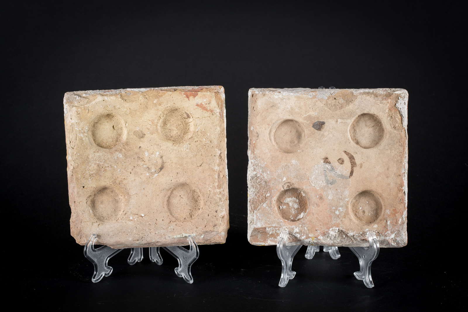 Iran, periodo safavide, XVII secolo . -. Cm 19,00 x 2,00. Di forma rettangolare, entrambe decorate con fiori di diversa natura con il bordo inciso e riempito di isolante per evitare la fuoriuscita del colore durante la cottura. Una delle due era posta in sezione marginale poiché presenta un caratteristico bordo di arabeschi bianchi su sfondo blu.