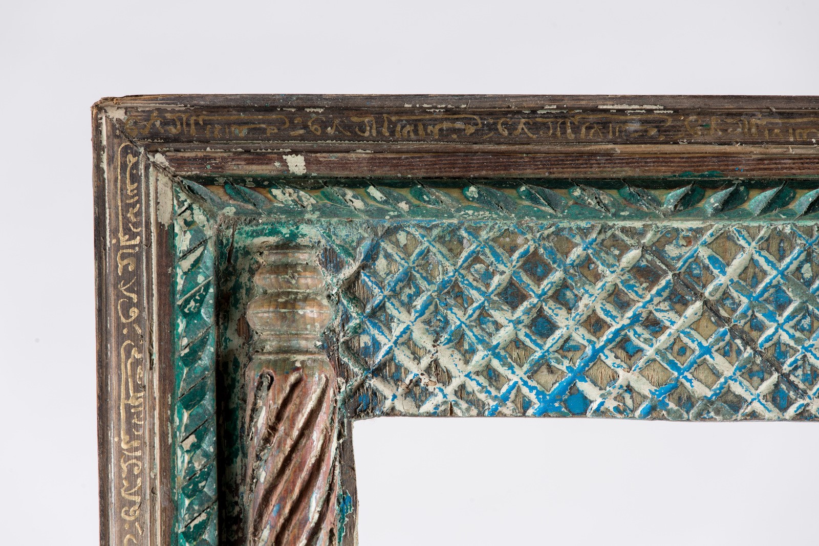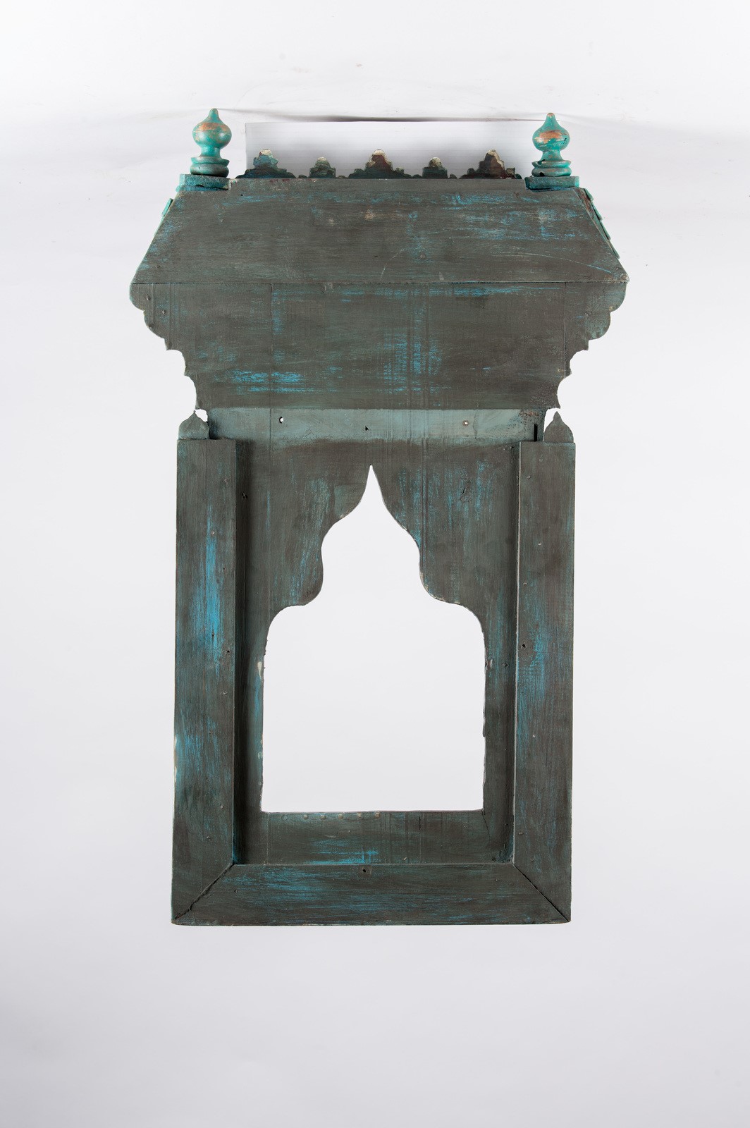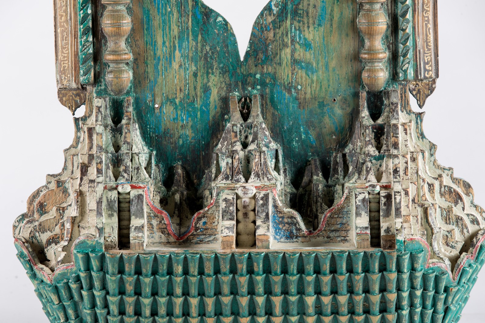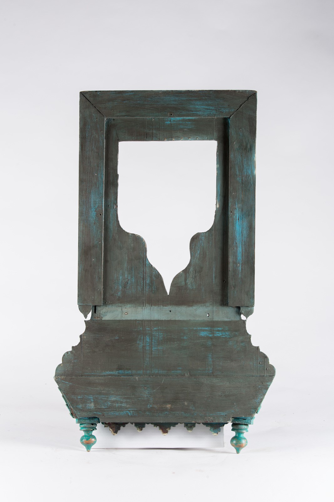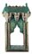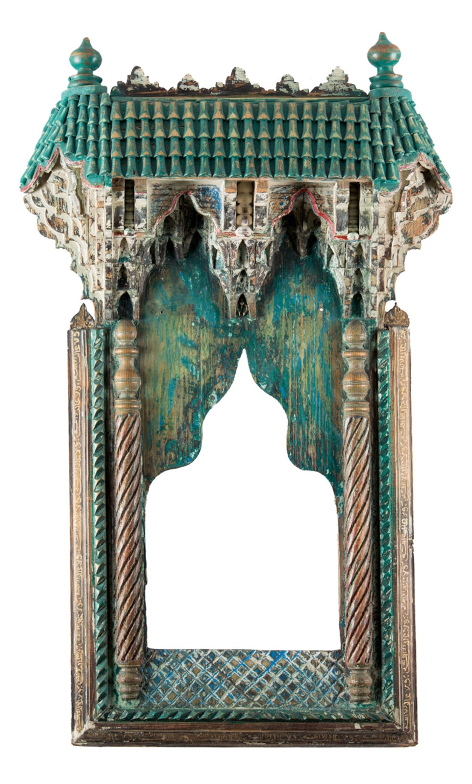 ARTE ISLAMICA Specchio Hispano Moresco in legno laccato Spagna, XIX secolo . -. Cm 46,50 x 80,00. Di forma rettangolare, due colonne tortili sembrano sostenere una trabeazione ricca di muqarnas, con tracce di colore rosso e blu, al di sopra della quale si nota un tetto spiovente. Al centro una nicchia architettonica con cupola, ora vuota, ai margini una cornice iscritta con pseudo-iscrizioni in arabo (?),