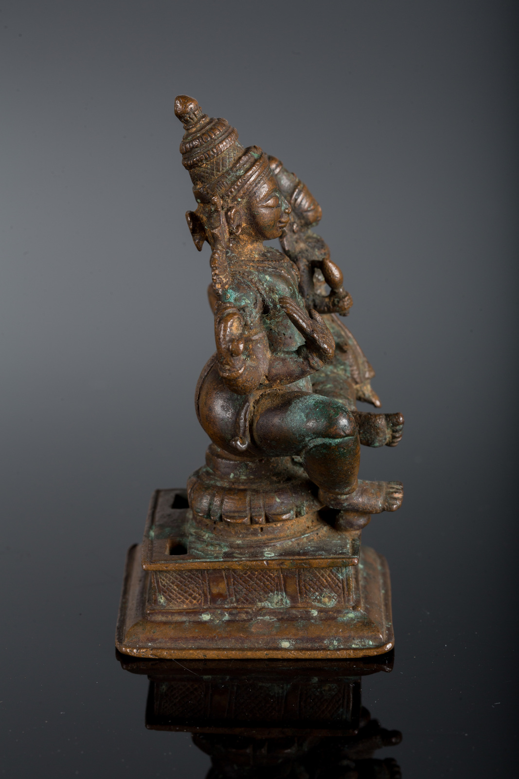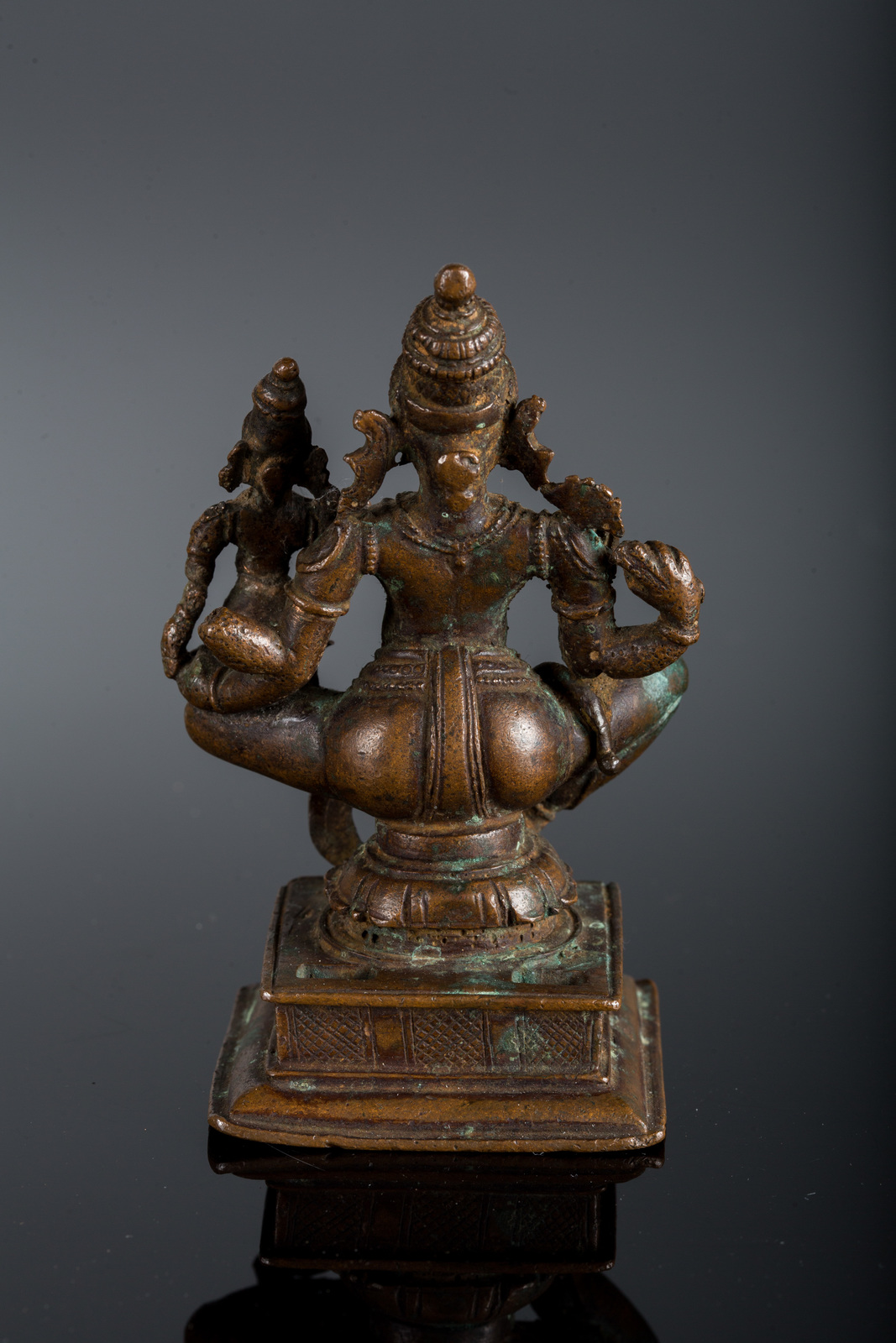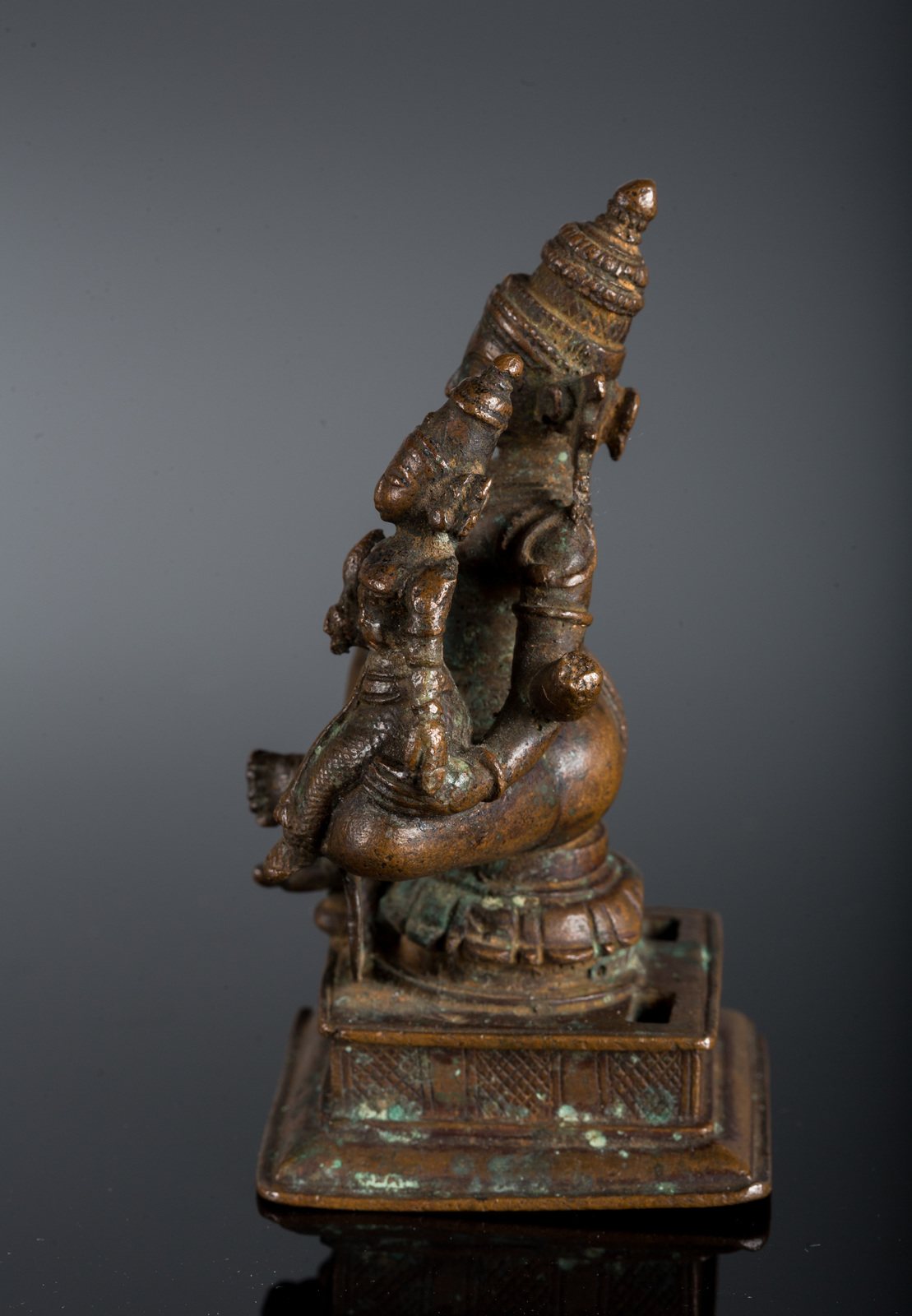Arte Indiana Bronzo a patina scura raffigurante Vishnu e Lakshmi India, Orissa, XVII secolo . -. Cm 7,00 x 11,00. La figura principale è seduta in ardhaparyanka su una base quadrangolare e mostra la mano destra in abhayamudra. La sua gamba sinistra fornisce supporto alla consorte Lakshmi, riconoscibile dal fiore di loto nella mano destra. Entrambe le figure sono abbellite da corone e gioielli.
