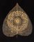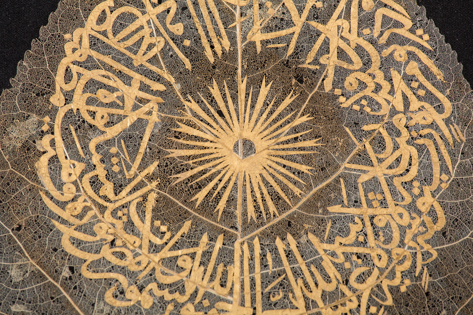 Turchia, datata 1332 (1914 AD). -. Cm 20,00 x 24,00. Esercizio calligrafico su foglia naturale decorata con iscrizioni dorate in andamento circolare intorno ad un centro a raggiera simboleggiante la luce. L'iscrizione riporta infatti l'ayat n. 35 della Sura Al-Nur (n. 24 la Luce).