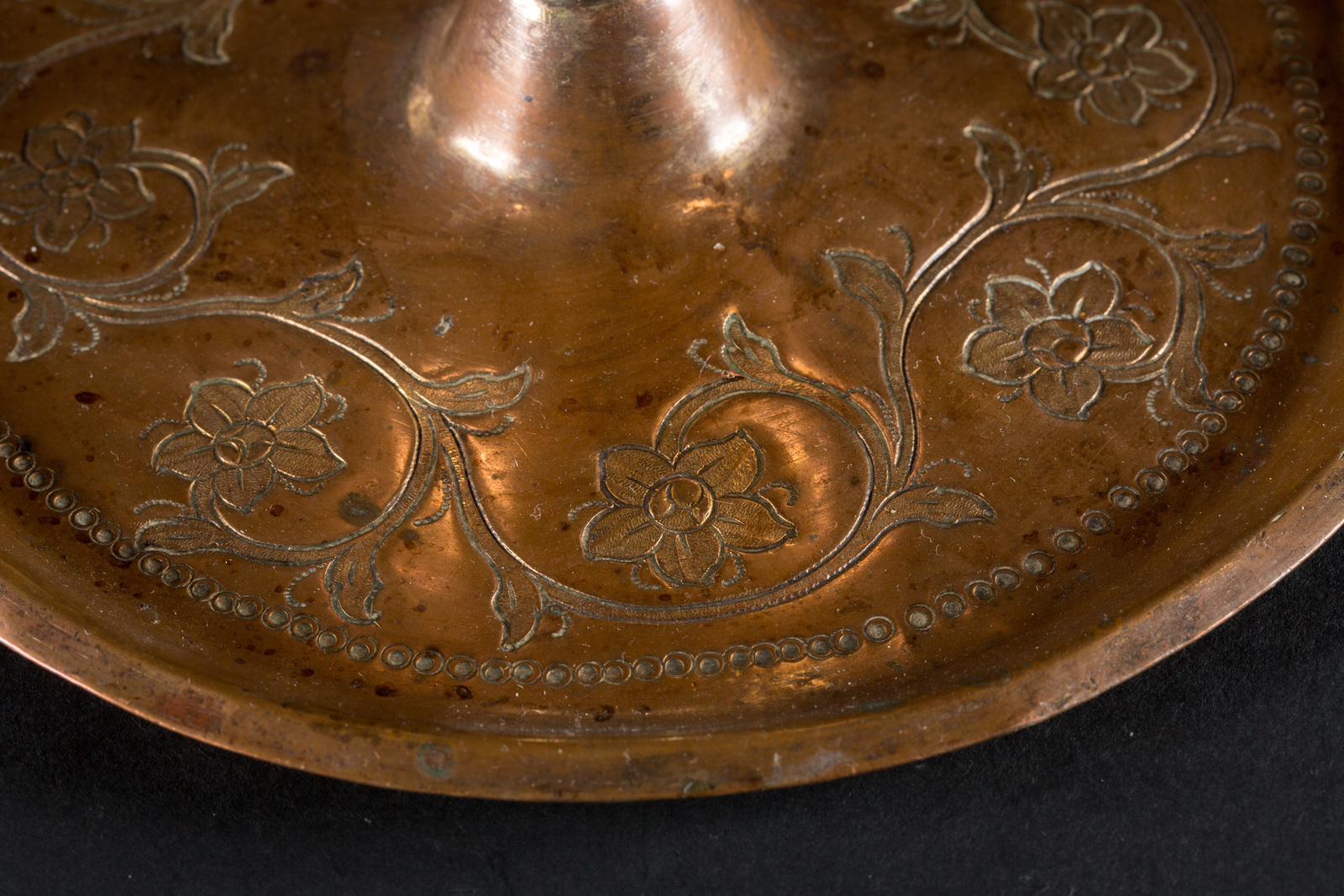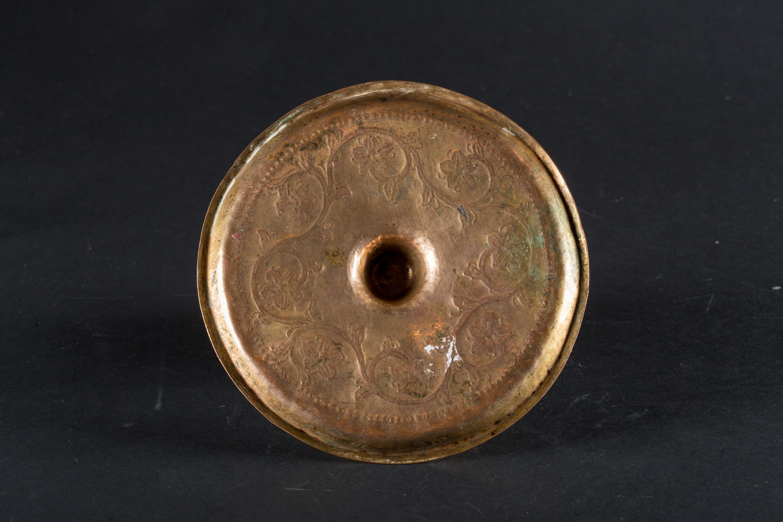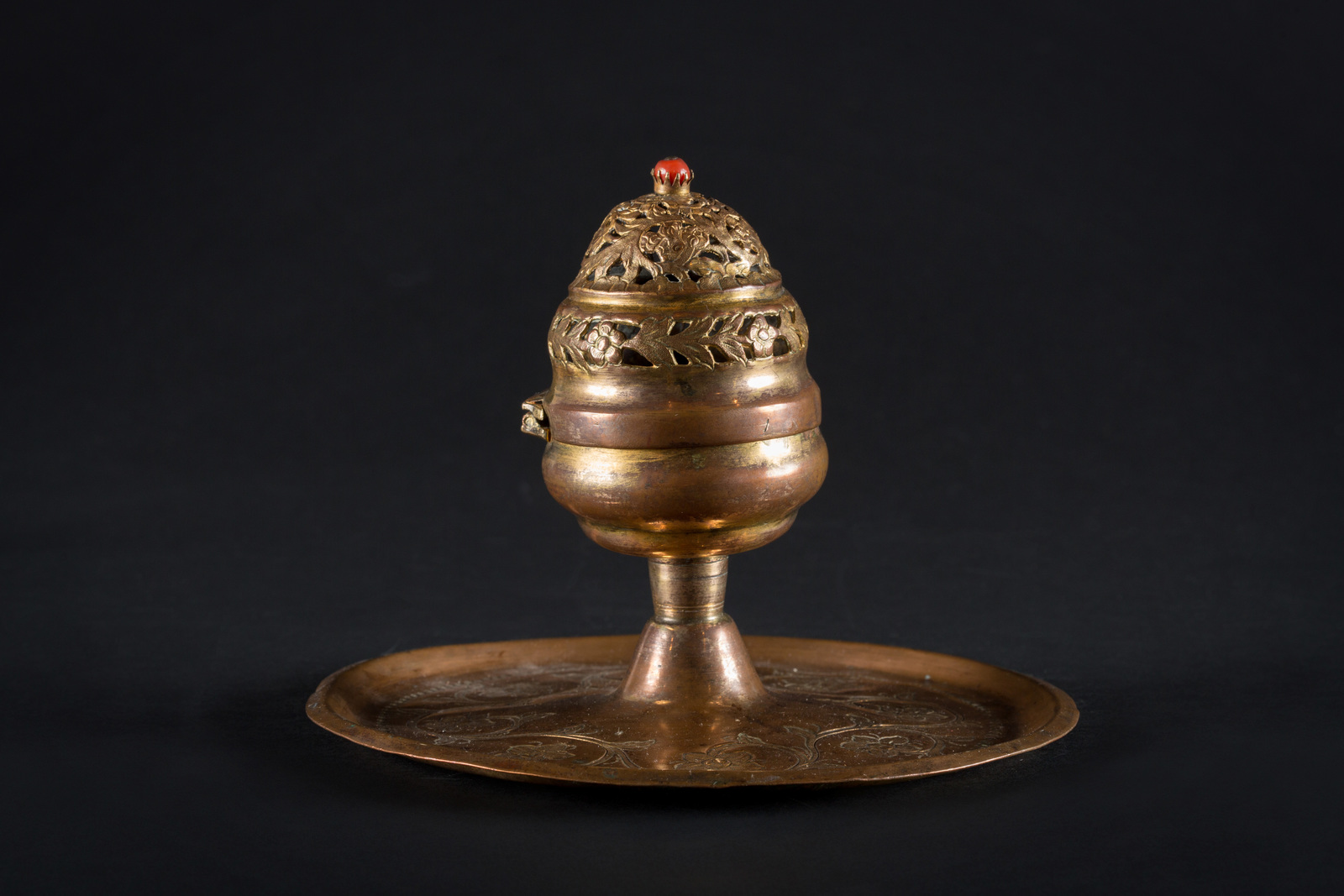 Turchia, XIX secolo . -. Cm 19,00 x 15,00. La base rotonda finemente incisa con fiori e foglie concatenate che circondano il supporto su cui si erge l'incensiere con coperchio incernierato finemente lavorato a traforo con decorazione vegetale. All'apice una piccola pietra entro coroncina metallica.