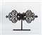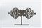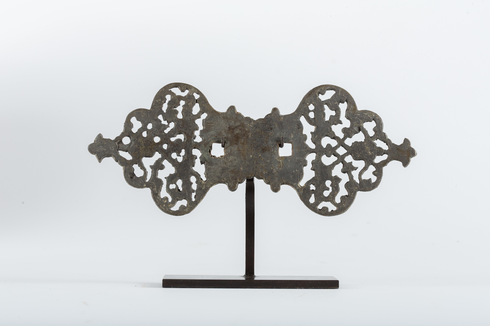 . -. Cm 21,00 x 8,50. Composto da due palmette affrontate caratterizzate da fitta decorazione a traforo di arabeschi intrecciati e Hamsa alle due sommità. I due elementi sono uniti da una fascia piena più sottile recante due fori quadrati in cui attualmente si situa il supporto.