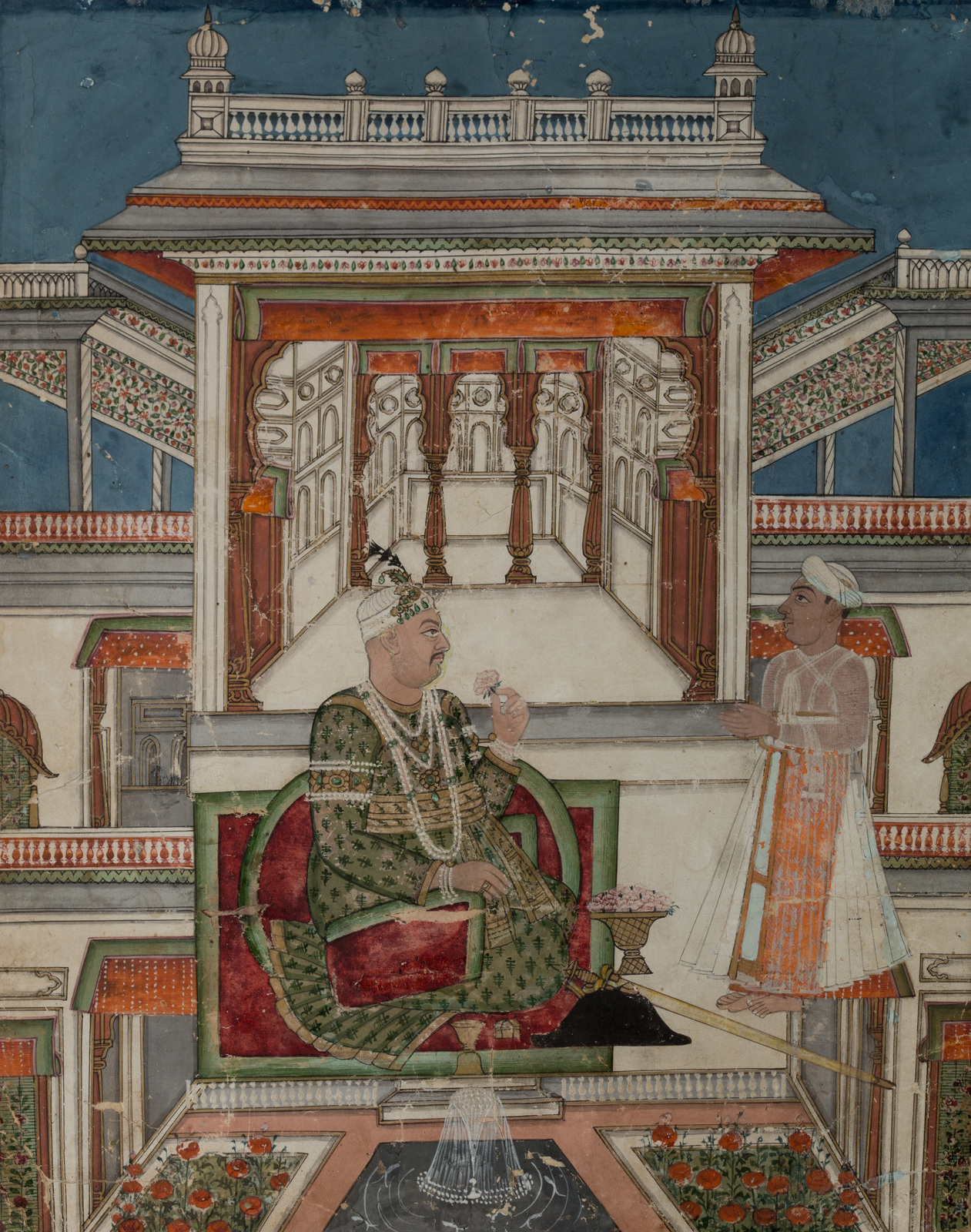 Arte Indiana Miniatura raffigurante un principe in un palazzo India, Rajasthan, XIX secolo . -. Cm 20,00 x 23,00. Un intricato insieme di prospettive diverse contraddistingue gli elementi architettonici che forniscono lo sfondo davanti al quale sono rappresentati un nobiluomo ed il suo attendente in un giardino, nei pressi di una fontana.