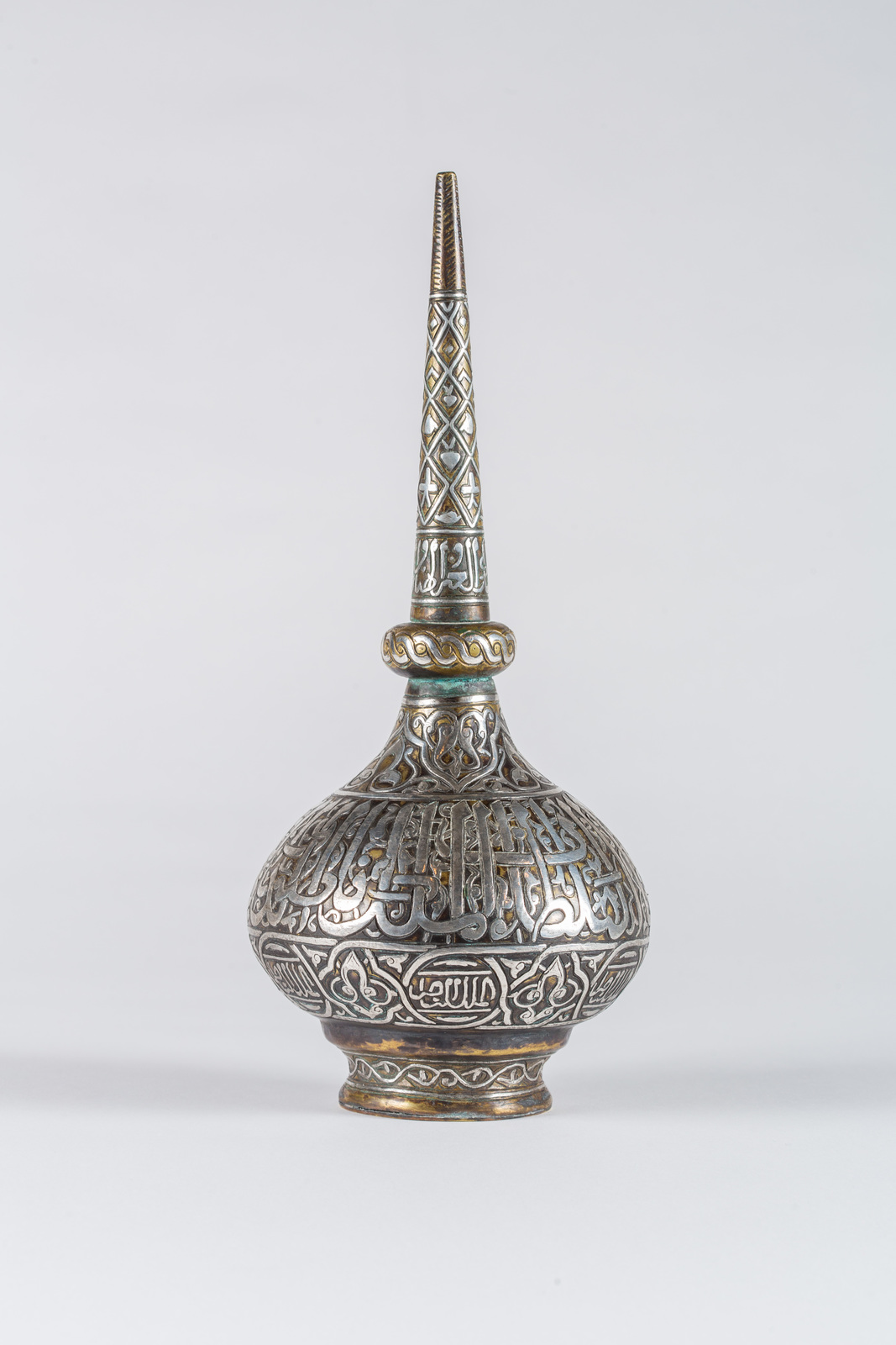Arte Islamica Aspersorio in metallo intarsiato con scritte in argento Egito o Siria, XIX secolo . -. Cm 29,00. Poggiante su alta base rotonda, il corpo globulare e lungo collo affusolato. Decorato con ampie iscrizioni tratte dal Corano sul corpo centrale e sul collo e palmette intrecciate nelle bande decorative marginali.