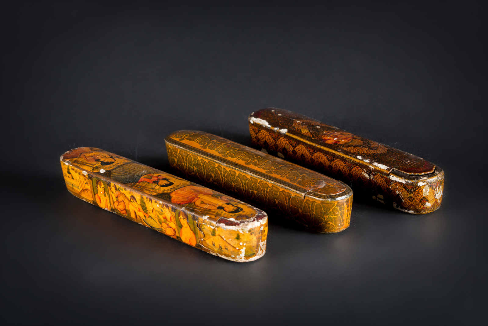 Arte Islamica Lotto di tre portapenne (Qalamdan) in papier machè
