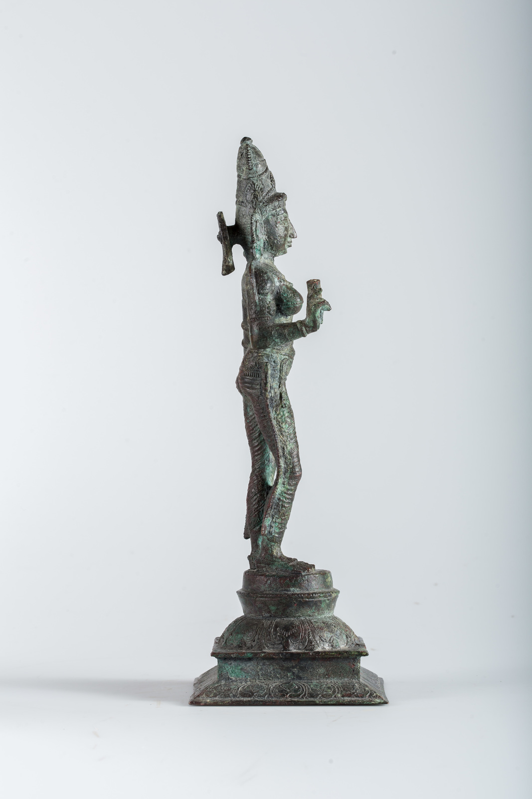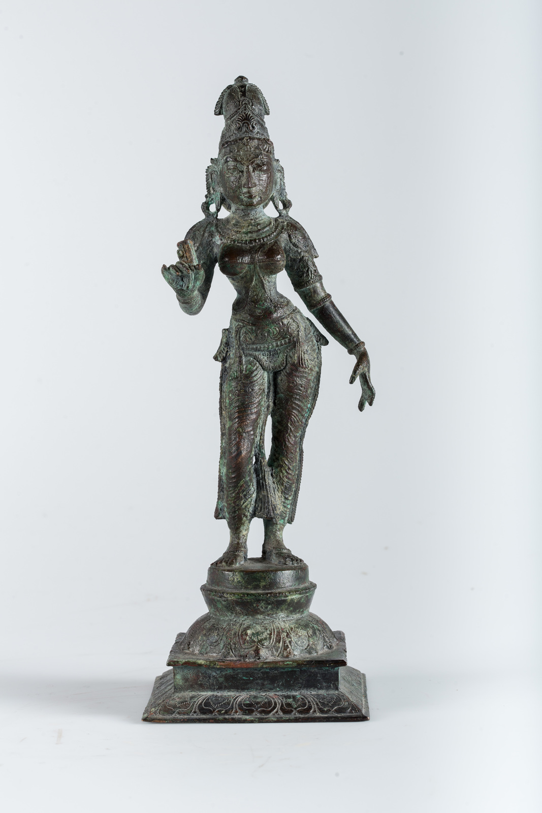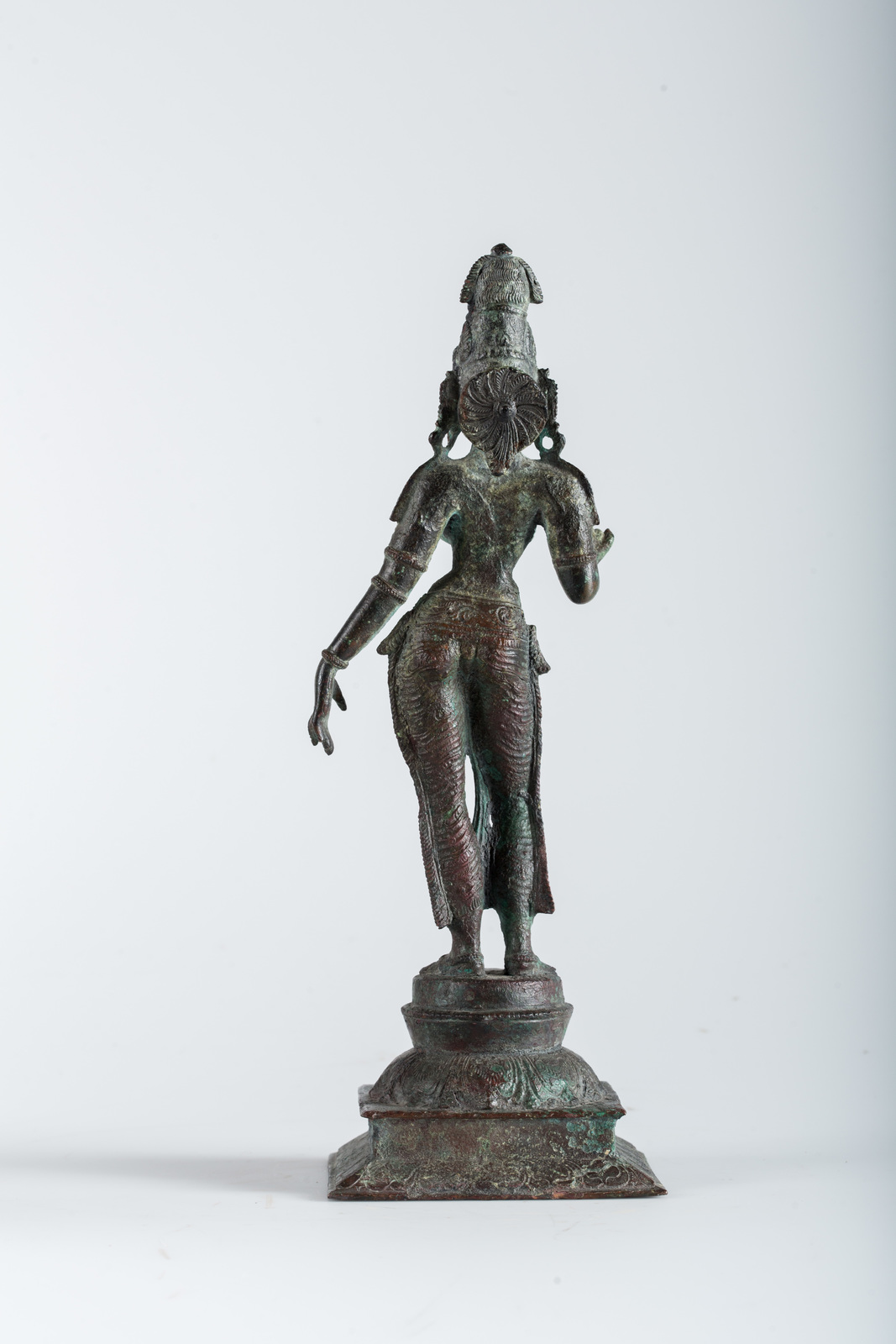 India, Chola period, 12th century or later . . Cm 11,00 x 33,00 x 11,00. Standing in tribanka position on a single lotus resting on a square base. Missing lotus in her right hand.