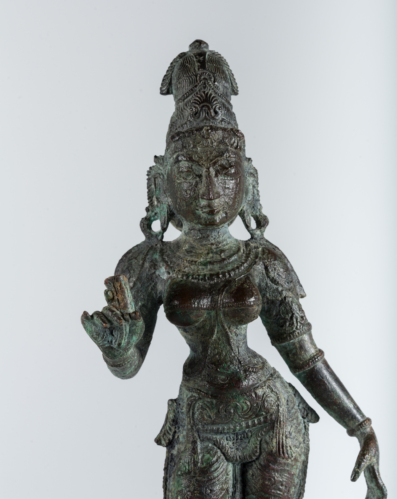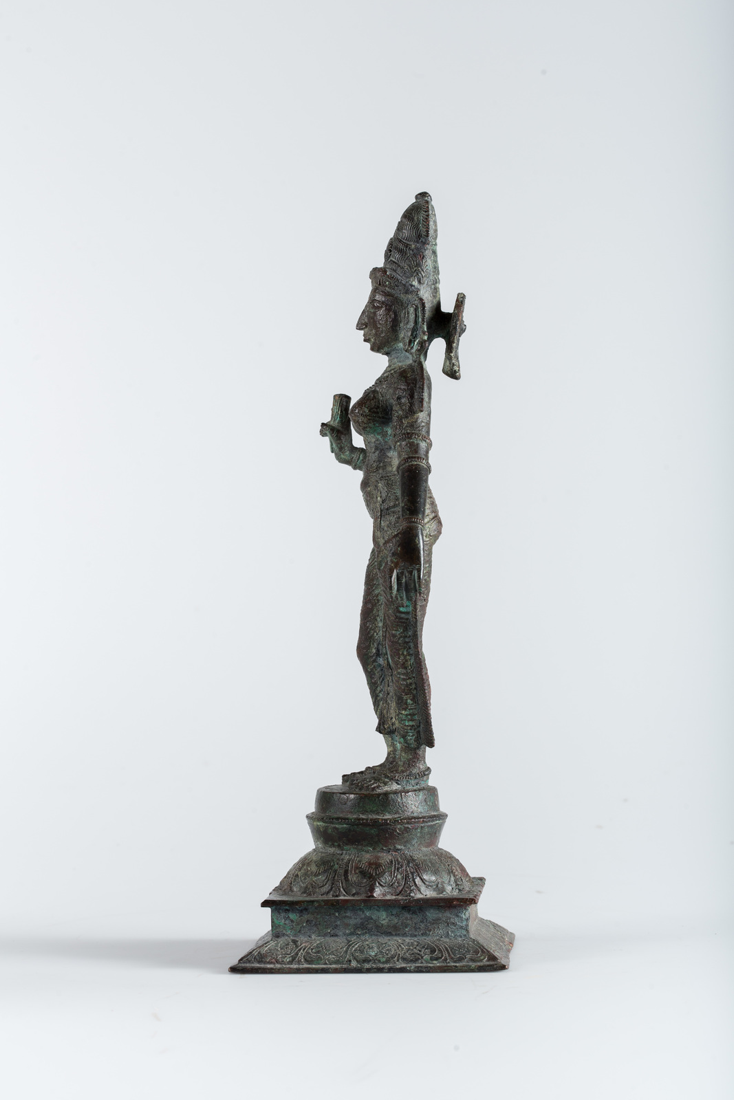 India, periodo Chola, XII secolo o posteriore. -. Cm 11,00 x 33,00 x 11,00. Stante in posizione tribanka su una base a loto singolo. Manca il loto nella mano destra.