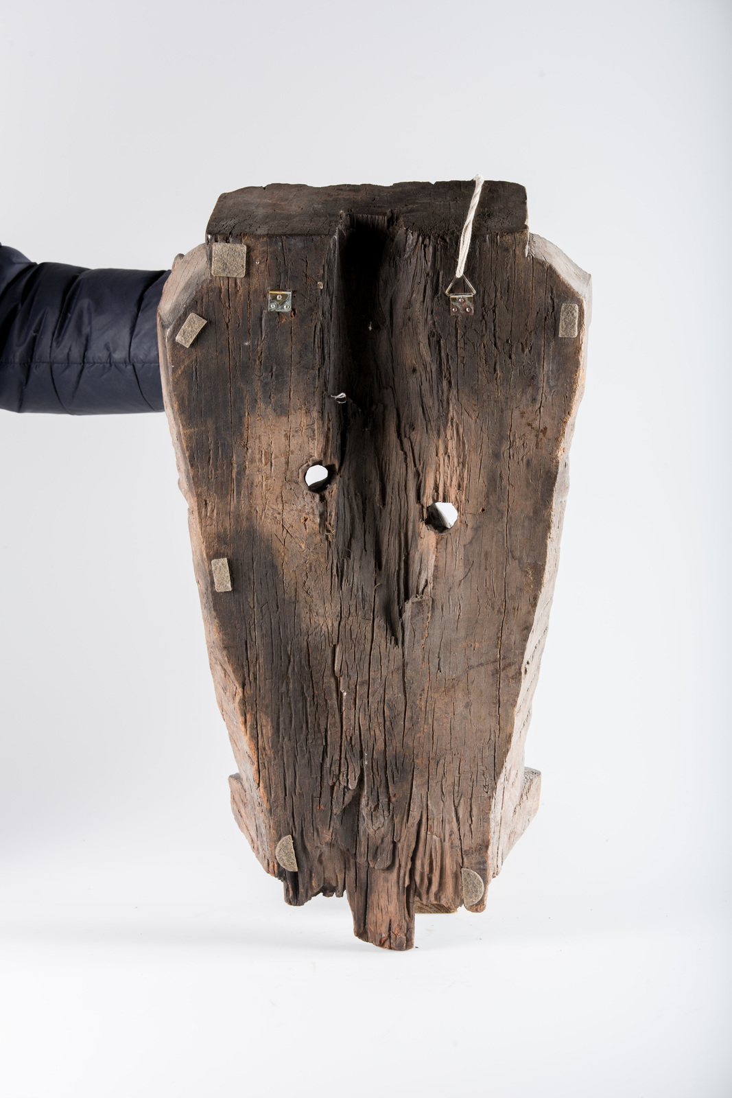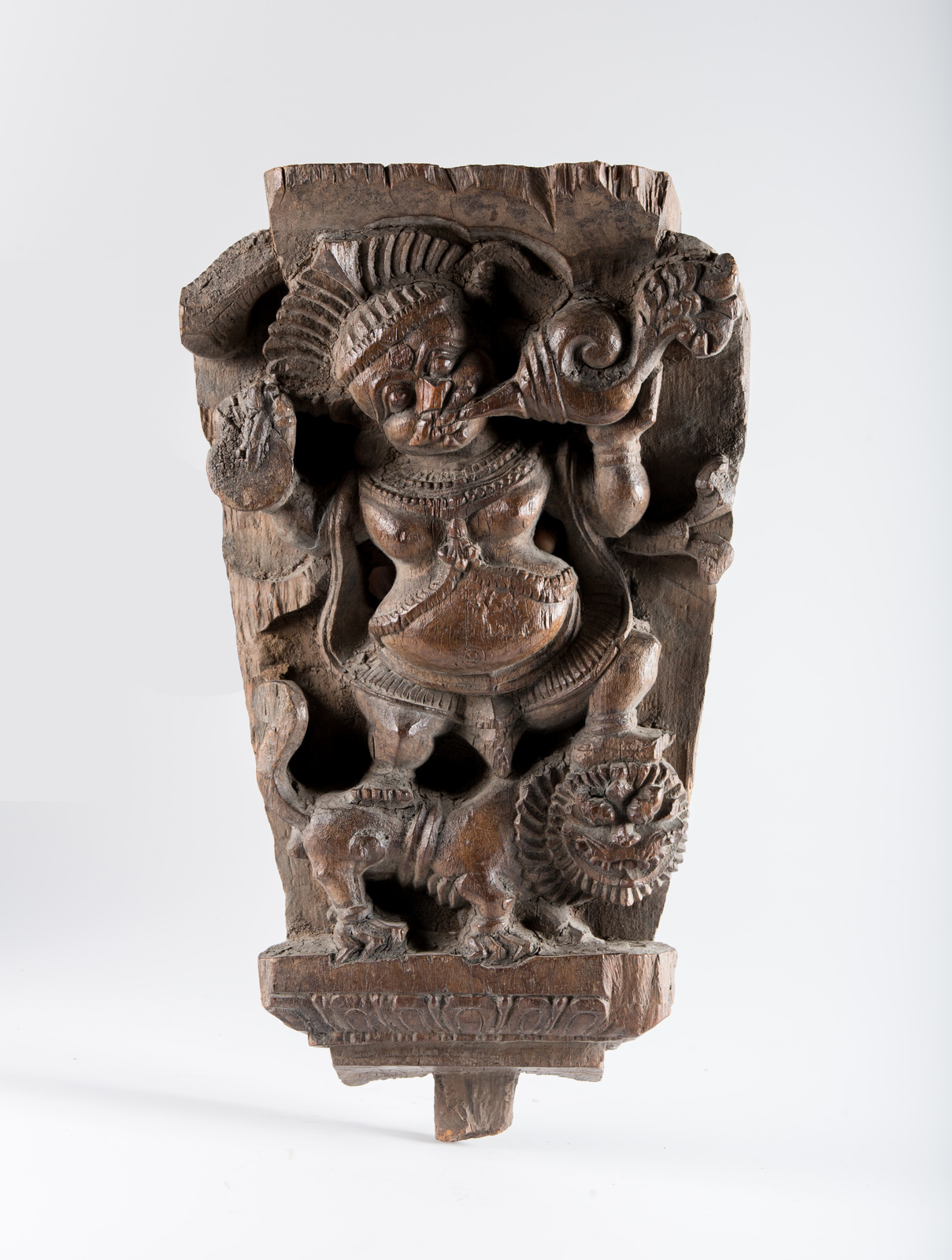 Arte Indiana A wooden carved panel depicting a Gana on a lion