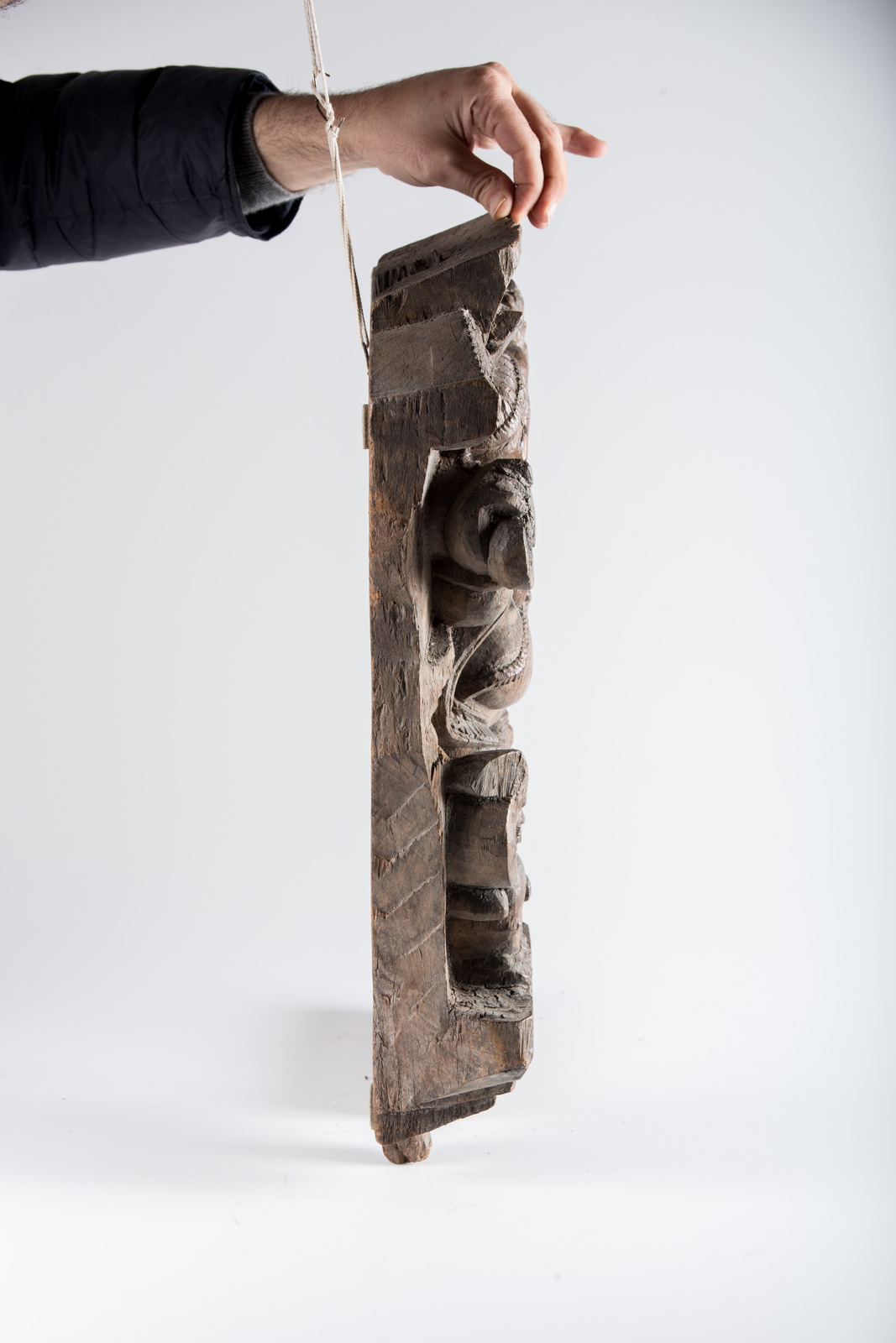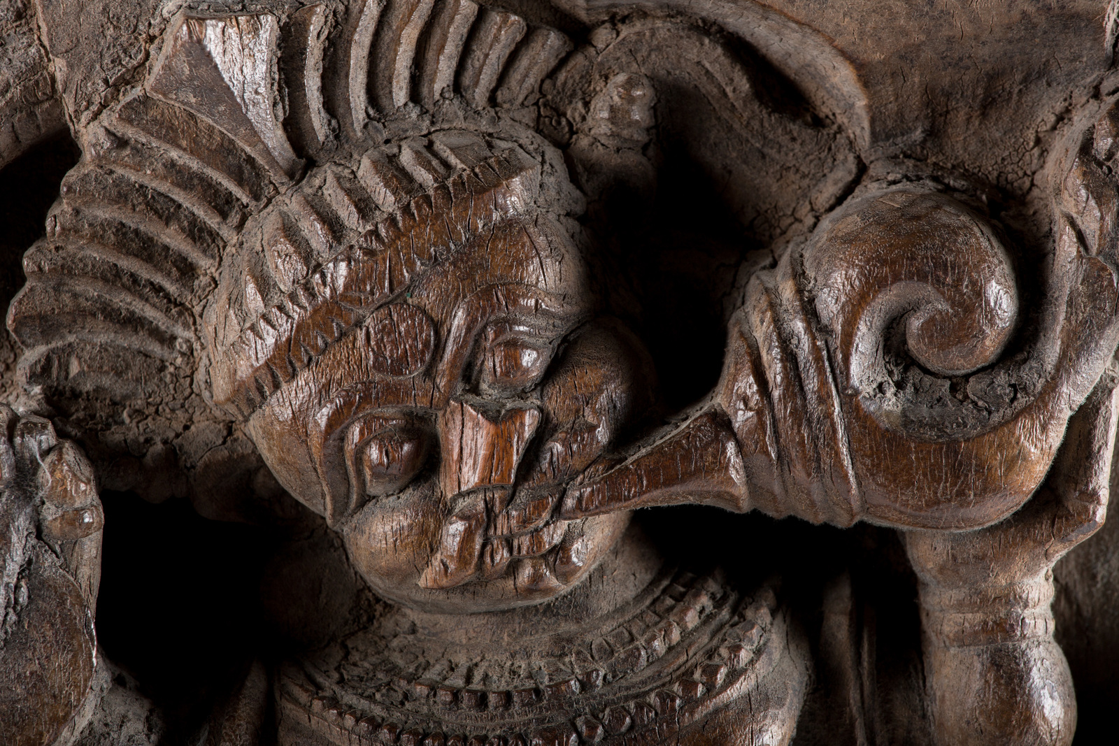 India Meridionale, XVIII secolo . -. Cm 31,00 x 55,00. Pannello scolpito raffigurante un servitore di Ganesh colto nell'atto di suonare una conch. La figura si erge sopra un un leone yali che a sua volta poggia su una base a loto singolo.