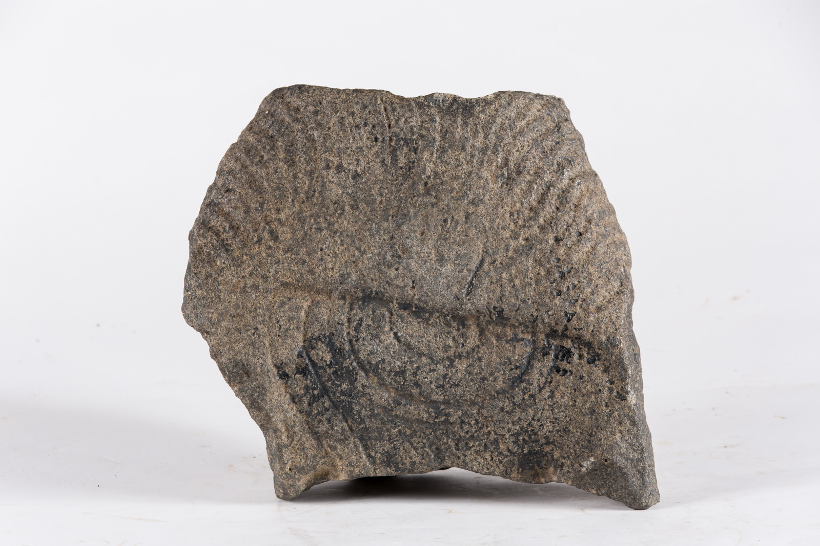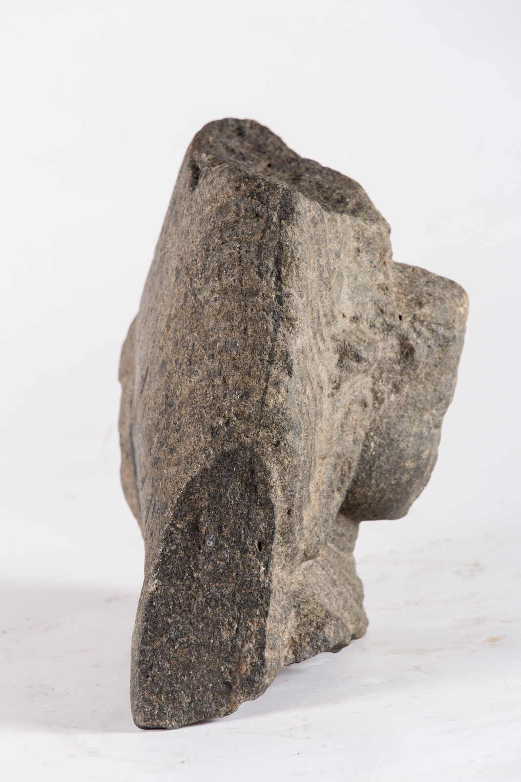 India Meridionale, Tamil Nadu, Tanjore, periodo Chola, XII secolo . -. Cm 30,00 x 27,00. Consunto frammento di scultura raffigurante Shiva nella sua manifestazione irata. Presenta ai lati della testa il residuo di un aurea fiammeggiante.