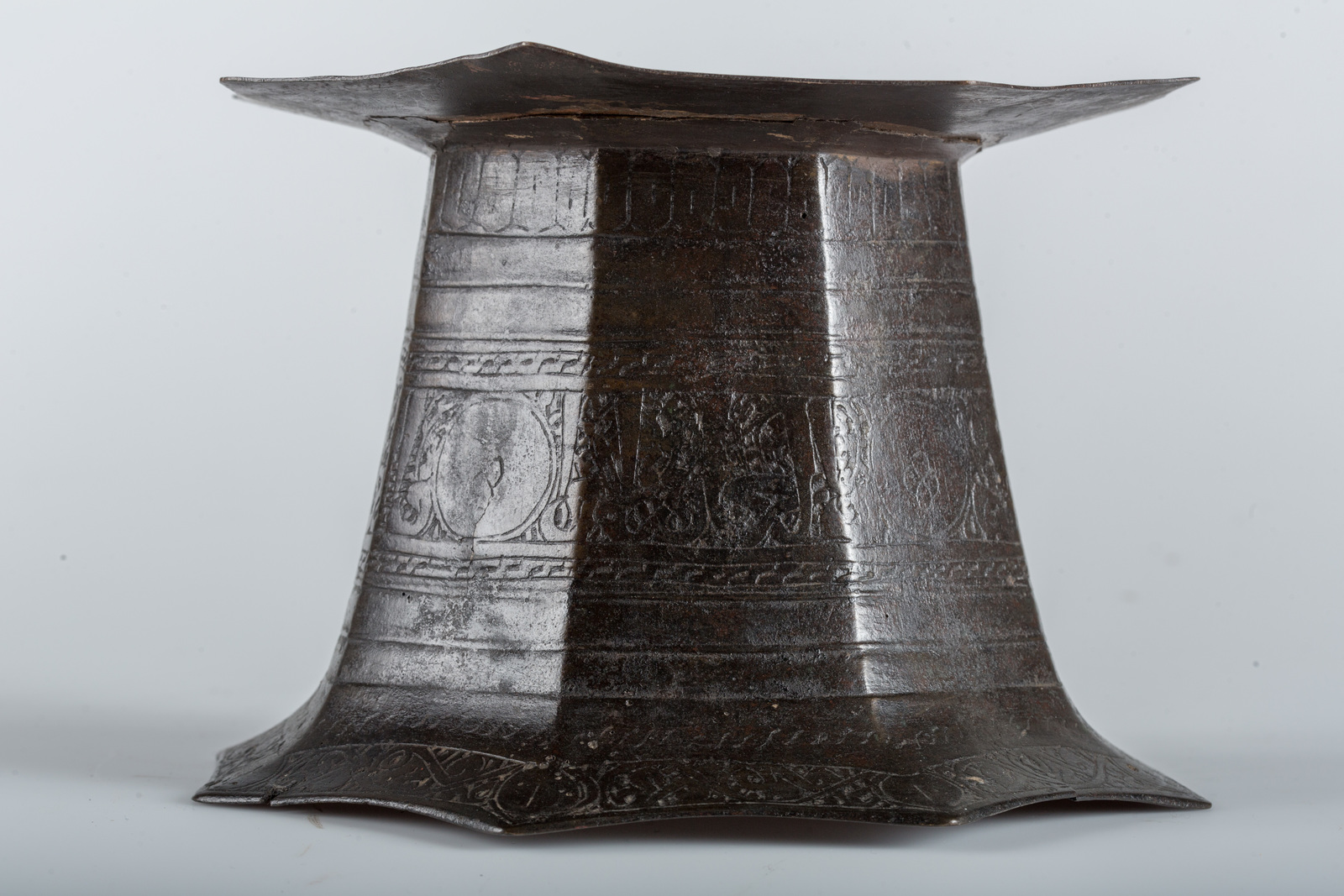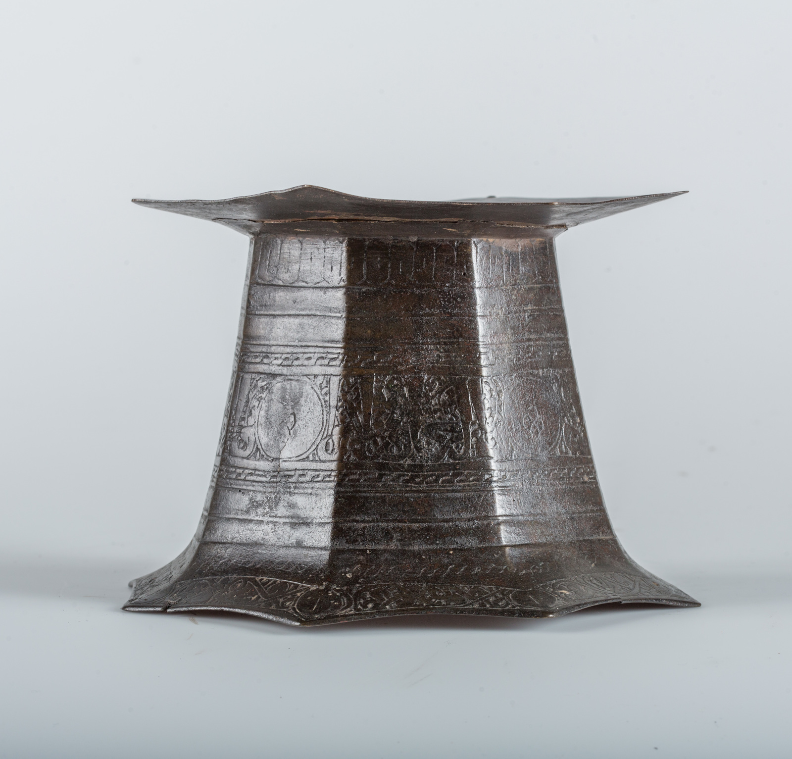 Arte Islamica A bronze tray stand engraved with floral spirals and calligraphy