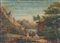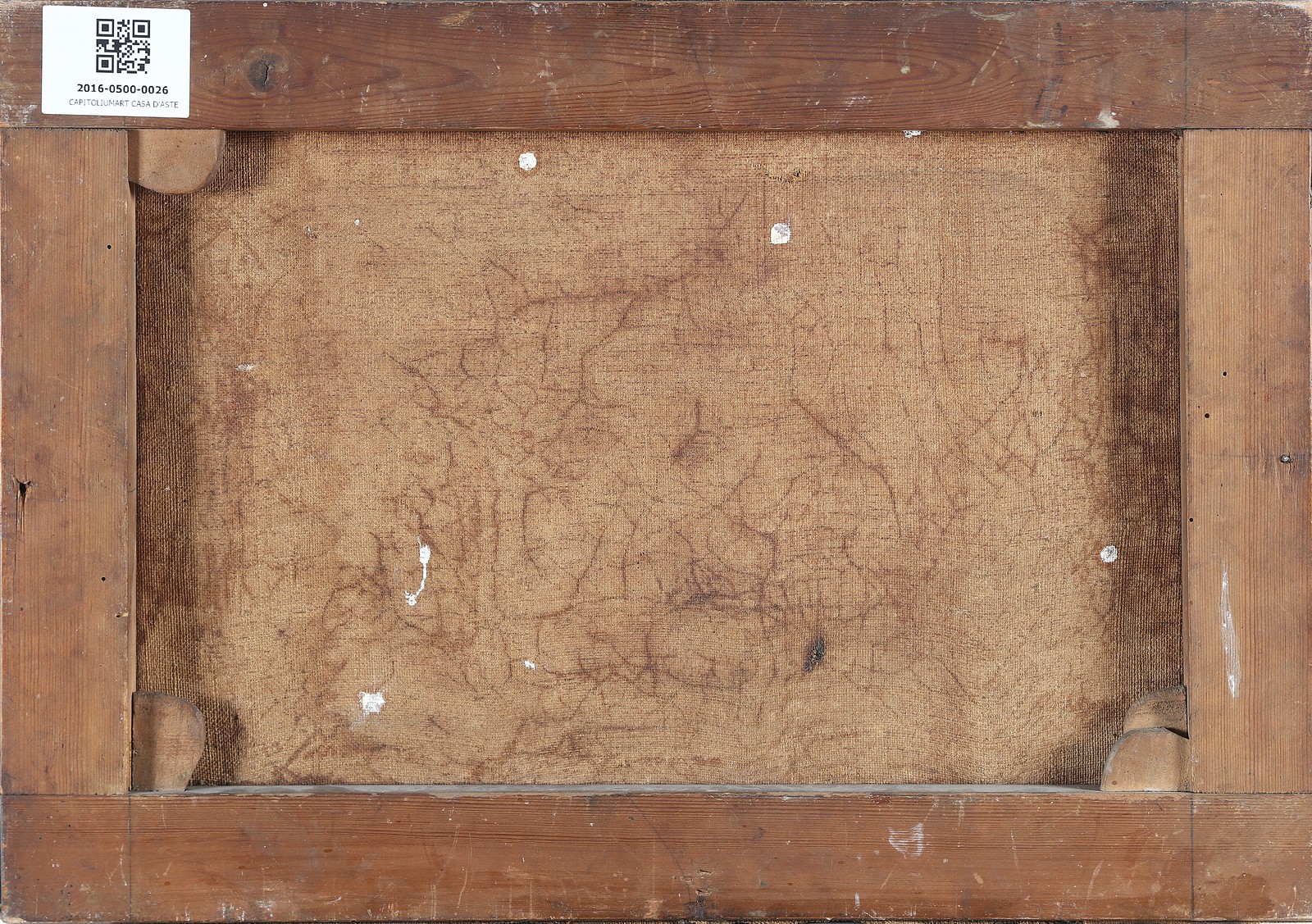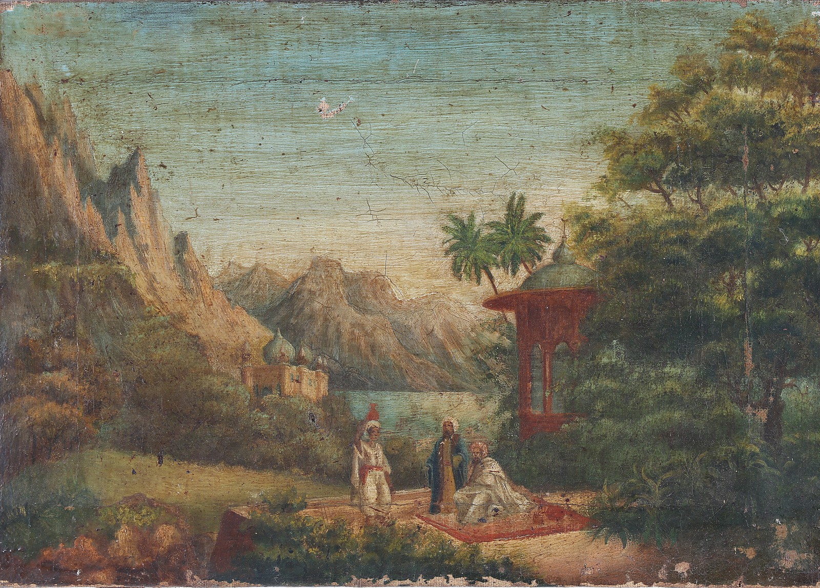 Olio su tela . . Cm 38,00 x 34,00. In un paesaggio ricco di vegetazione e caratterizzato da due edifici con cupole, si notano due uomini, seduti su un tappeto, ed un attendente che trasporta dell'acqua.