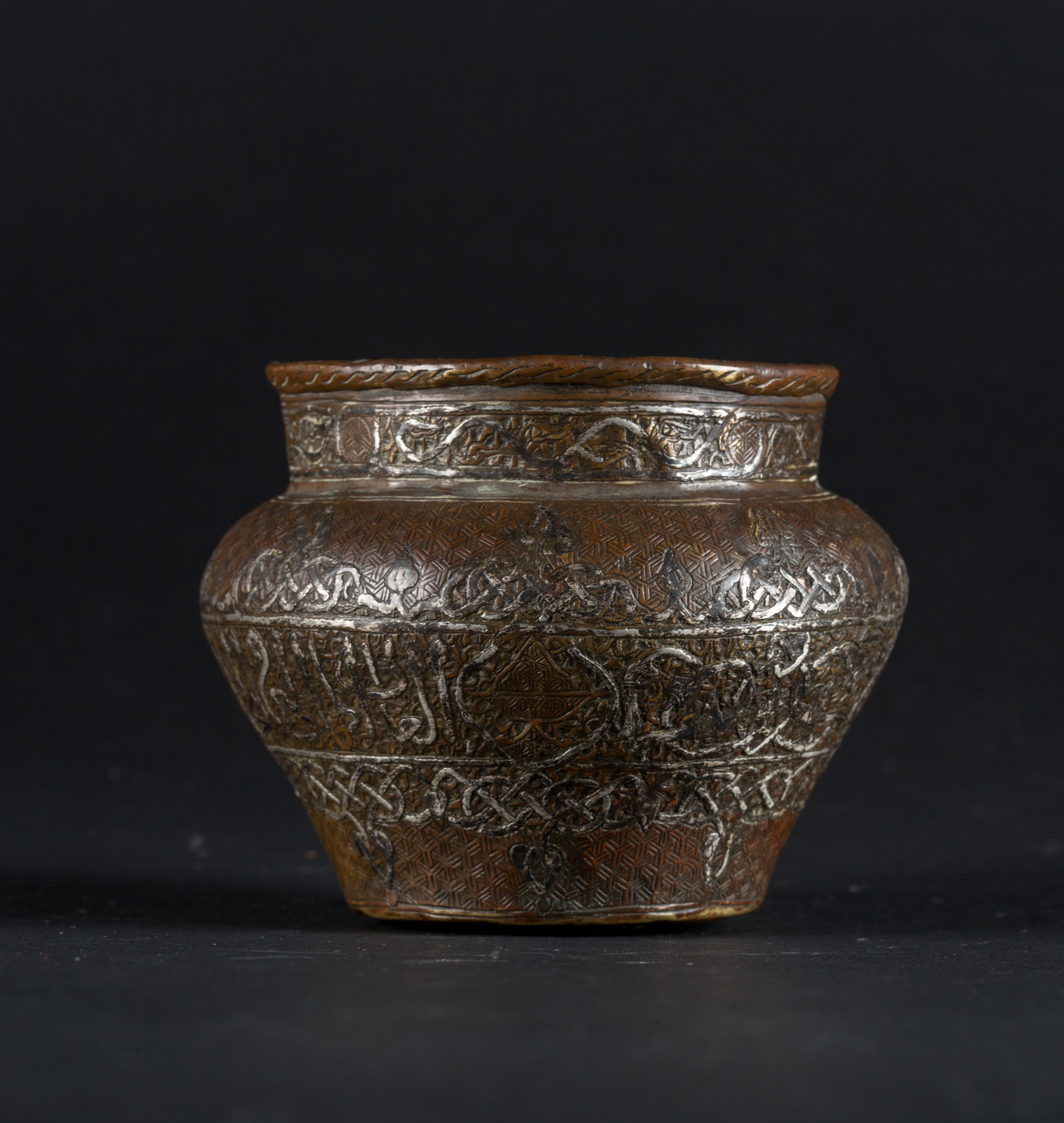 Egitto, inizio XIX secolo . -. Cm 8,00 x 8,00. A sezione circolare con ampia spalla rigonfia e collo svasato, il corpo inciso con con arabeschi e cartigli contenenti iscrizioni arabe in thuluth su fondo geometrico.