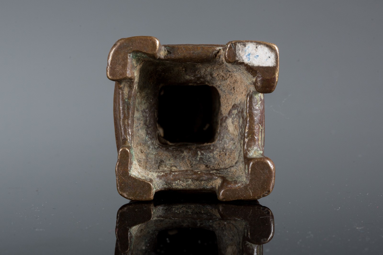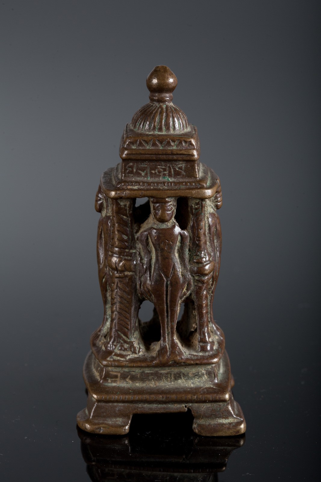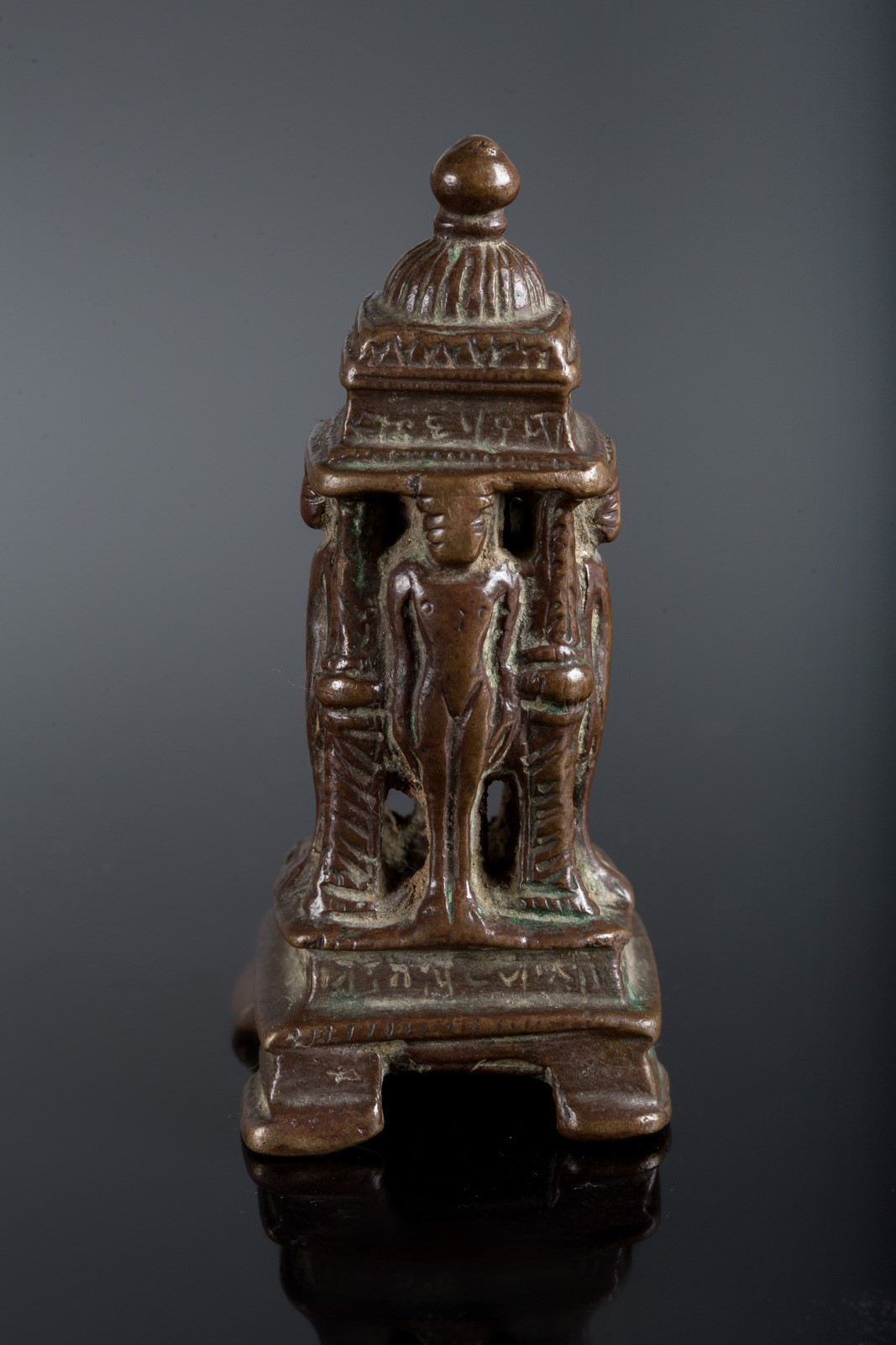 India, XI secolo, datato 1109 (A.D. 1053). -. Cm 11,00. Fusione in lega di rame raffigurante un piccolo tempio quadrilaterale in cui ogni lato ospita un tirthankara. Alla base della struttura un'iscrizione con la datazione indicata.