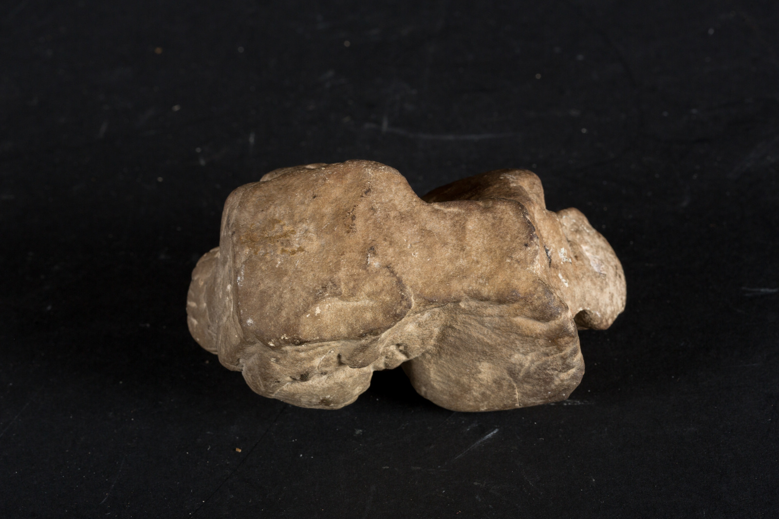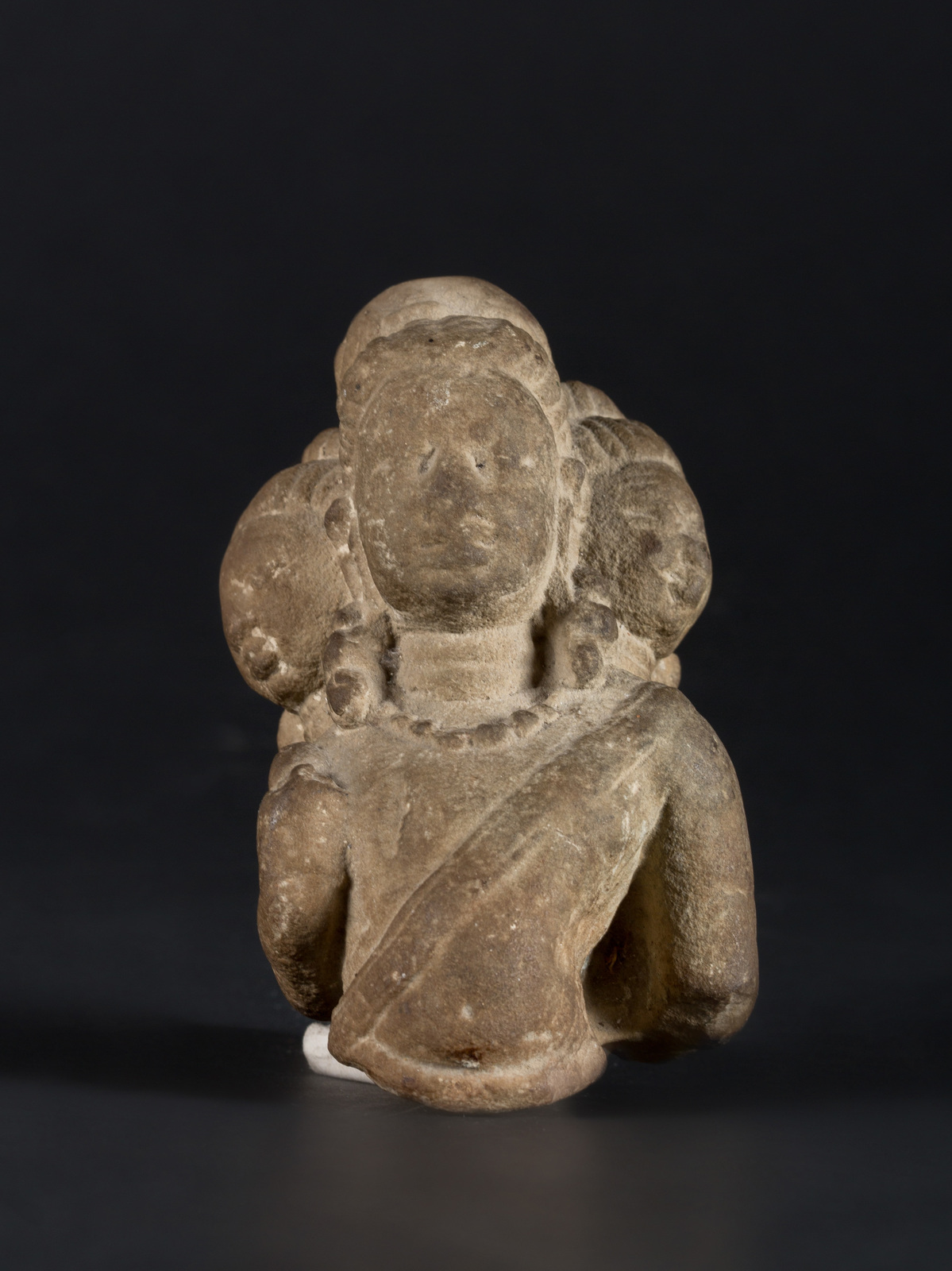 India settentrionale, Periodo Gupta, IV - VII secolo AD. -. Cm 12,00. Piccola scultura in pietra raffigurante la divinità caratterizzata da due teste secondarie laterali ed abbellita da gioielli.