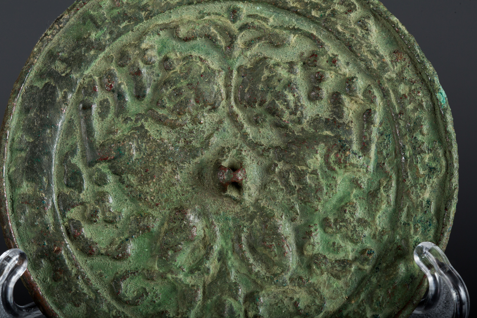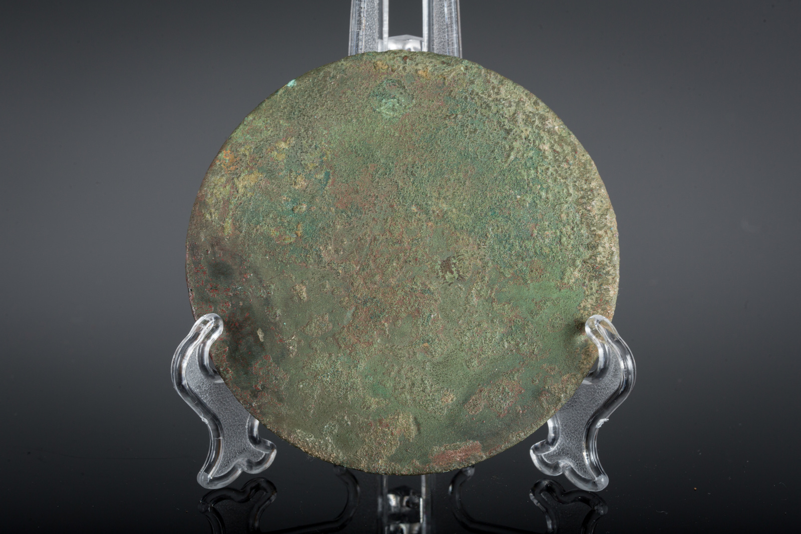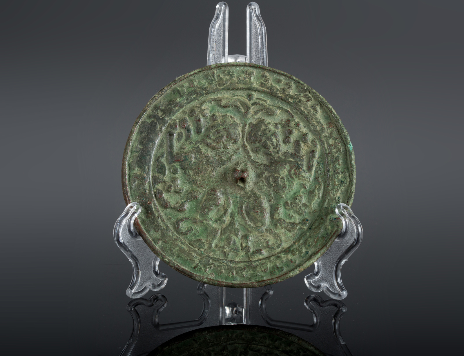 Arte Islamica Specchio in bronzo con decorazione a rilievo