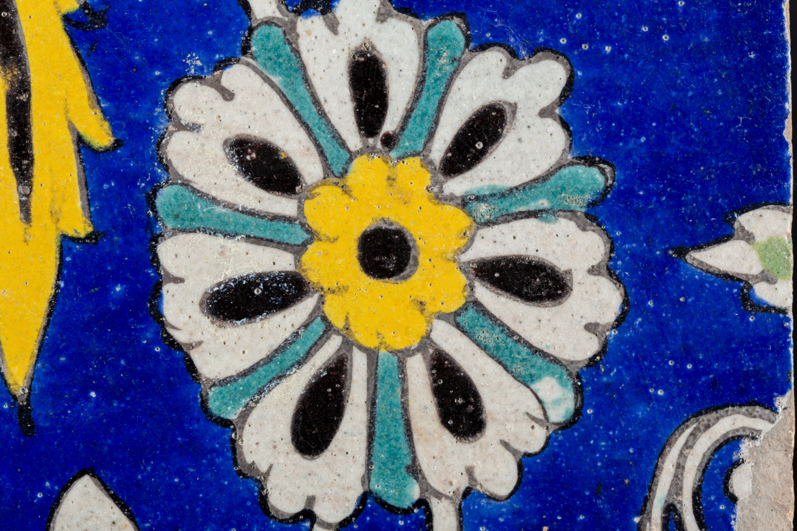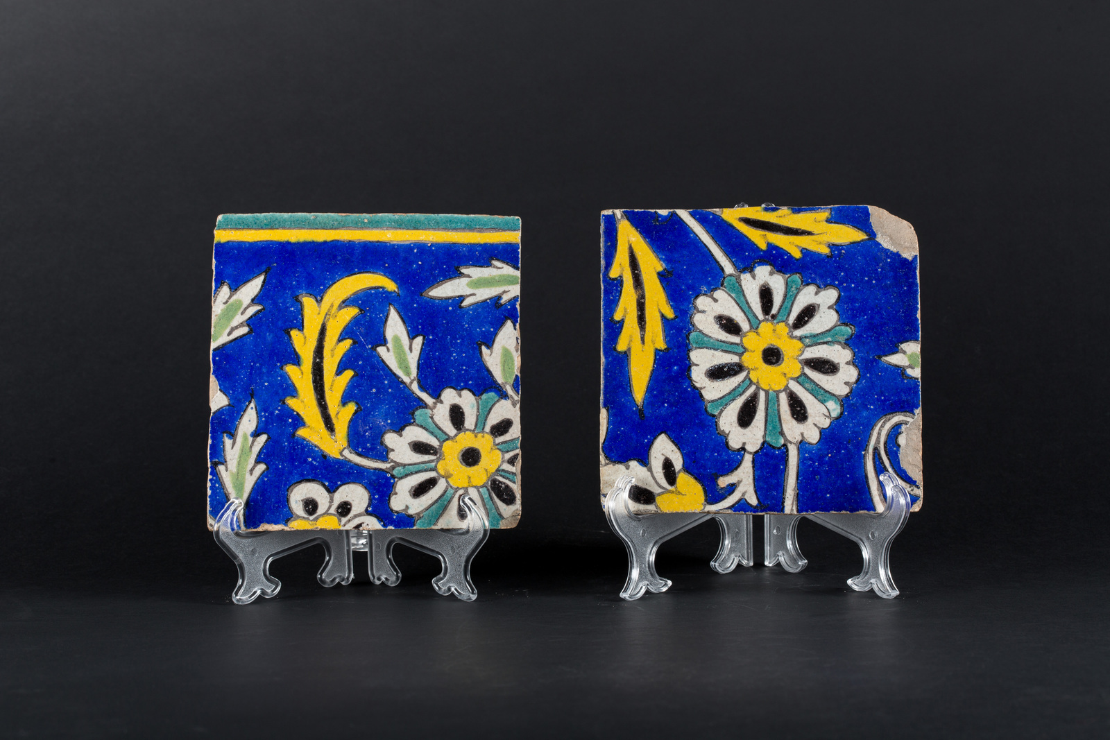 Arte Islamica A pair of cuerda seca tiles on blue background