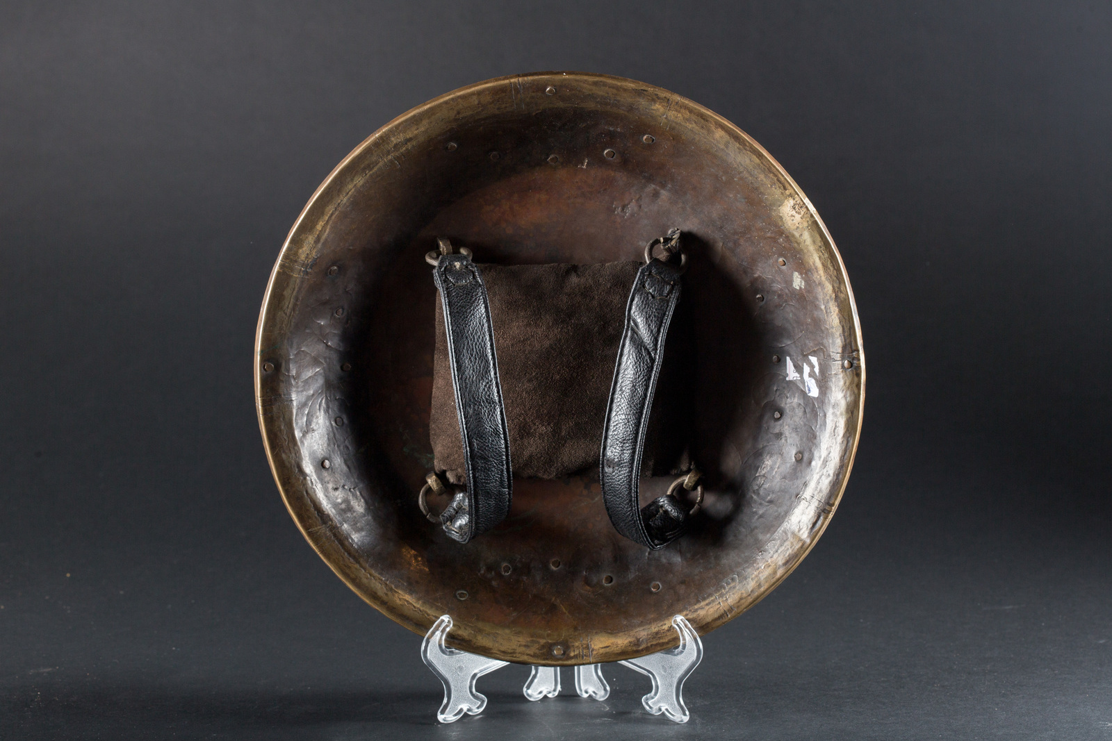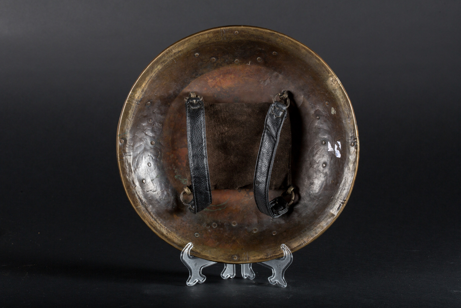 Arte Islamica Scudo in ottone, acciaio e rame Turchia, periodo Ottomano, tardo XIX secolo . -. Cm 33,00. L'esterno decorato con tralci vegetali, l'interno presenta un piccolo cuscino e due lacci in pelle per imbracciarlo.
