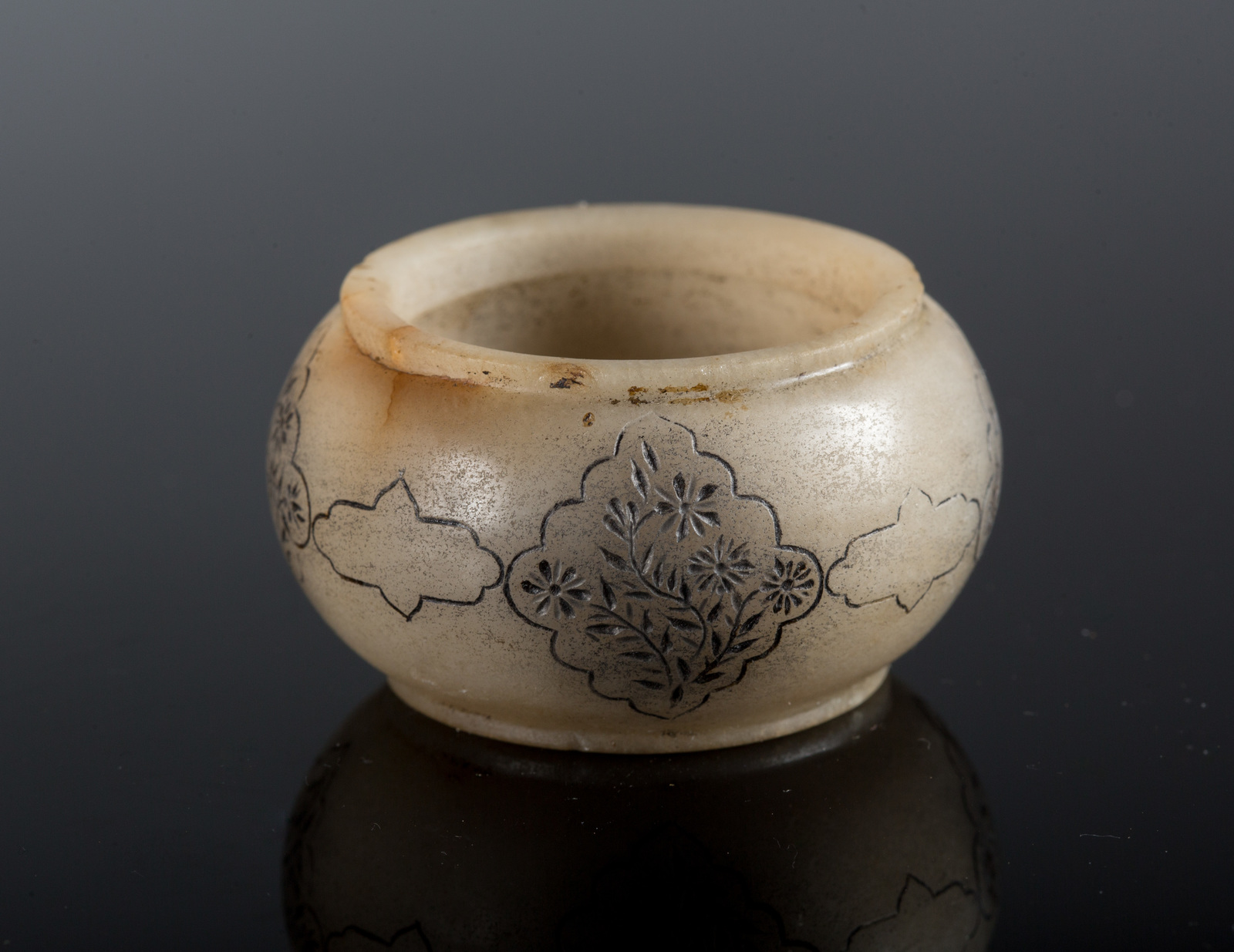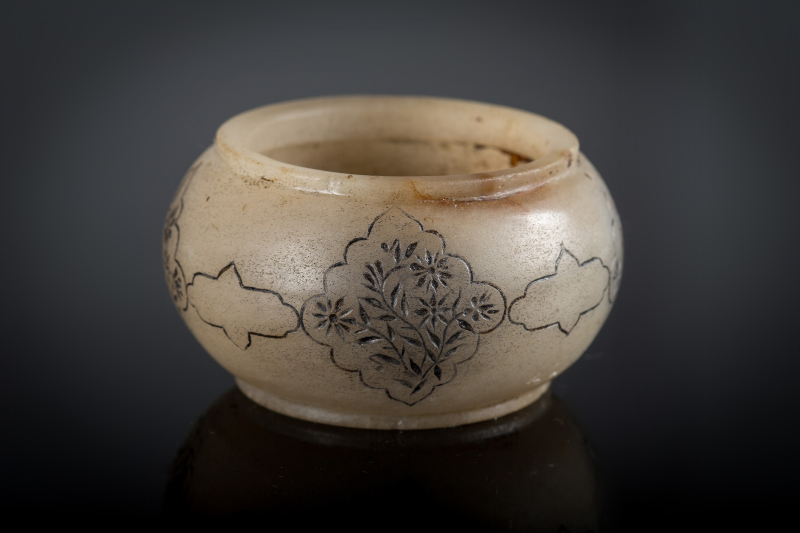 India, periodo Moghul, XVIII secolo . -. Cm 5,00 x 3,00. L'esterno inciso con medaglioni lobati contenenti motivi floreali alternati a cartigli vuoti.