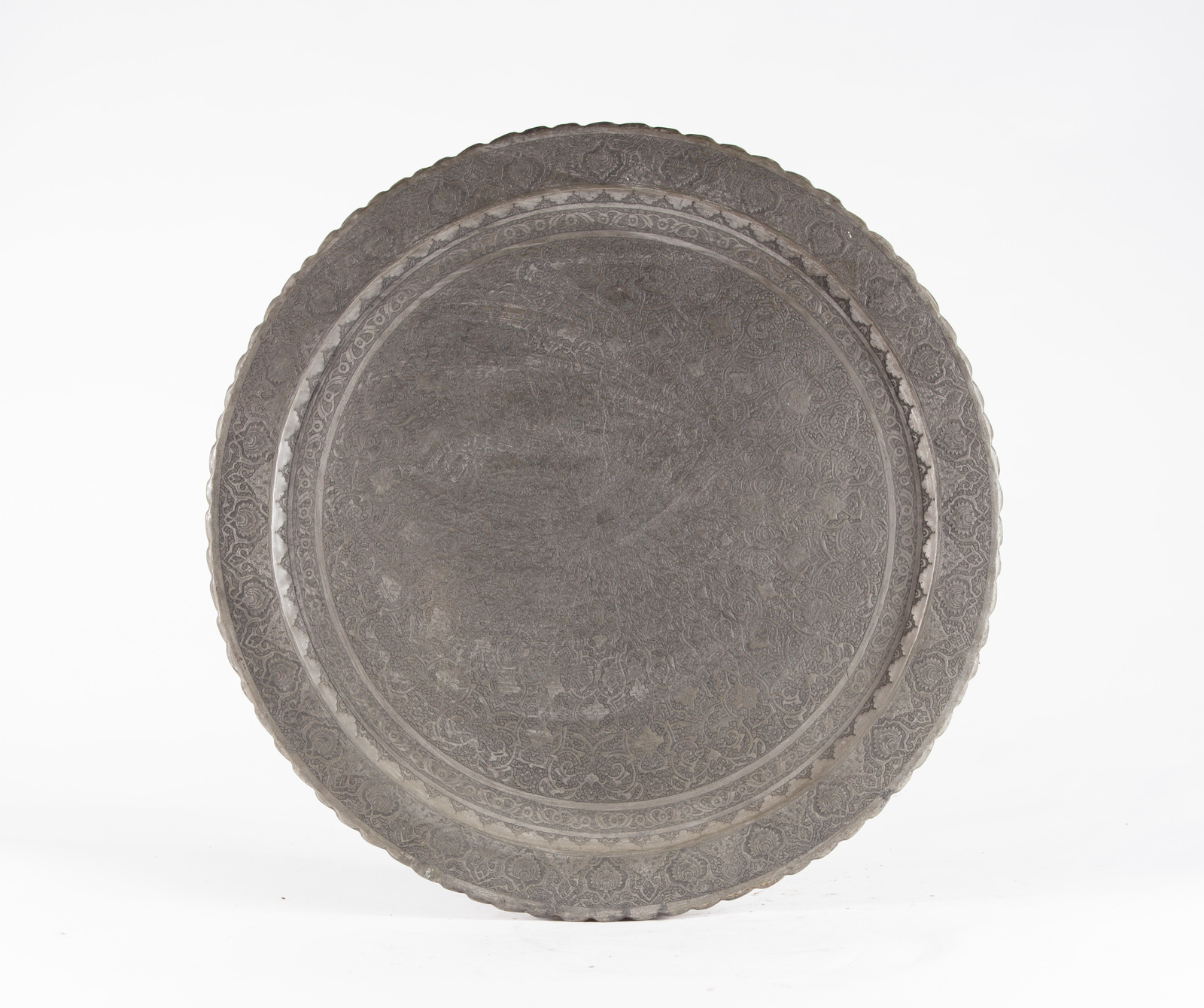 Arte Islamica Grande vassoio persiano in peltro Iran, tardo XIX secolo . -. Cm 68,00. Grande vassoio fittamente decorato con arabeschi intrecciati.