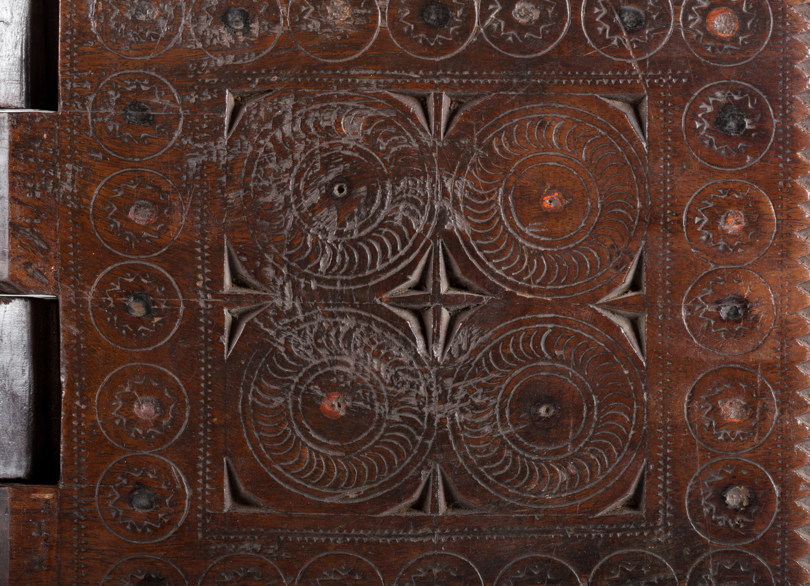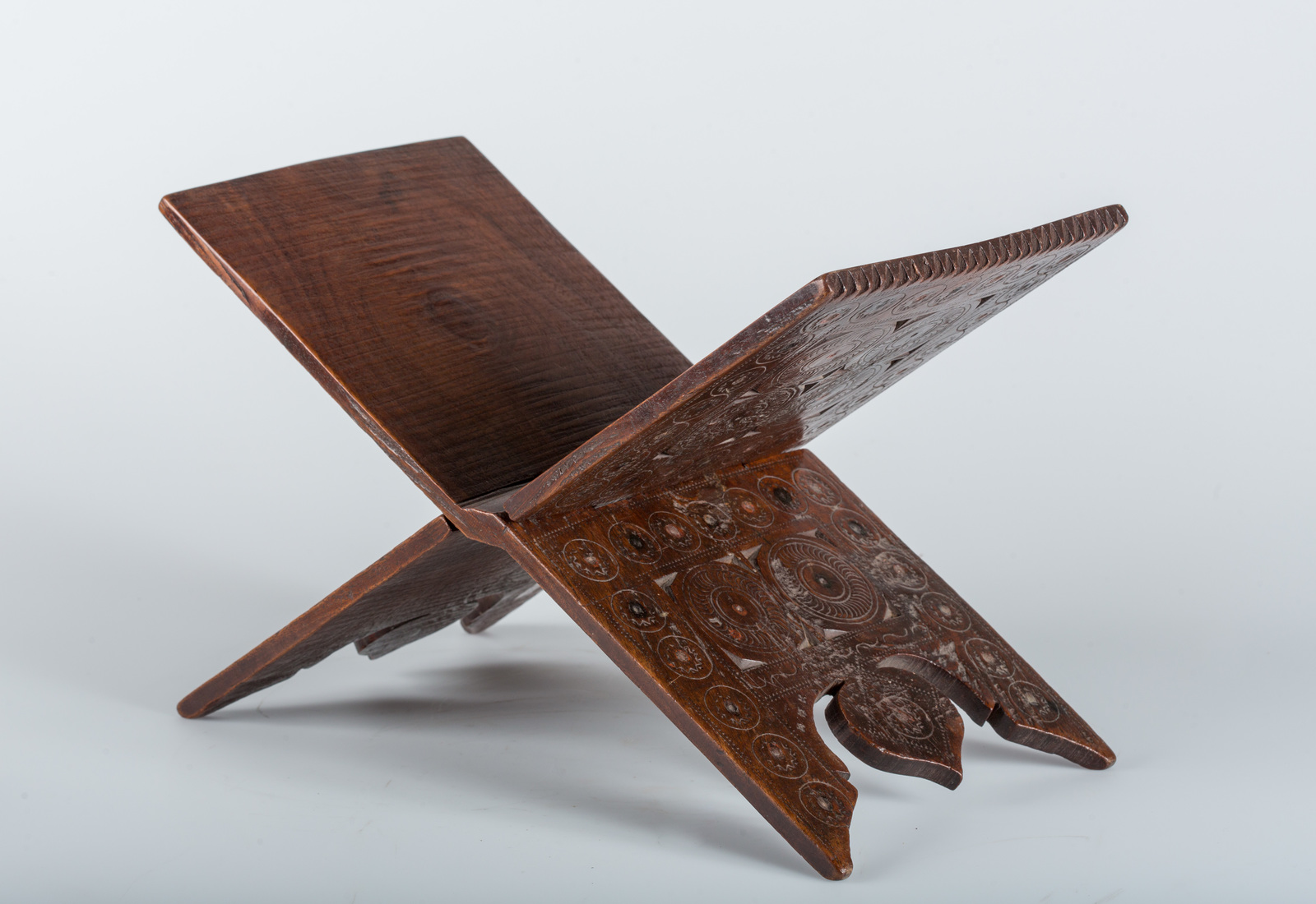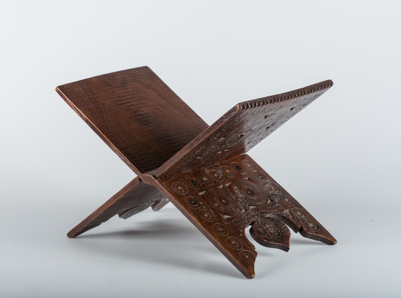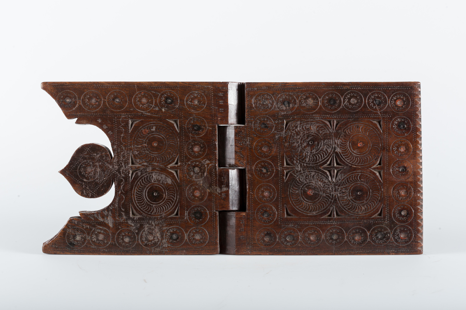 Afghanistan, XIX secolo . -. Cm 43,00 x 20,00. Leggio pieghevole intagliato con rosette e motivi circolari.