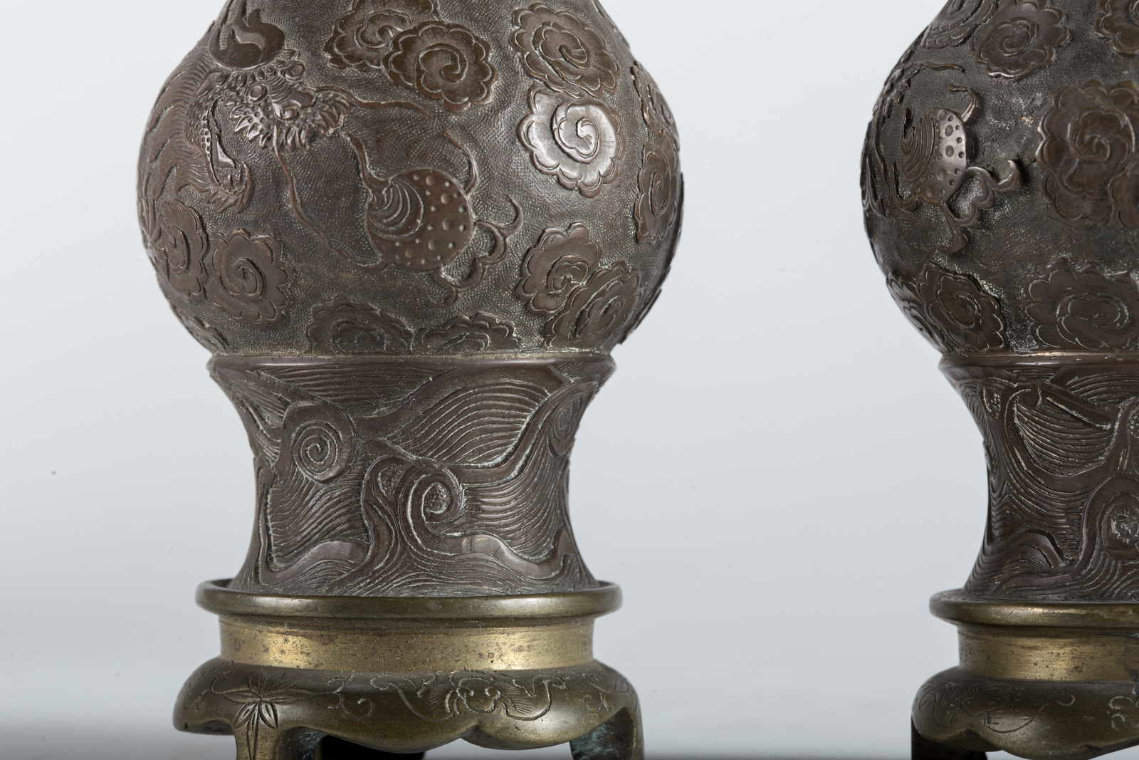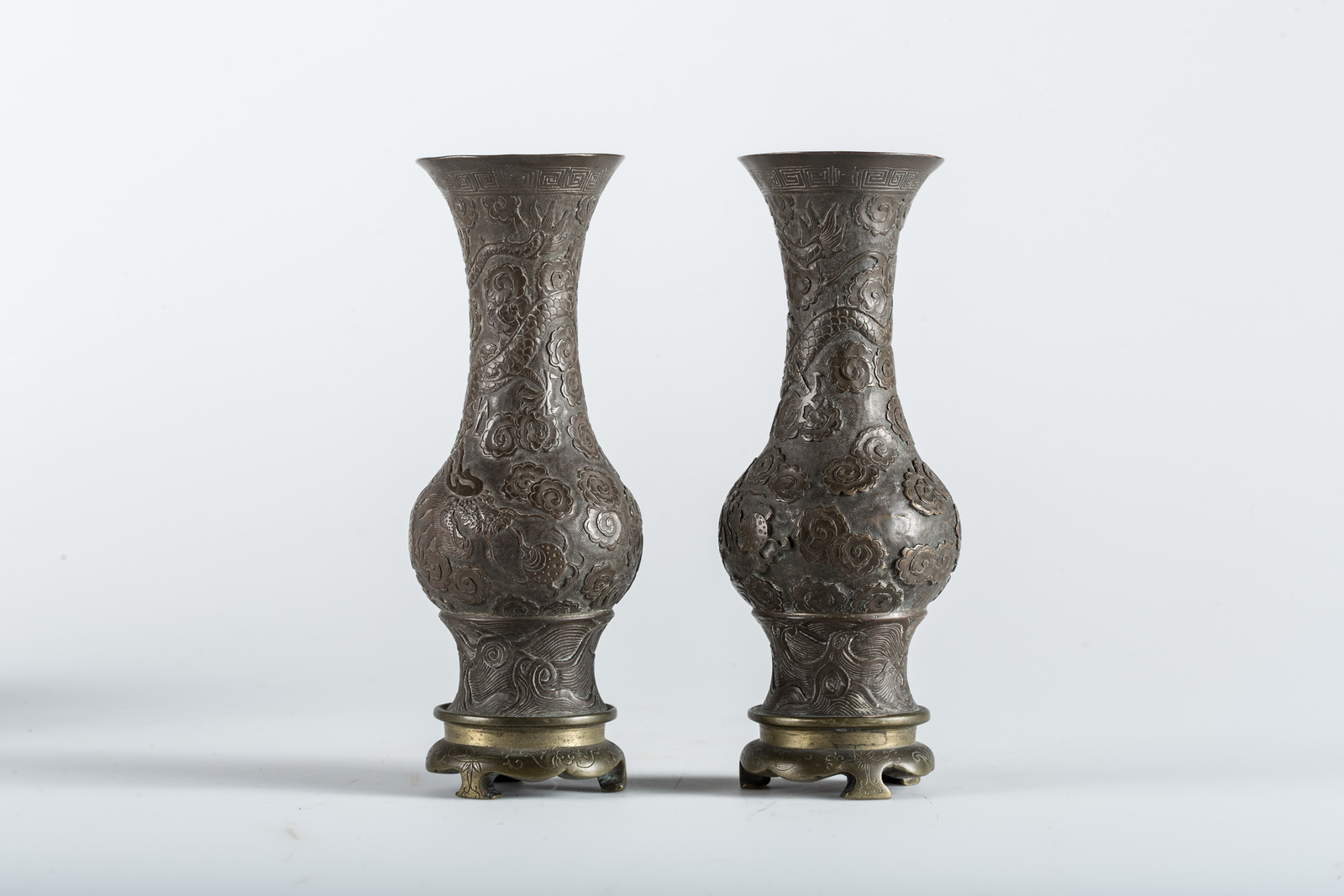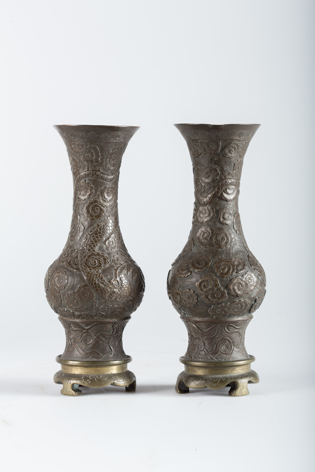 Arte Cinese A pair of bronze vases decorated with dragons chasing the flaming pearl among clouds