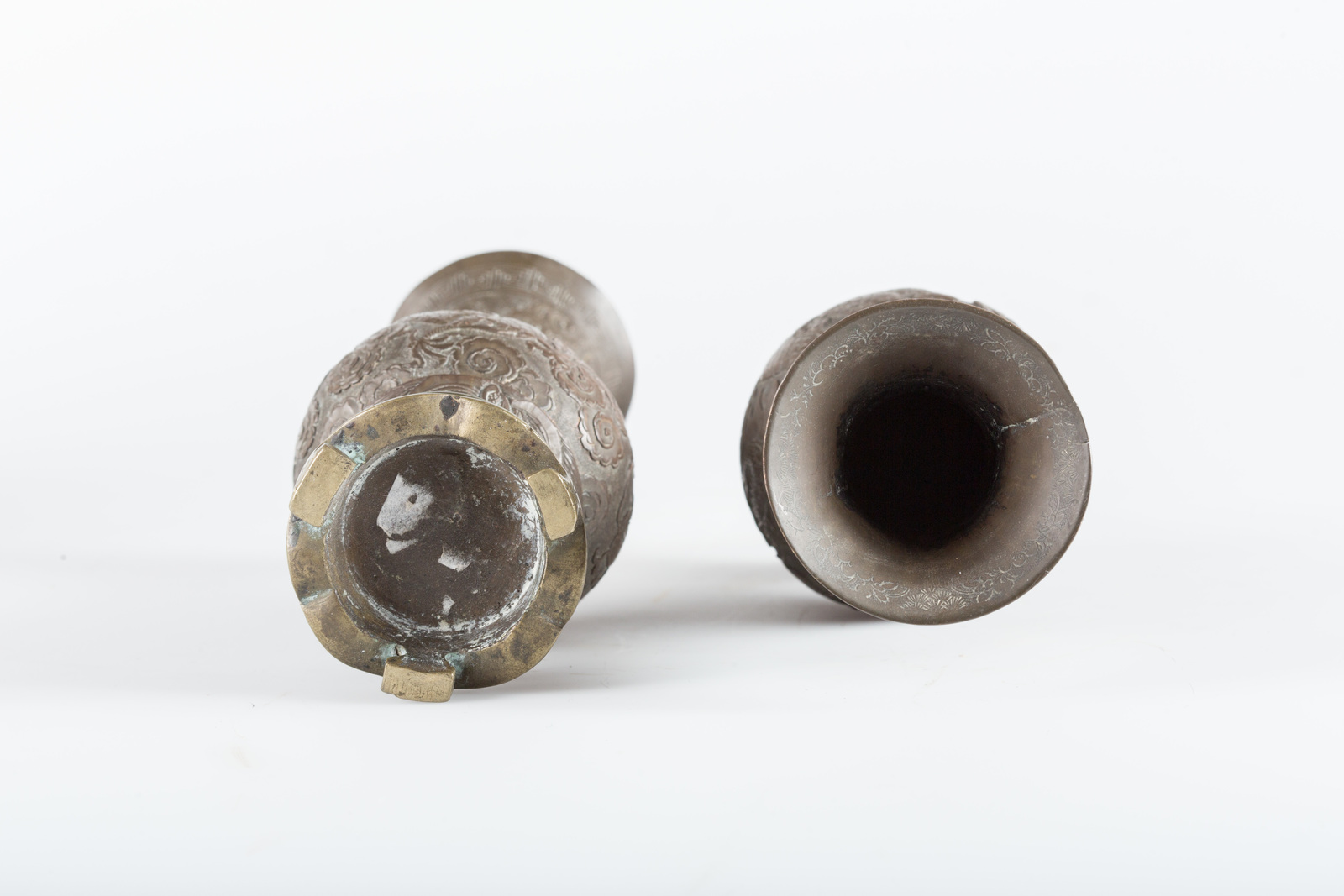Cina, dinastia Qing, XVIII - XIX secolo . -. Cm 6,00 x 18,00. Fusione in bronzo con base in bronzo dorato unita al corpo dell'oggetto profusamente inciso con dragoni e nuvole.