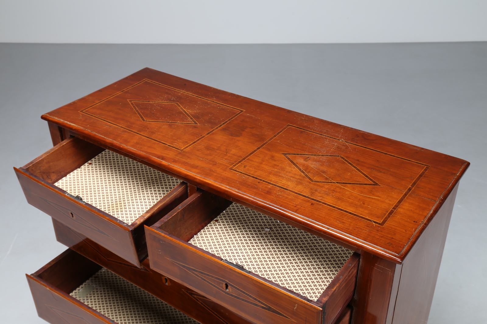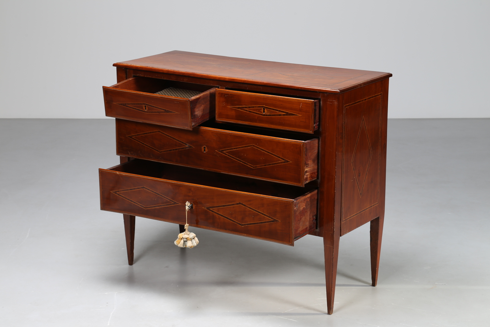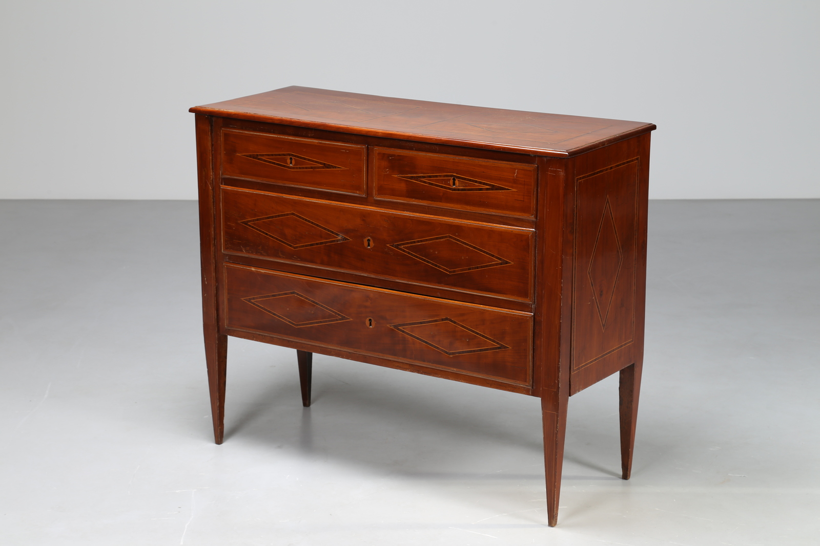MANIFATTURA ITALIANA DEL XVIII SECOLO Cassettone siciliano lastronato e filettato a due cassetti più due, gambe a piramide rovesciata. . Cm 122,00 x 101,50 x 49,00.