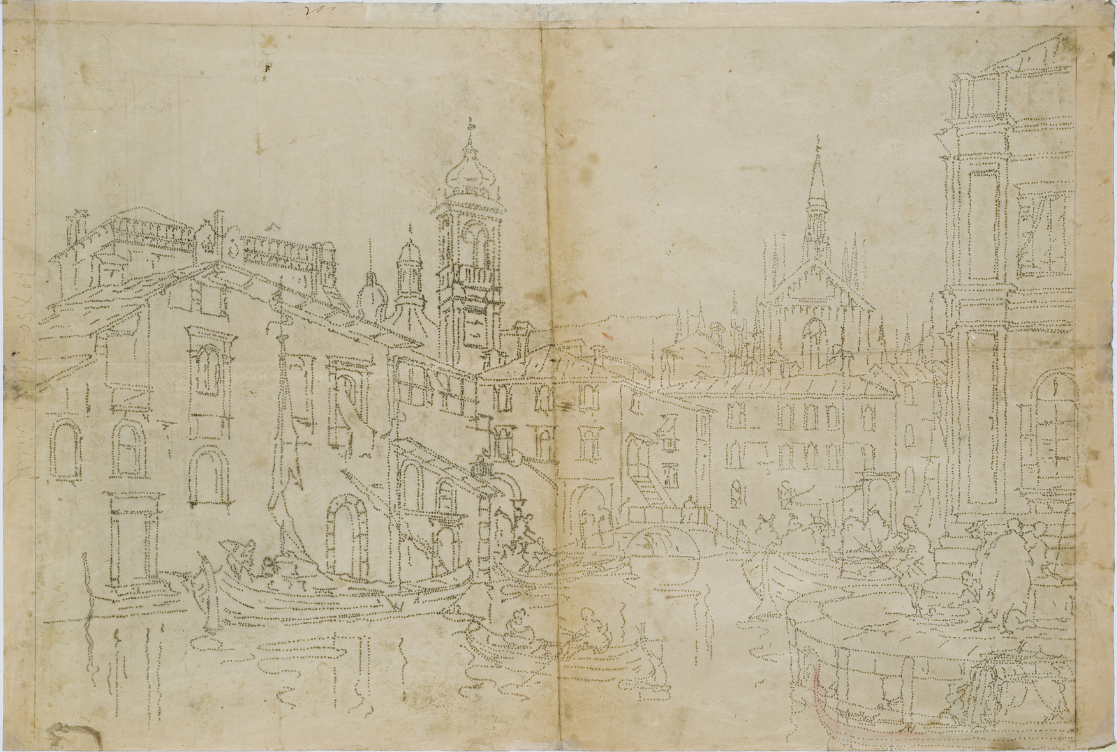 ARTISTA VENETO DEL XIX SECOLO Coppia di disegni allo spolvero raffiguranti Venezia. . Matita su carta. Cm 74,00 x 50,00. . Cornice presente