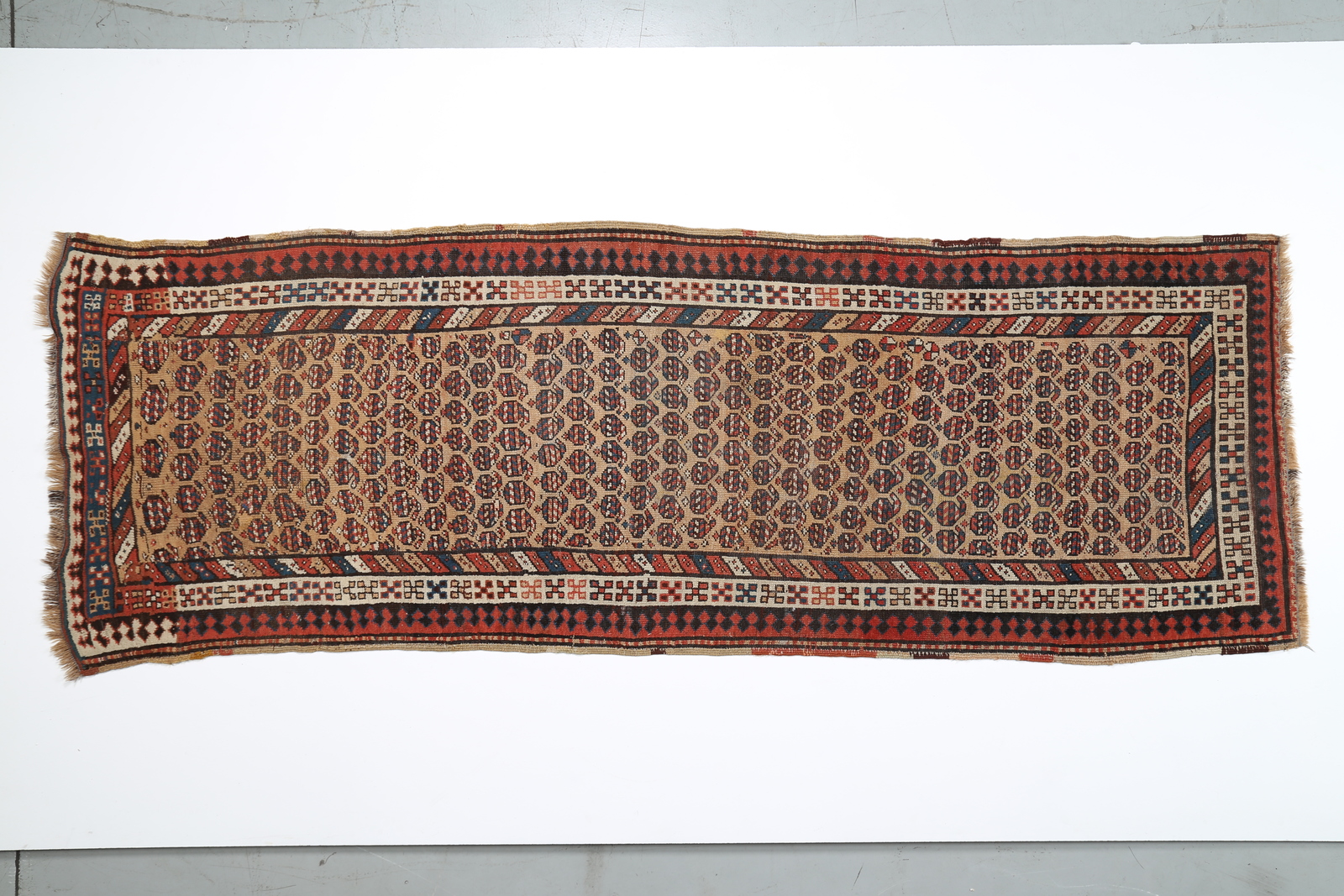 CURDISTAN Tappeto orientale. Persia Nord Occidentale. Lana e cotone. Cm 102,00 x 291,00. Fondo cammello bothé. Buono stato di conservazione. 1900 circa.
