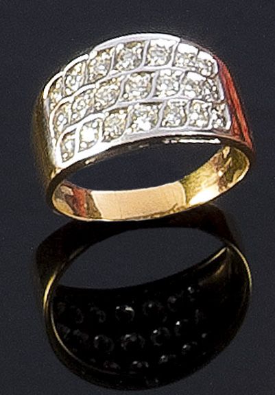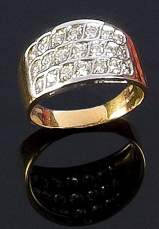 ANELLO Anello in oro giallo, a fascia, sommità in oro bianco con diamanti taglio brillante rotondo per complessivi ct 1,10 ca Peso gr 6,2 Misura 21,5