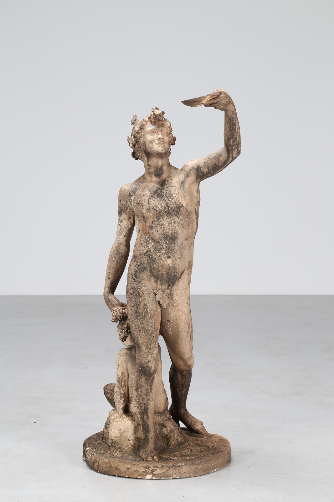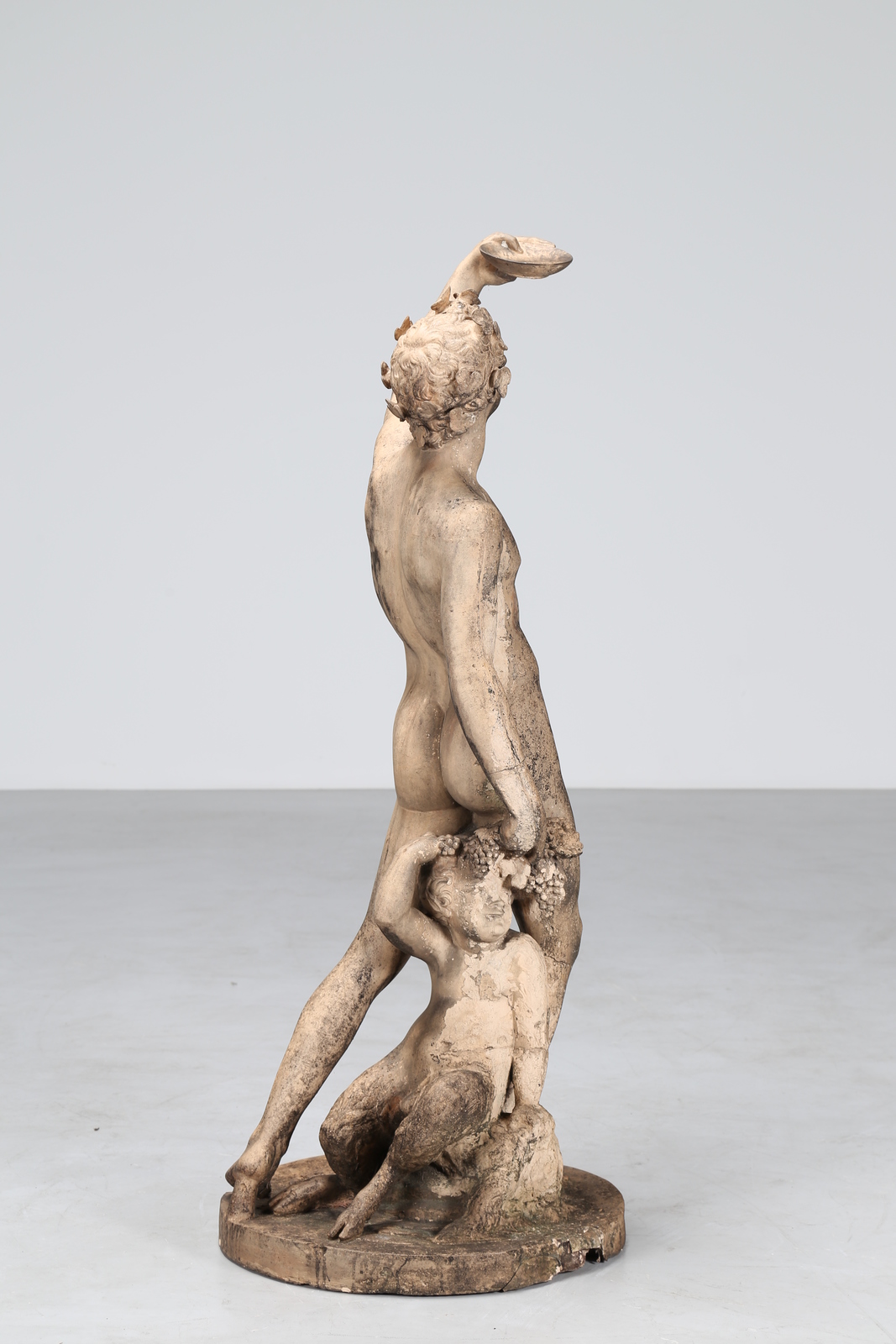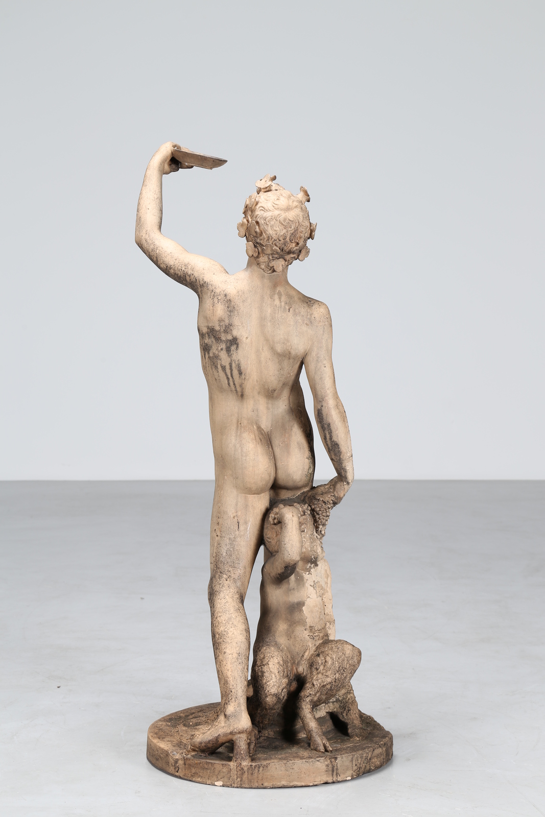 MANIFATTURA ITALIANA DELLA FINE DEL XIX SECOLO Statua da giardino in terracotta raffigurante Bacco e satirello. . Cm 48,00 x 134,00. Lievi cadute di materia in basso.