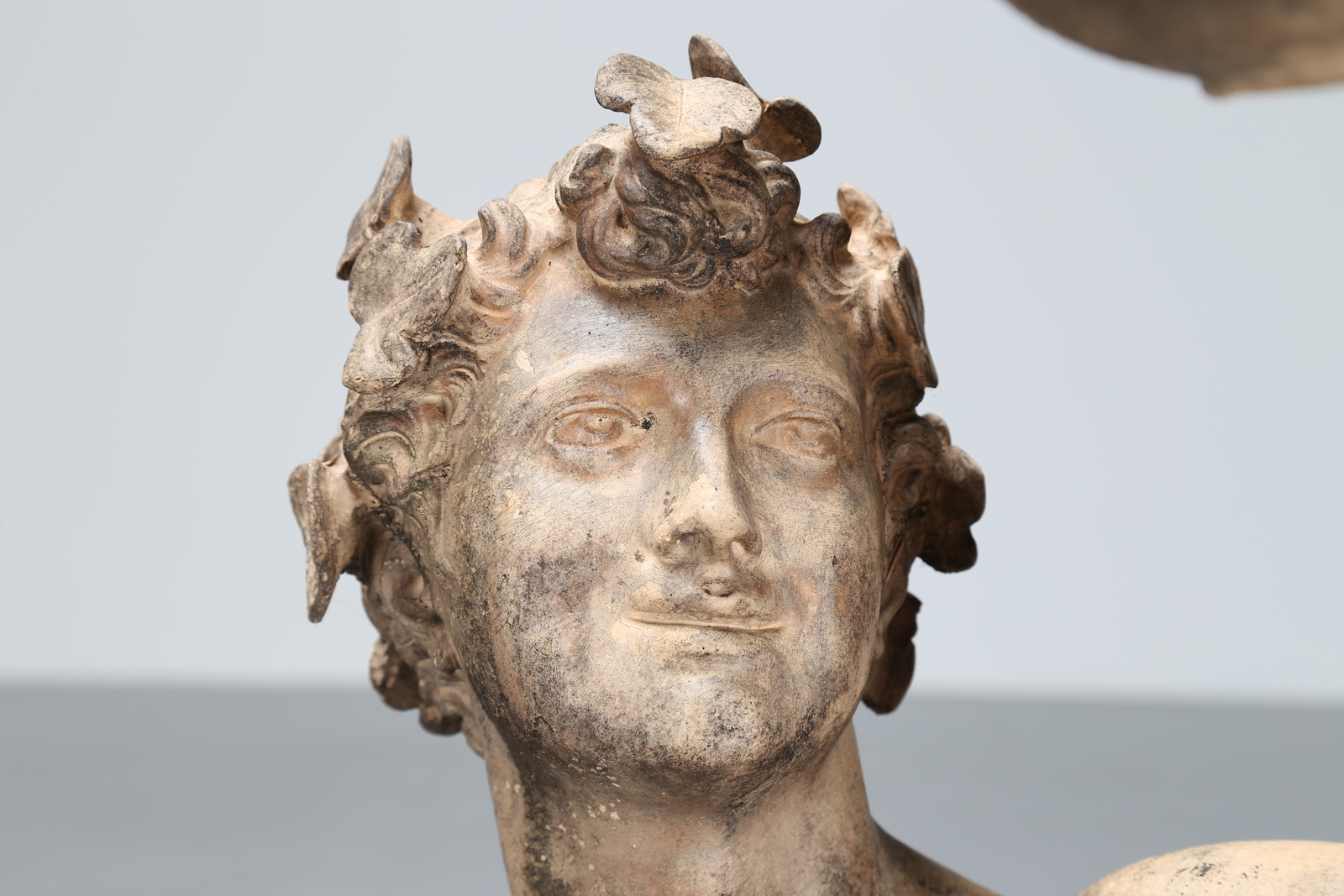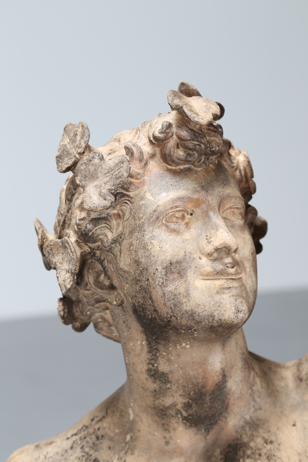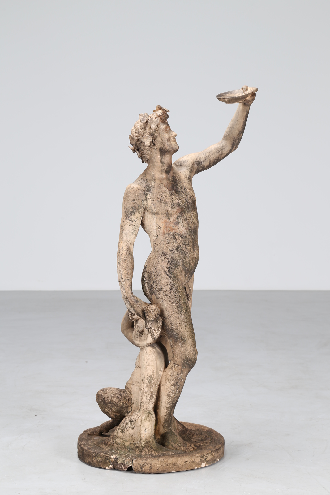 MANIFATTURA ITALIANA DELLA FINE DEL XIX SECOLO Statua da giardino in terracotta raffigurante Bacco e satirello. . Cm 48,00 x 134,00. Lievi cadute di materia in basso.