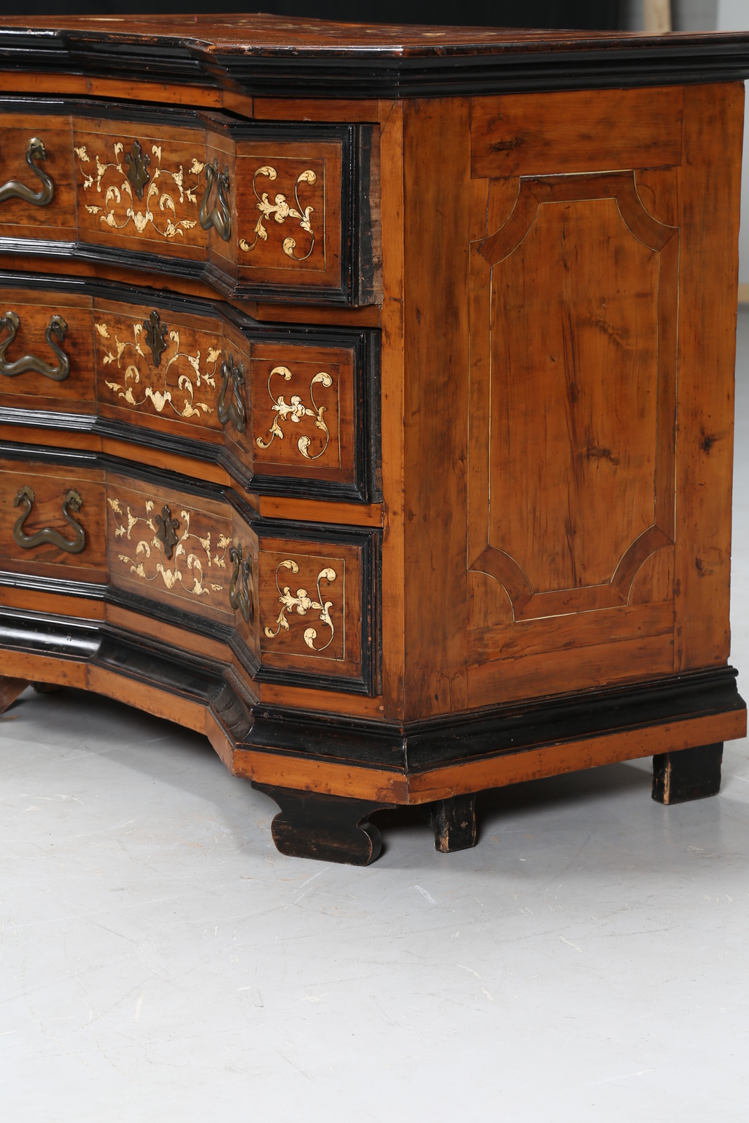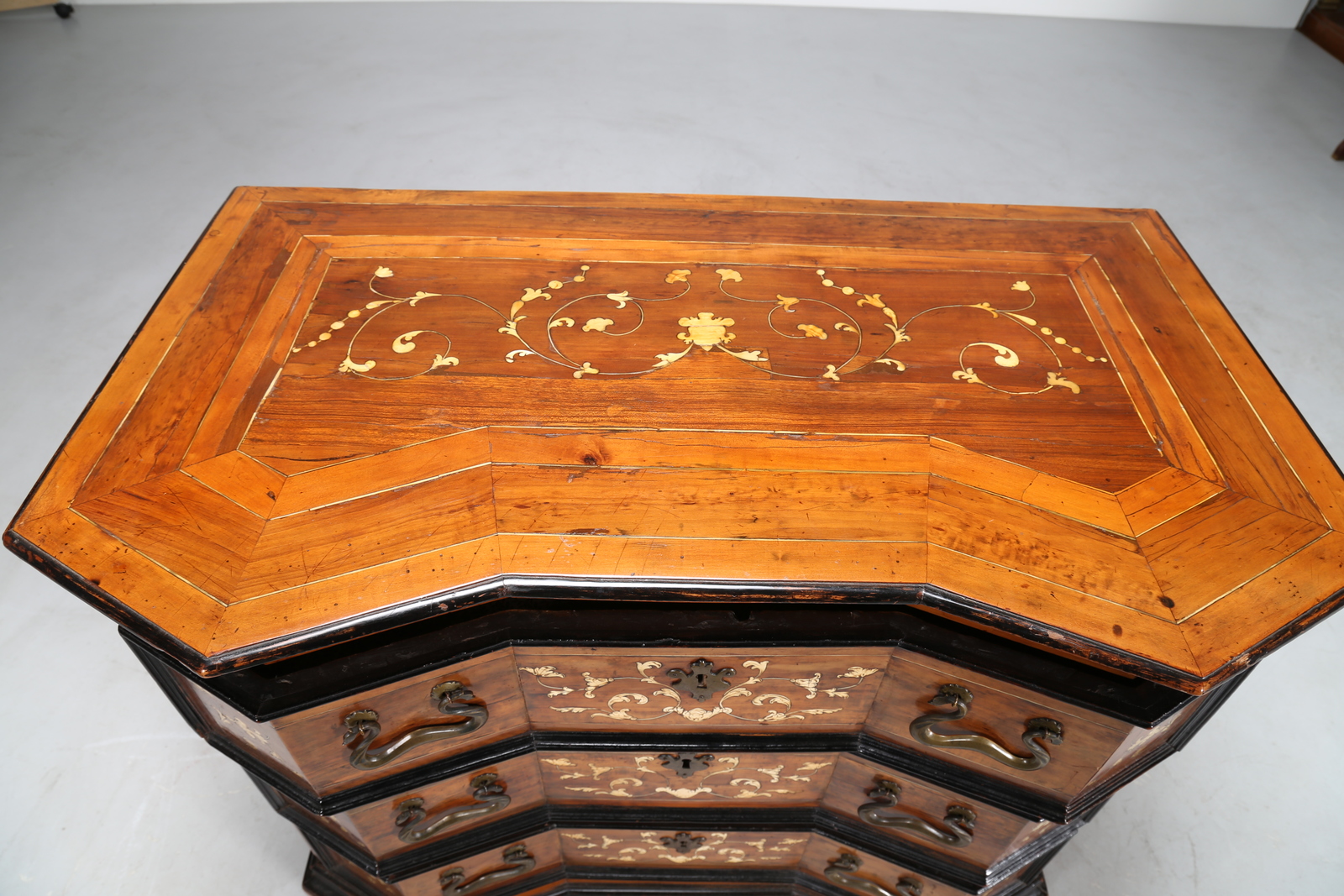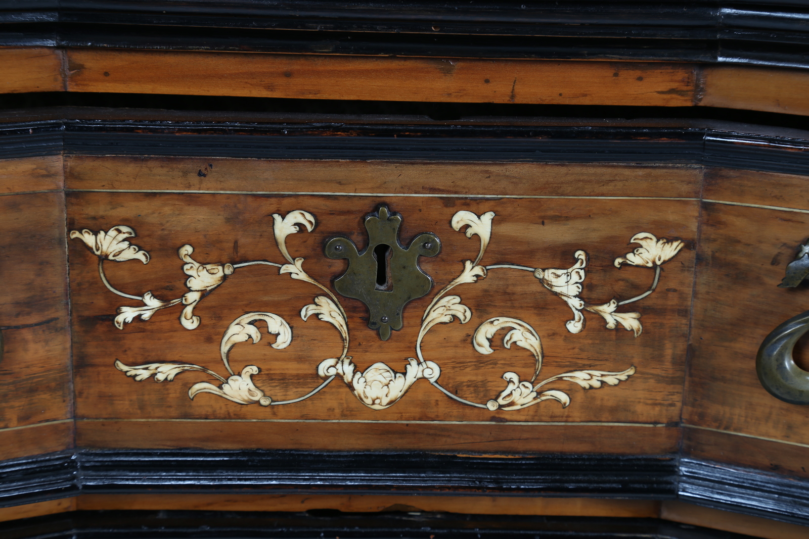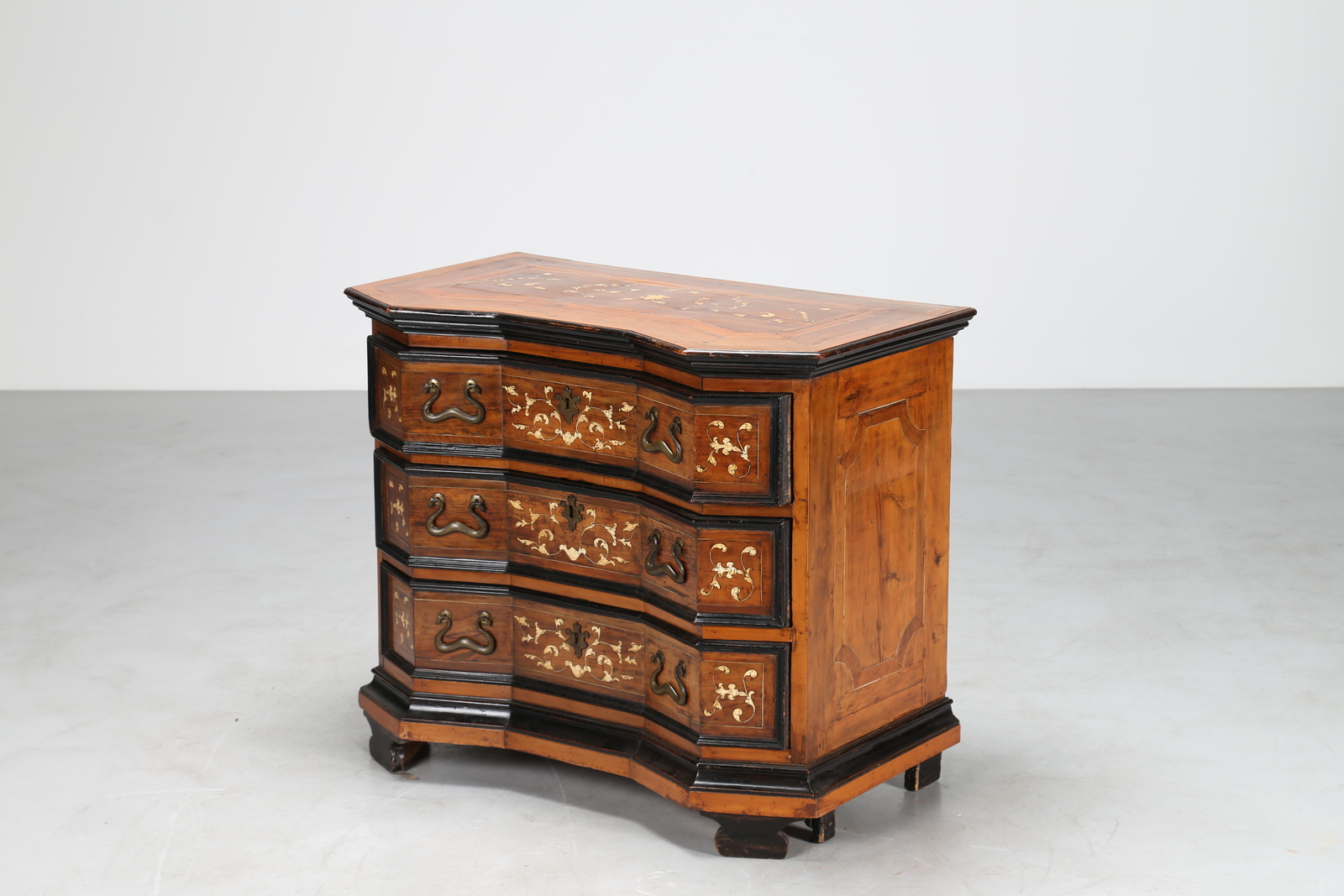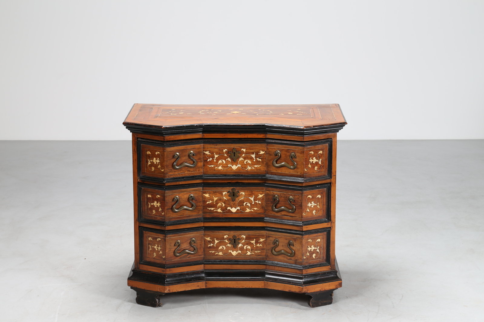 MANIFATTURA VENETA DEL XVII SECOLO Cassettone con intarsiato con inserti in avorio, a tre cassetti, mosso sul fronte. . Cm 103,00 x 88,00 x 60,00. Maniglie antiche.