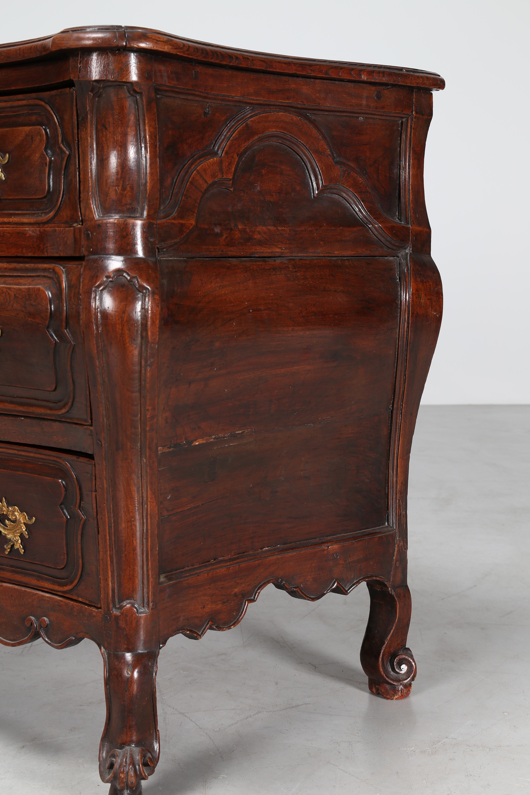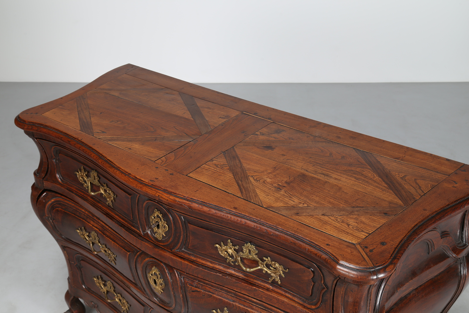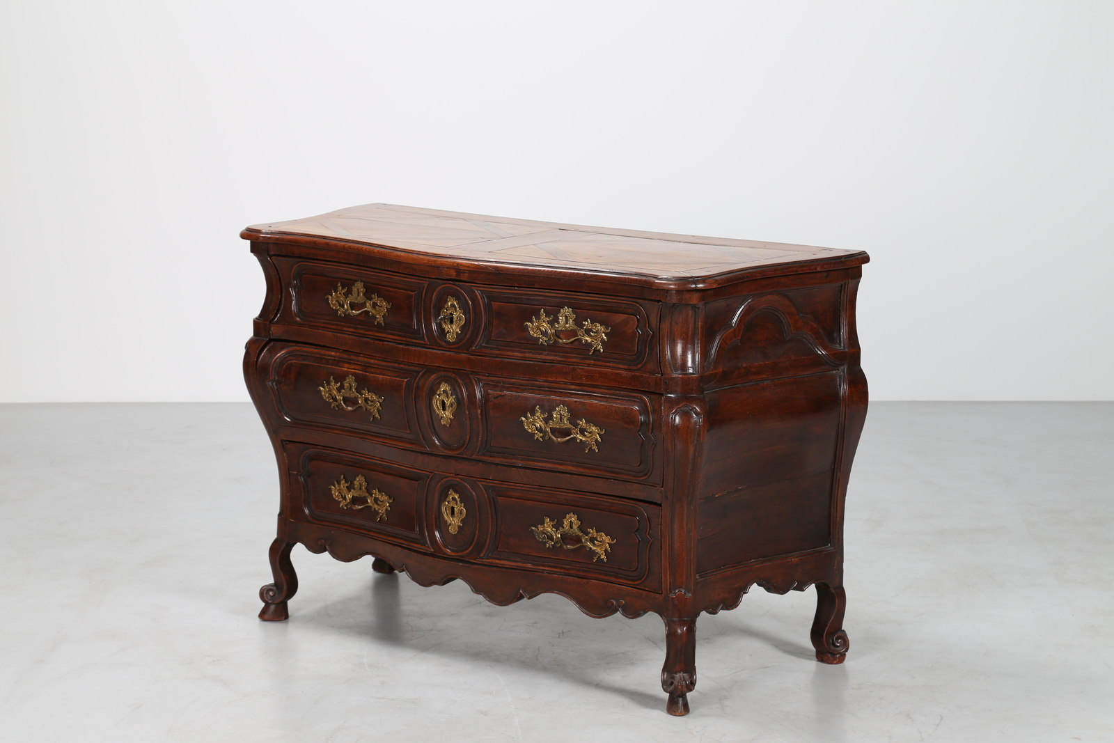 MANIFATTURA FRANCESE DEL XVIII SECOLO Cassettone francese a tre cassetti, mosso sul fronte e fianchi, maniglie in bronzo dorato. . Cm 153,50 x 100,00 x 67,00.