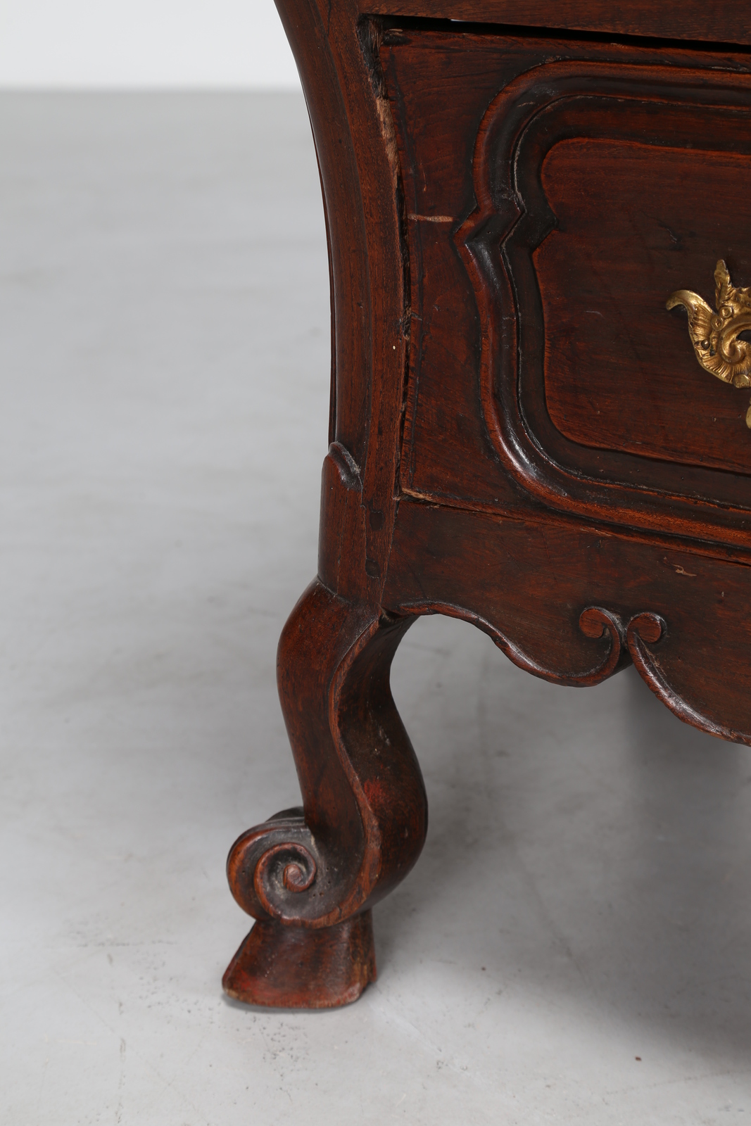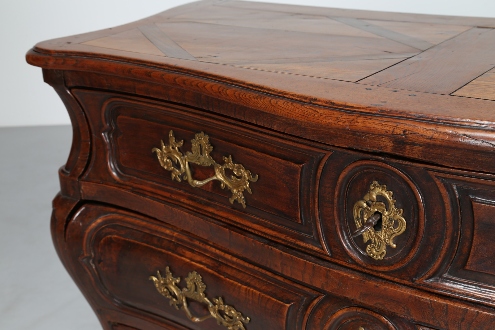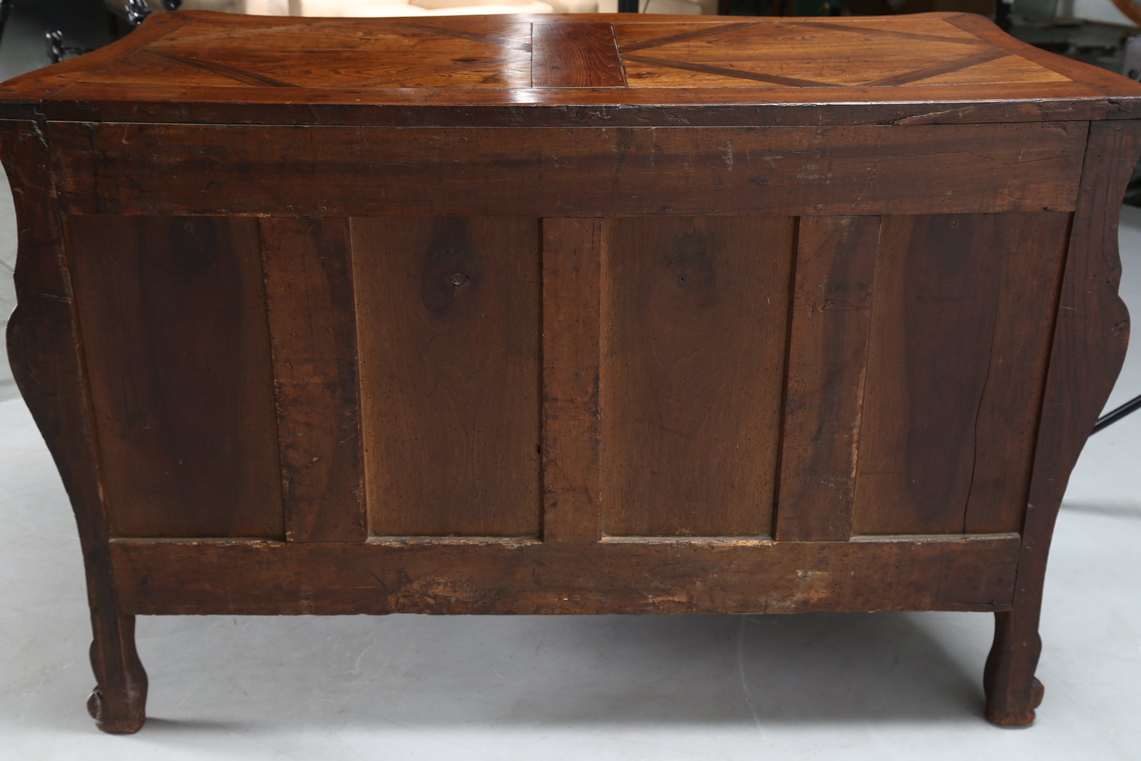 MANIFATTURA FRANCESE DEL XVIII SECOLO Cassettone francese a tre cassetti, mosso sul fronte e fianchi, maniglie in bronzo dorato. . Cm 153,50 x 100,00 x 67,00.