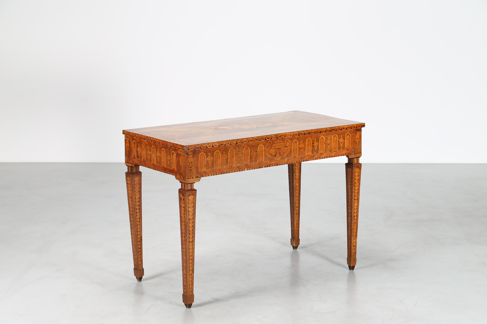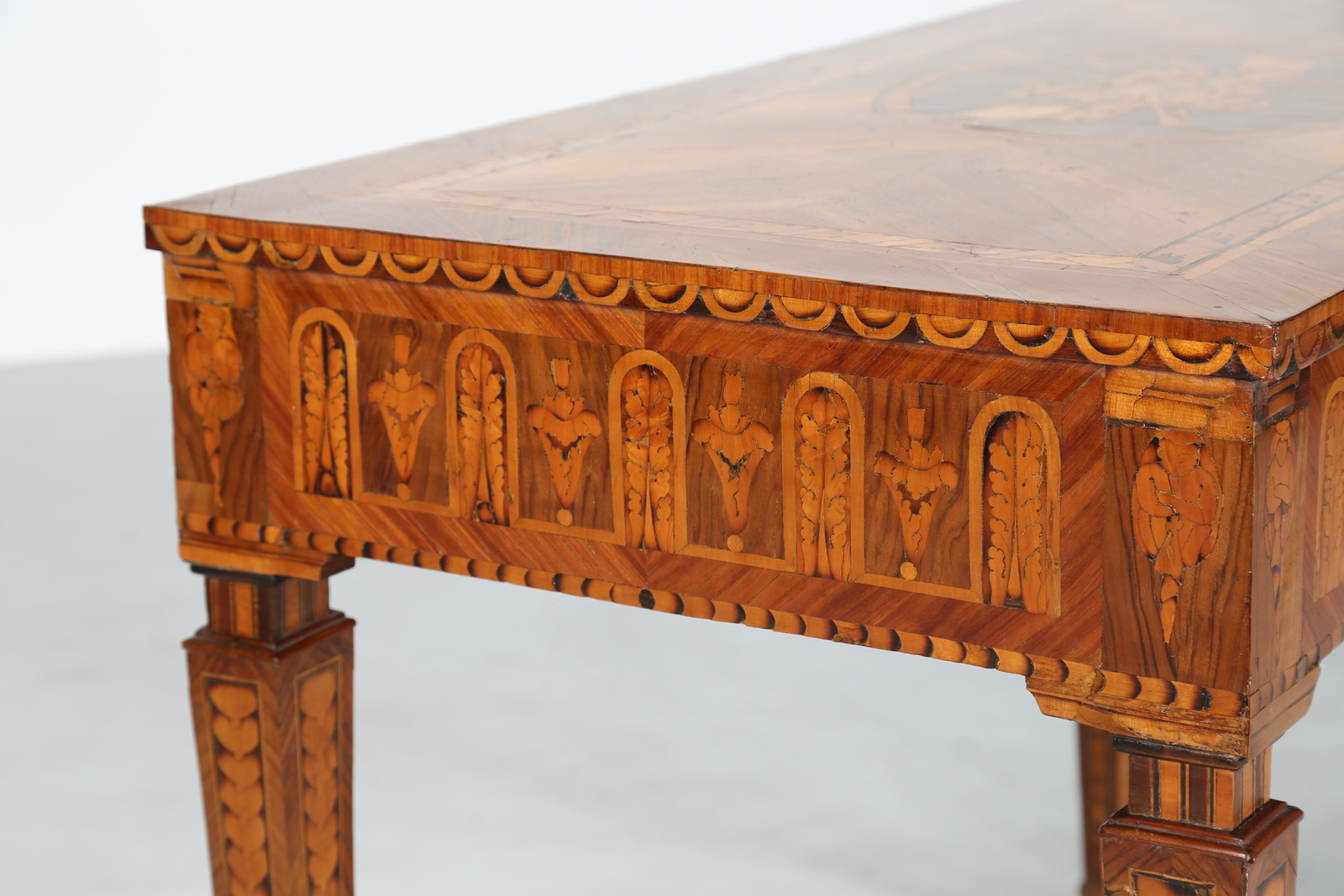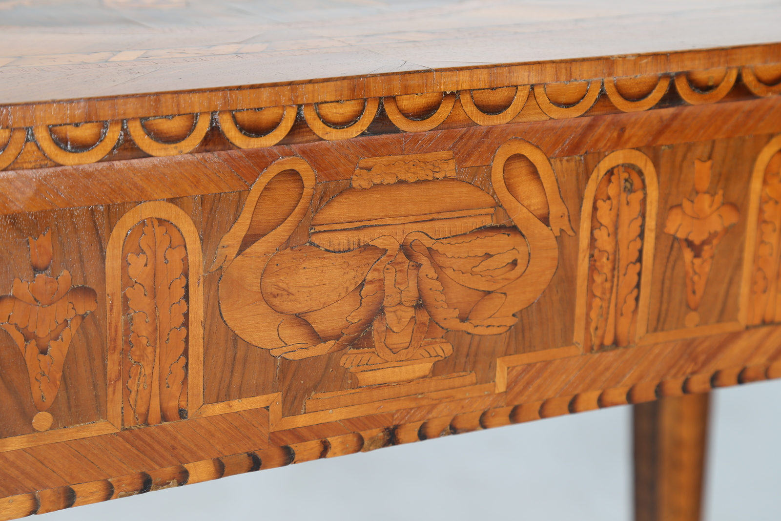MANIFATTURA LOMBARDA DELLA FINE DEL XVIII SECOLO Tavolo da muro lastronato in legni vari a motivi fogliacei, cariatidi, cigni e emblemi cavallerizzi in ovale al centro sul piano. Gambe rastremate con strozzatura sotto fascia. Firmato sul fondo "1783 Pietro Giovi Busnelli ( Busneri?) di Meda". . . Cm 119,00 x 84,00 x 59,50.