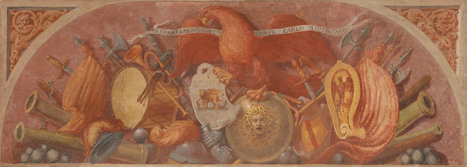 ARTISTA LOMBARDO DEL XVIII SECOLO Lunetta contenente trofei d'arme e un'aquila rossa con cartiglio. Affresco su tela. Cm 300,00 x 112,00. Sul cartiglio è scritto: "Appartamento del Conte Carlo Martinengo".
